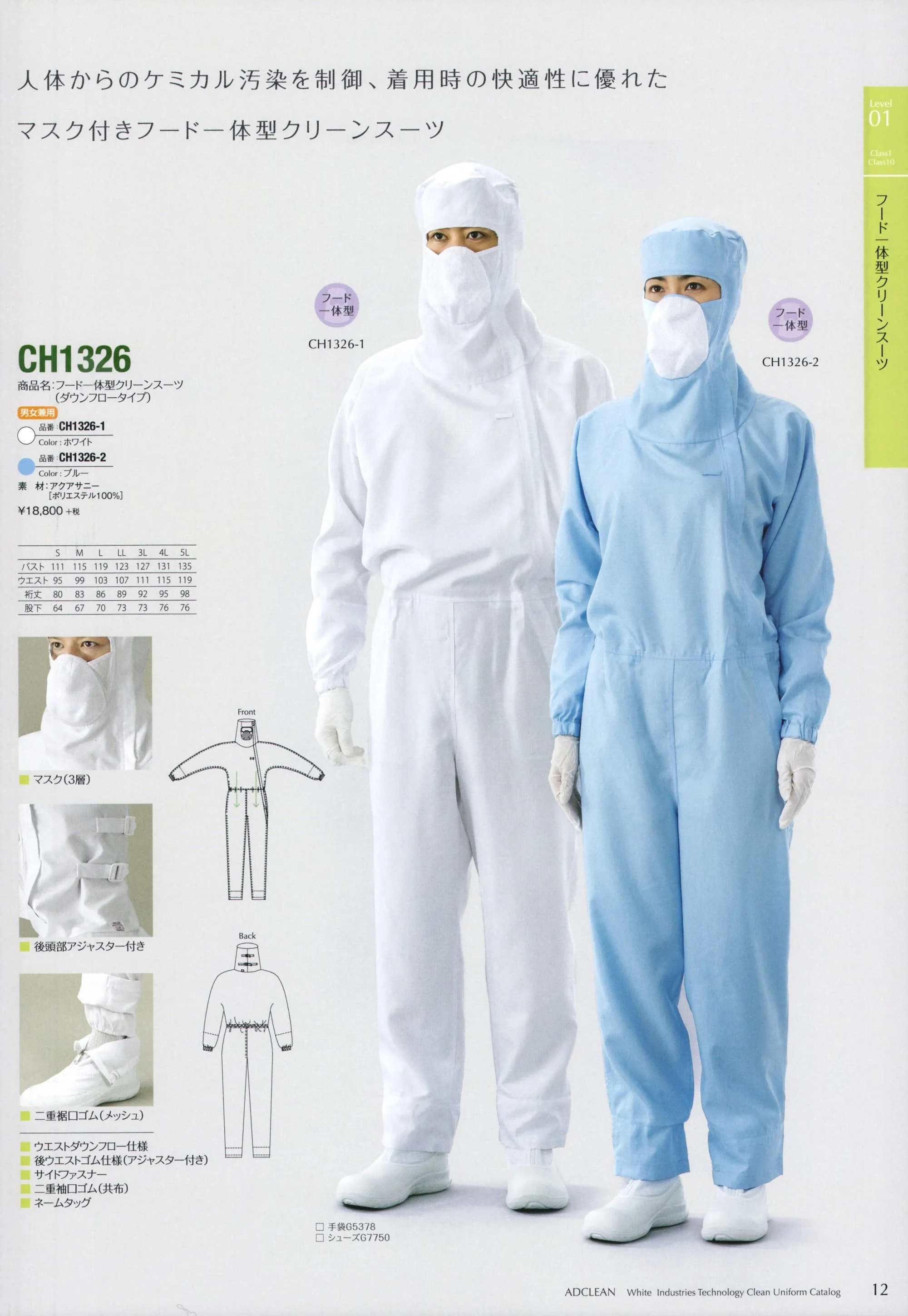 人体からのケミカル汚染を制御、着用時の快適性、着用後のセルフクリーニング効果を実現したマスク付きフード一体型クリーンスーツ。■フード後調整バックル付き