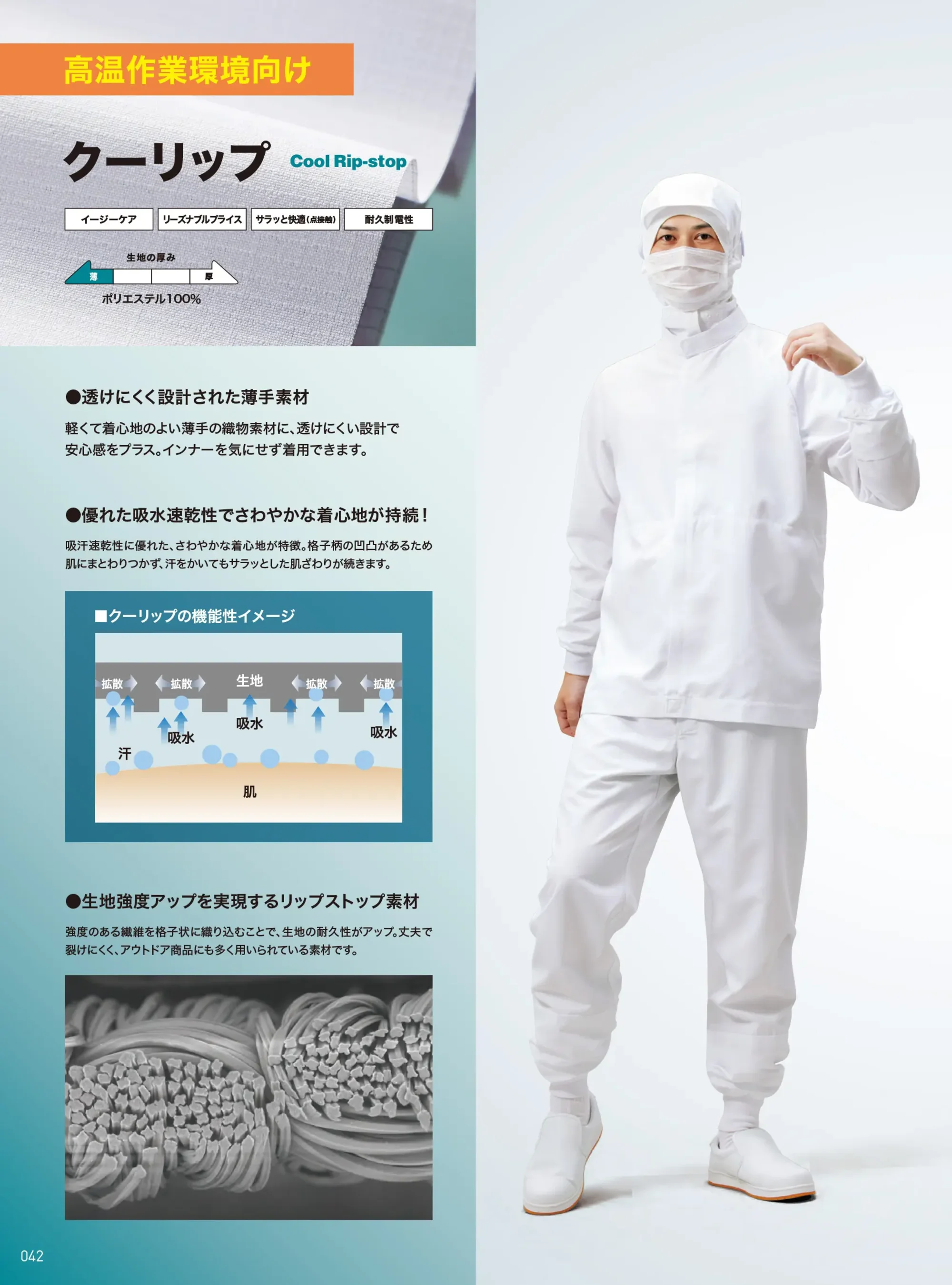 高温作業環境向け素材クーリップ(Cool Rip-stop)を採用した、フード一体型ブルゾンです。軽くてさわやかな着心地と耐久性を両立した薄手素材で、高温作業環境でも快適な作業環境をサポート。フード付き設計により異物混入対策にも配慮し、衛生管理が求められる現場に適した一着です。