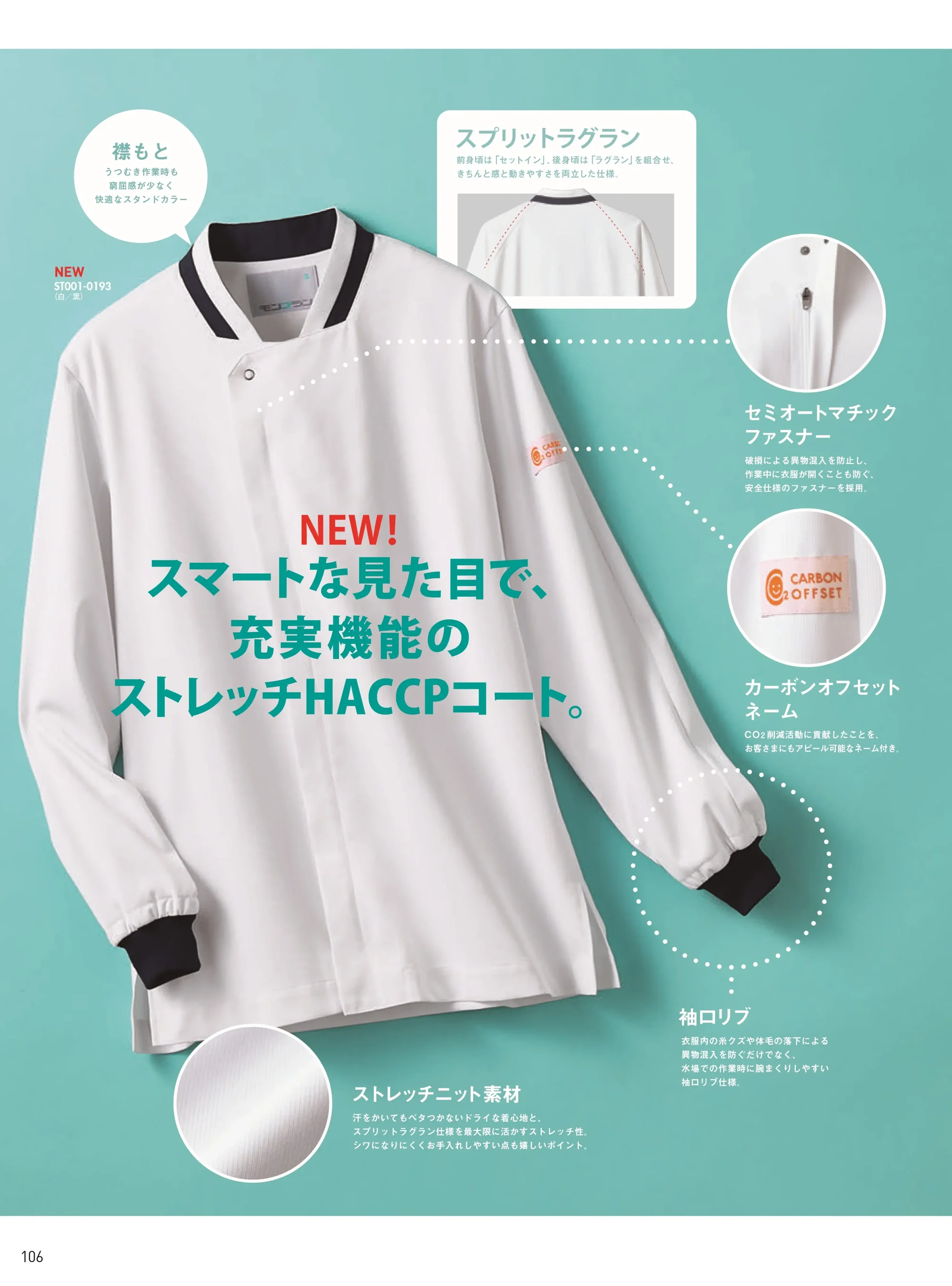 スーパーマーケットの厨房向けに開発されたストレッチHACCP対応コックコート。作業しやすいスマートなデザインに加え、異物混入防止の工夫を随所に採用し、日々の作業を快適かつ安心にサポートします。
