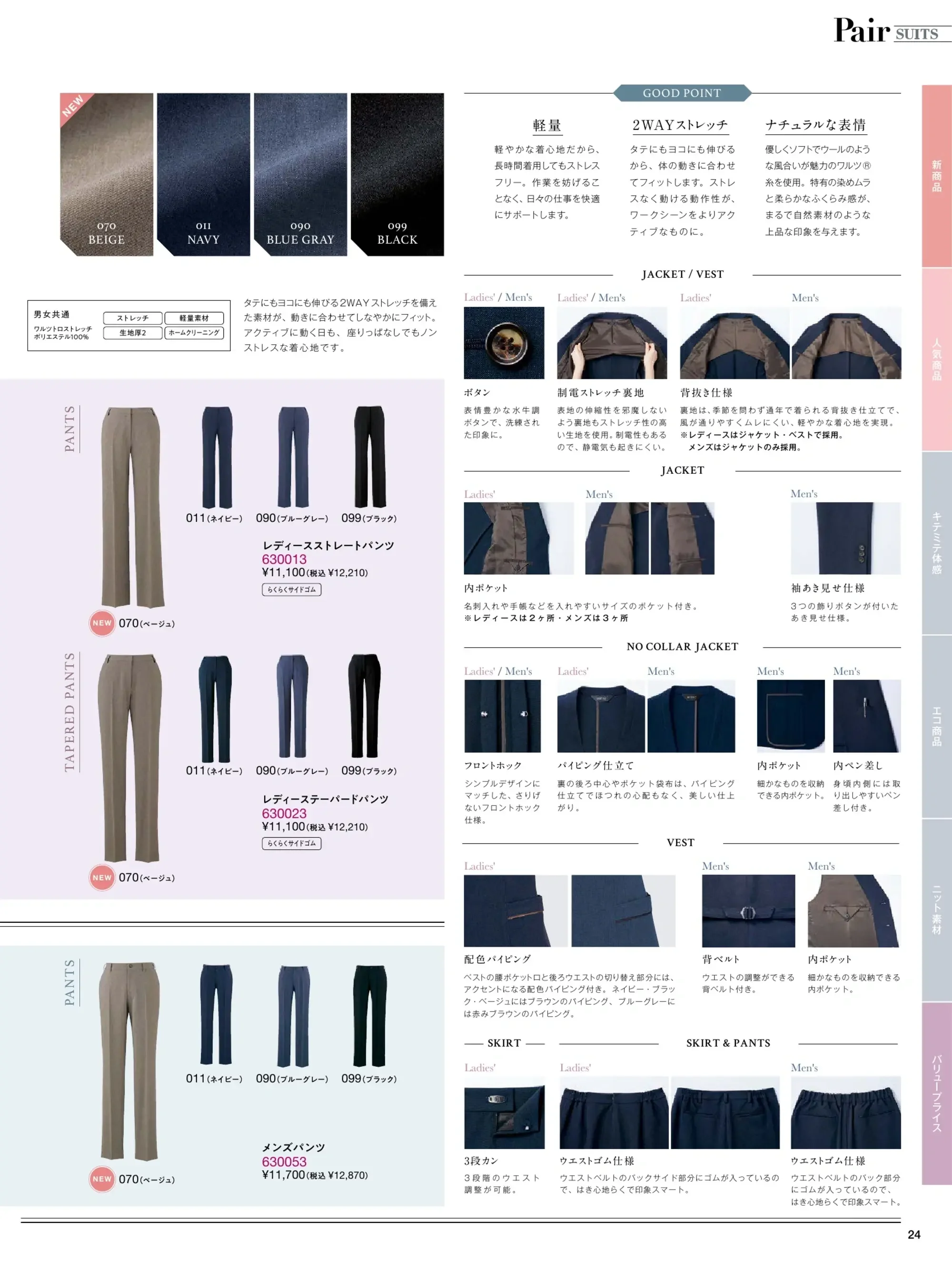 形状特長 | 静電ストレッチ裏地、両腰ポケット、ウエストゴム仕様、3段カン |