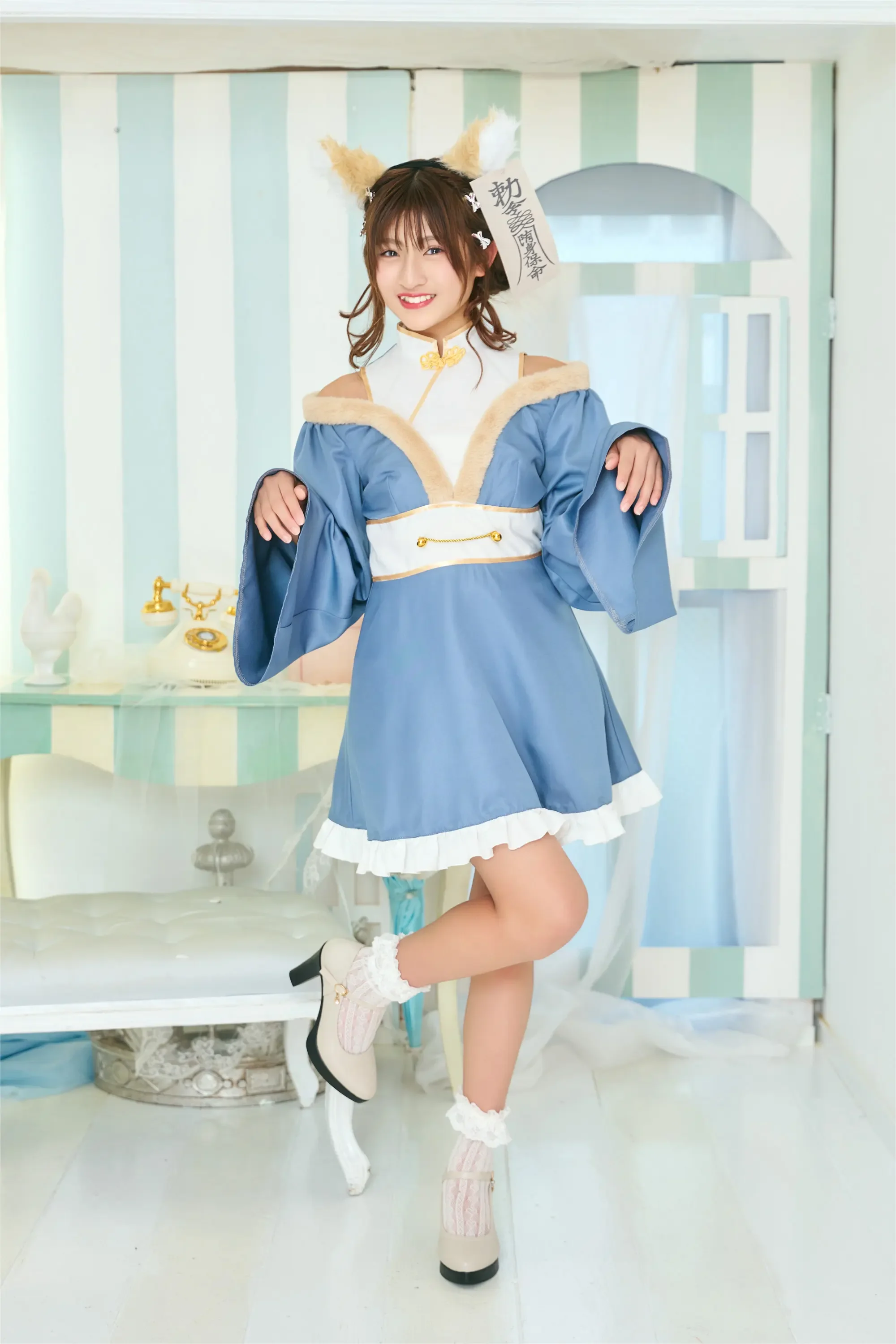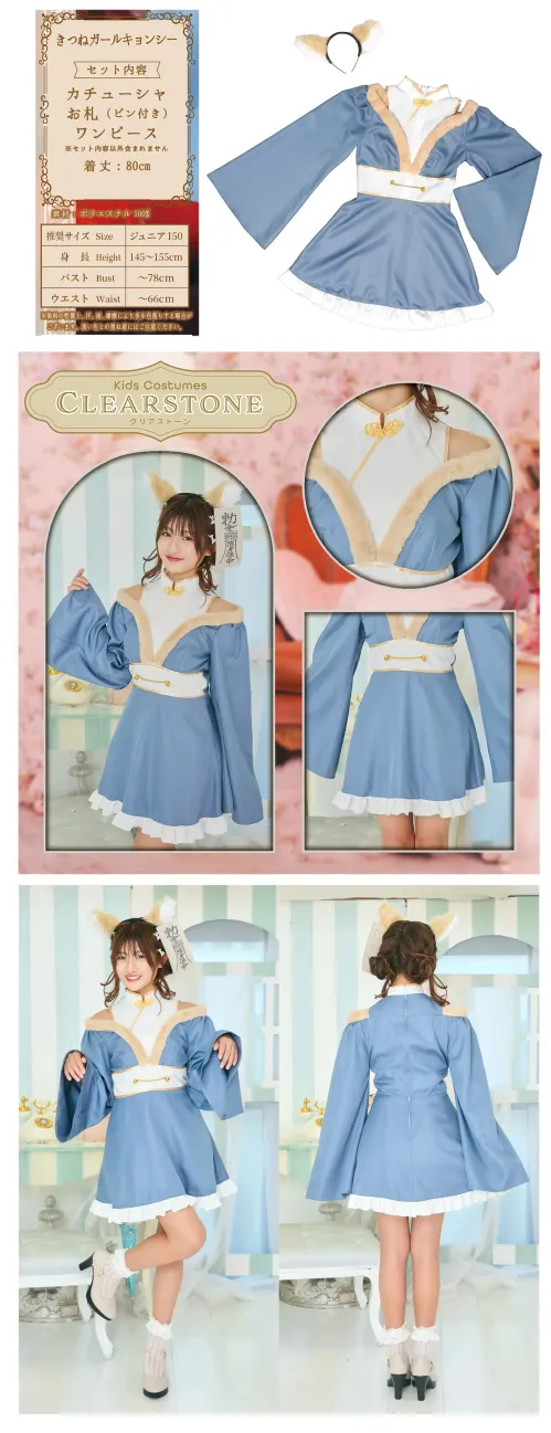 ジュニア向けコスチュームブランド「COSCHU!」。くすみブルーを基調に、きつねとキョンシーを掛け合わせたデザインのコスチュームです。長毛ファーを使用したリアルなきつね耳がアクセントとなり、独特の世界観を演出します。肩がのぞくファー使いが程よい抜け感を加え、ウエスト部分はコルセット風の切り替えでスタイルをすっきり見せます。ふんわり広がるスカートで可愛らしさもプラス。お札パーツはピンで着脱可能な仕様で、アレンジの幅も広がります。和風ホラーをテーマにしたハロウィンや撮影イベントなど、幅広いシーンで着用いただけます。