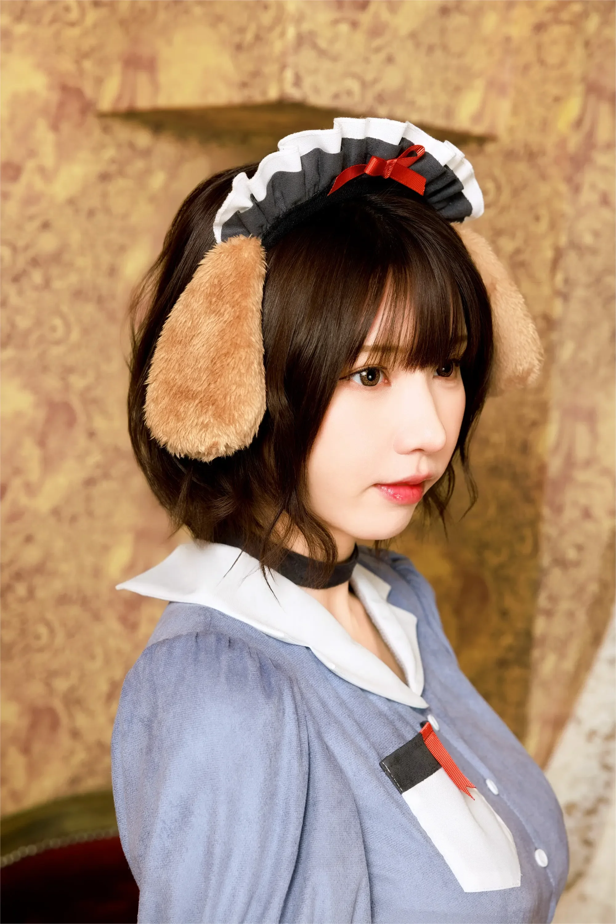 グレイッシュトーンを基調とした暖かみのある雰囲気の「ダスティコンフィ」シリーズ。近年根強く人気なグレイッシュトーン(くすみカラー)をベースに、肌寒いハロウィン時期にもぴったりな秋らしいスエード素材を取り入れました。くすみサックスにレッドが映える犬×ダイナーのコスチューム。耳とカフスは、もこもこのボア素材を使用。コルセット風エプロンでウエストが細見えします。スカートのサイドの編み上げデザインや骨型のワッペンがポイント。※モデルは撮影時にパニエを着用しています。