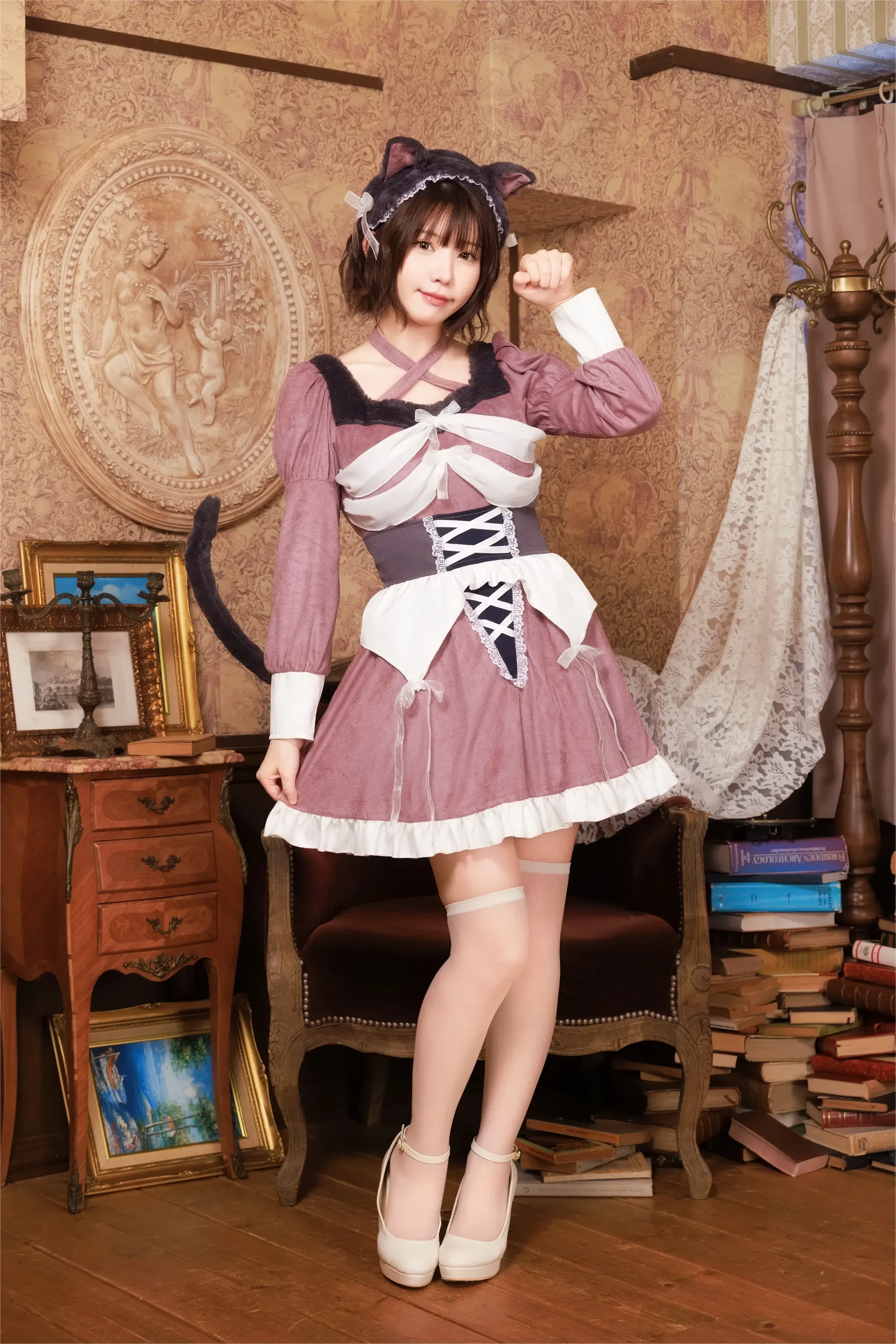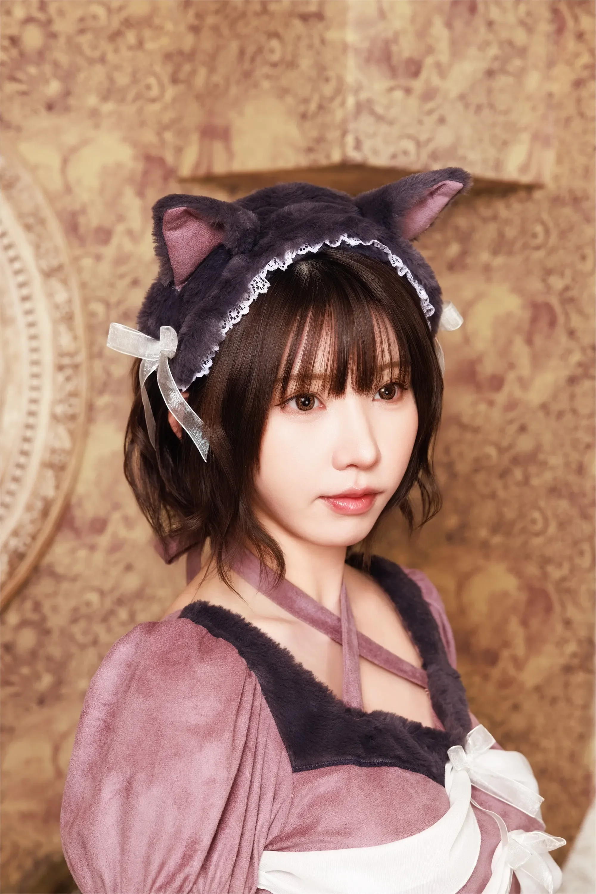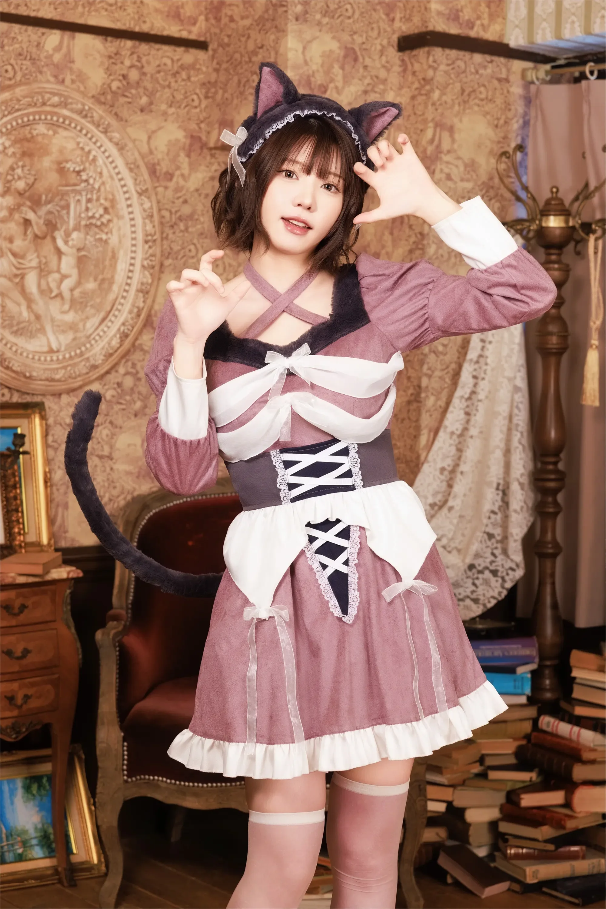 グレイッシュトーンを基調とした暖かみのある雰囲気の「ダスティコンフィ」シリーズ。近年根強く人気なグレイッシュトーン(くすみカラー)をベースに、肌寒いハロウィン時期にもぴったりな秋らしいスエード素材を取り入れました。モーブピンクがお洒落なネコ×スケルトン(骸骨)のコスチューム。肋骨をイメージしたシフォンのドレープがポイント。コルセットでウエストが細見えします。クロスホルターネックが華奢見えを叶え、顔まわりも華やかに演出します。ボリュームのある猫耳カチューシャは、ヘッドドレス風の存在感があり、安定感のあるカチューシャ仕様で装着しやすくなっています。長袖デザインで肌寒い時期の屋外イベントにも適しています。※モデルは撮影時にパニエを着用しています。