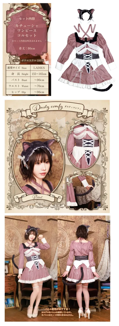 形状特長 | 【セット内容】カチューシャ、ワンピース、コルセット、しっぽ【メイン部分の長さ(着丈等)(cm)】80cm【開き】背中心ファスナー |