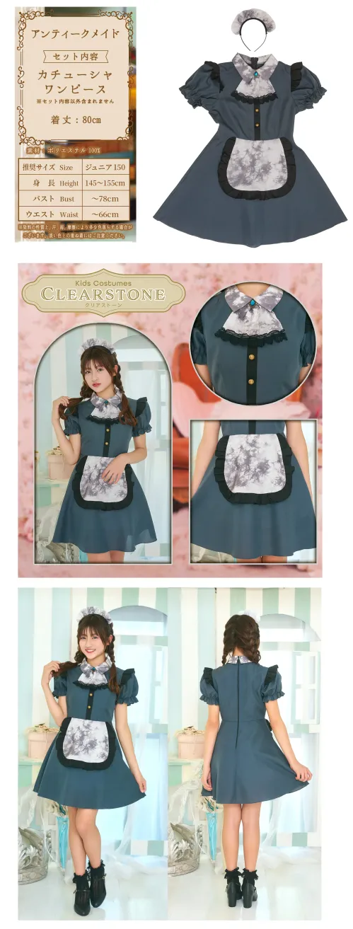 ジュニア向けコスチュームブランド「COSCHU!」。古い洋館に仕えるメイドをモチーフにしたクラシカルなコスチューム。青みがかったくすみグリーンの生地が印象的なカラーリングです。黒のレースとフリルをふんだんに使用し、重厚感のあるデザインに仕上げました。ジャボとエプロンにはオリジナルの汚れ風プリント生地を採用し、アンティークな雰囲気を演出します。ジャボにはエメラルドグリーンの装飾石、胸元にはアンティークゴールド調のボタンをあしらい、細部までこだわった仕様です。袖は大きめのパフスリーブでシルエットにアクセントを加えます。ハロウィン、撮影イベントなどさまざまなシーンで活躍します。