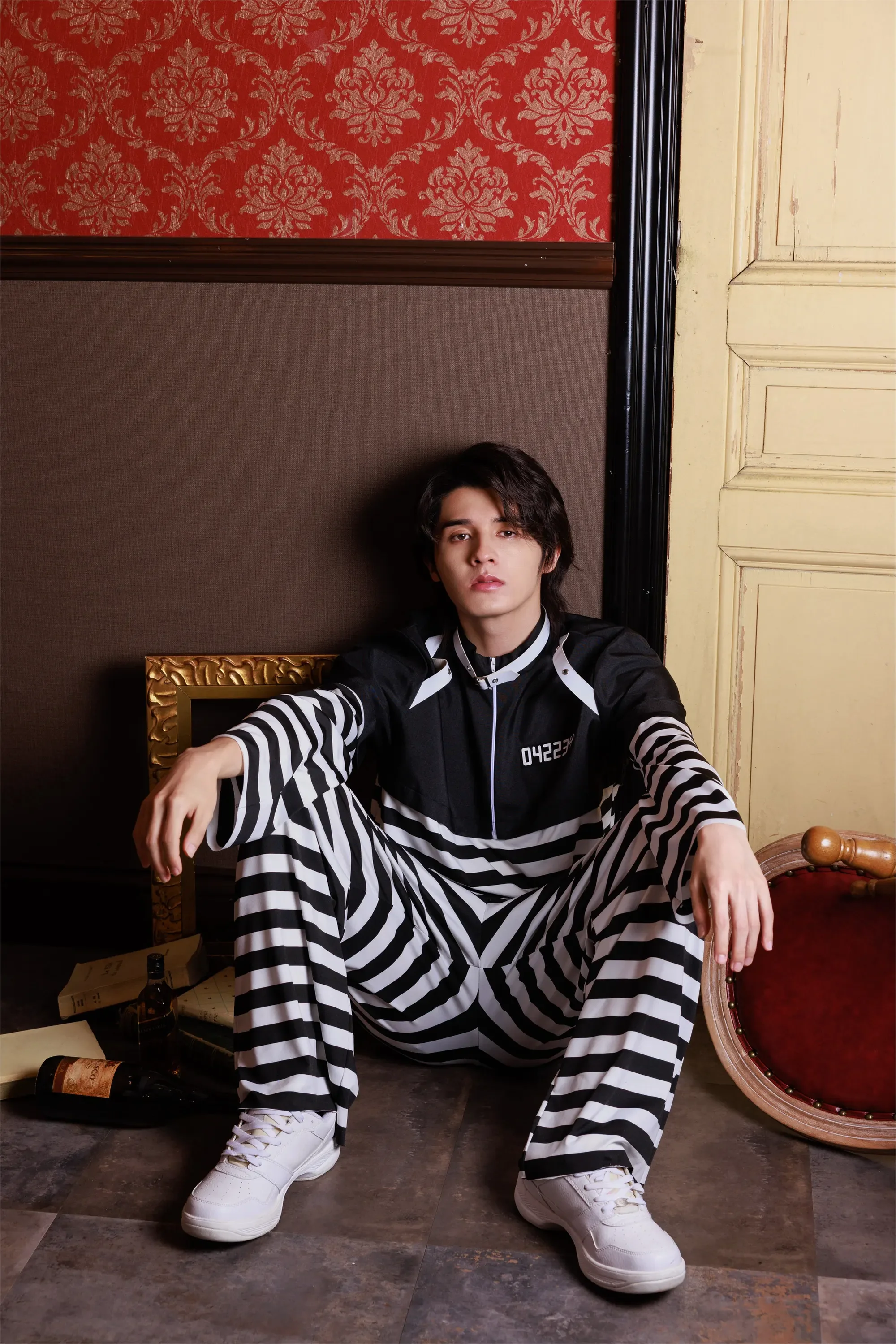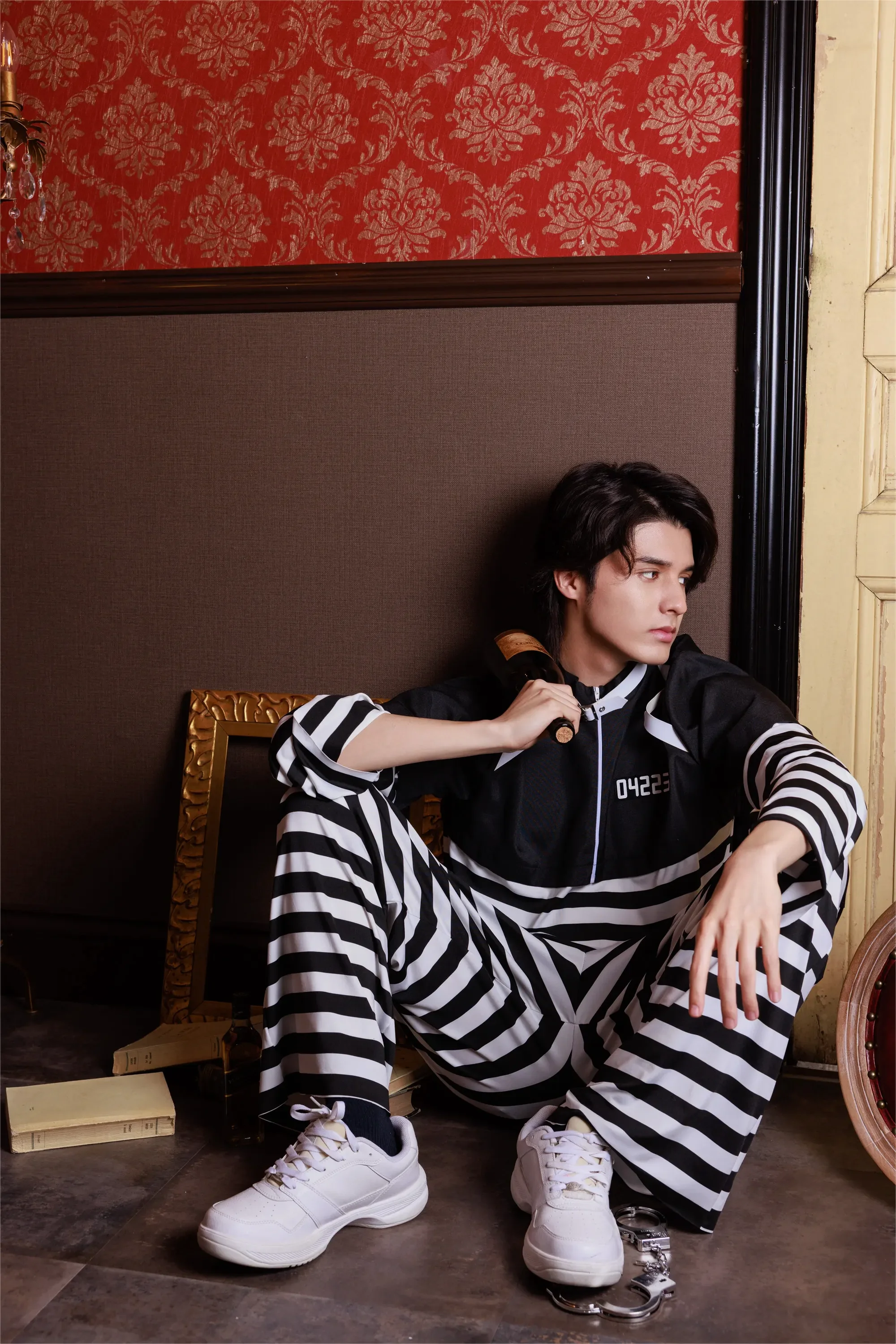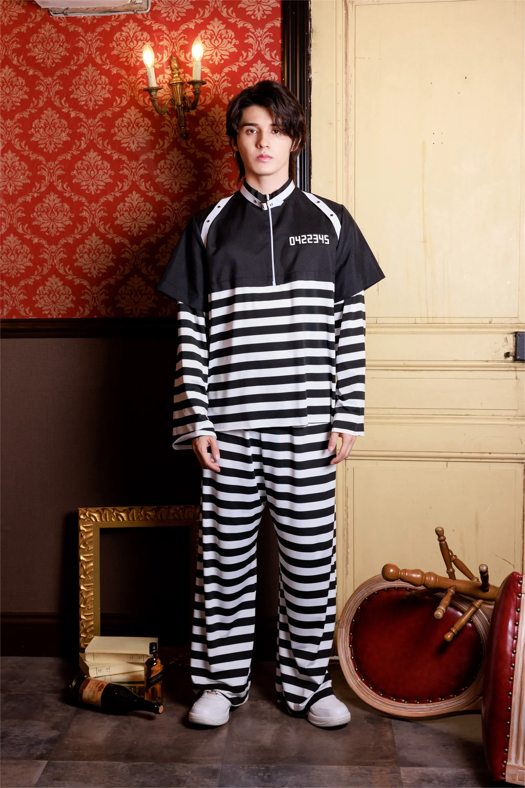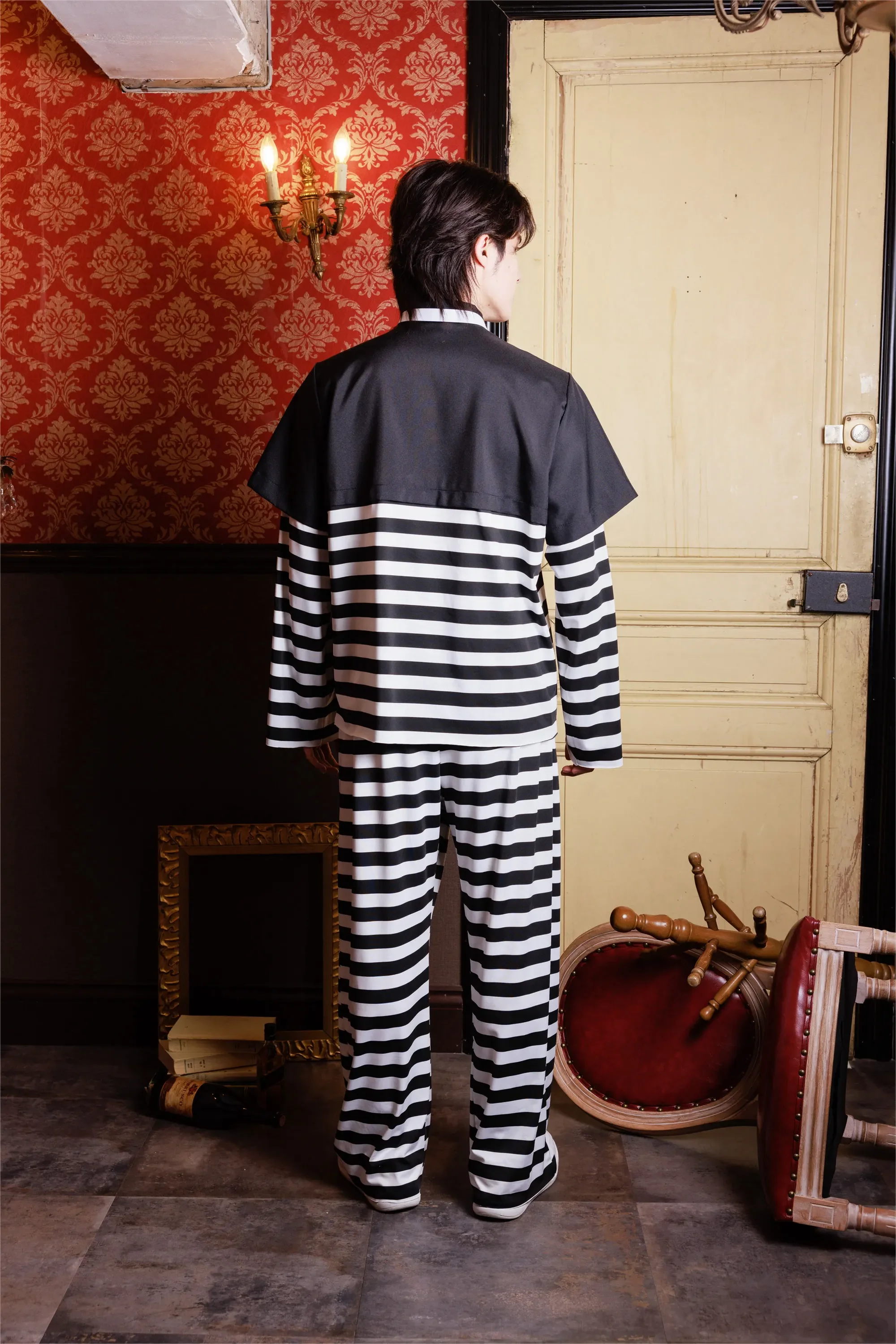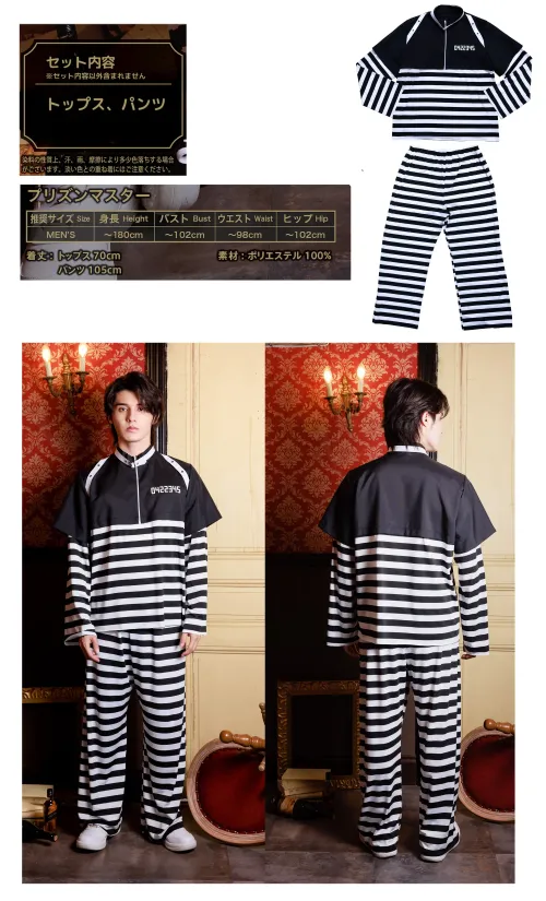 ハロウィン仮装の定番、囚人のメンズコスチューム。全身ボーダーのセットアップにアパレル風のレイヤード(重ね着)感を楽しめるカジュアルスタイル。白の合皮素材を使用した拘束風ベルトがアクセントとなり、ハードな印象を演出。生地にはツヤ感のあるストレッチ素材を使用しており、軽やかな着心地と動きやすさを両立しています。ゆったりとしたサイズ感で体型を選ばず着用できます。