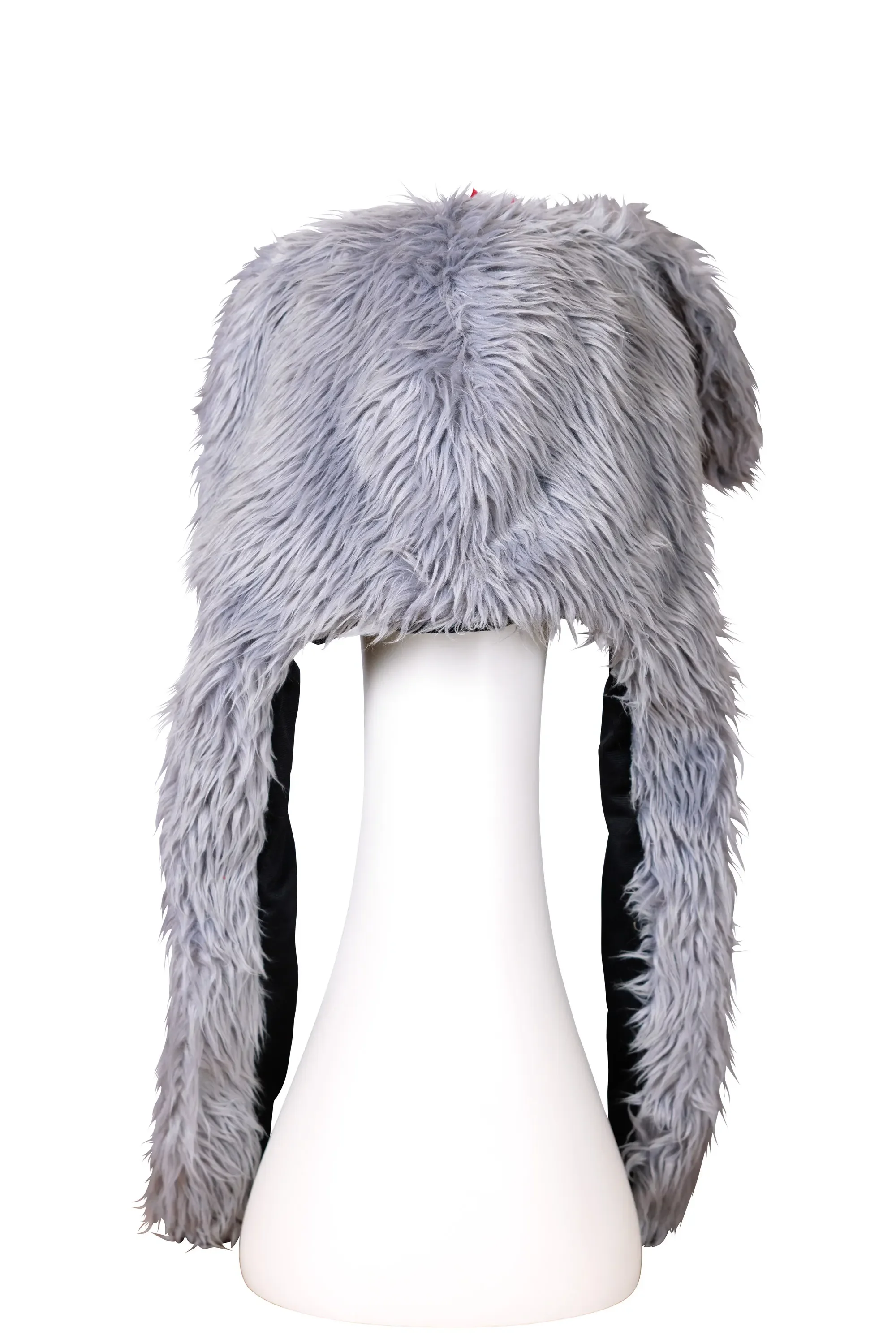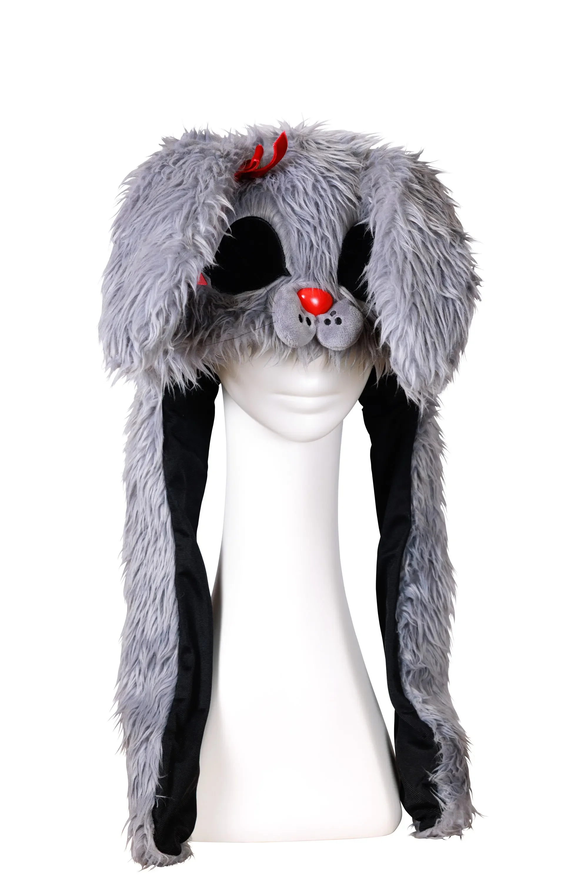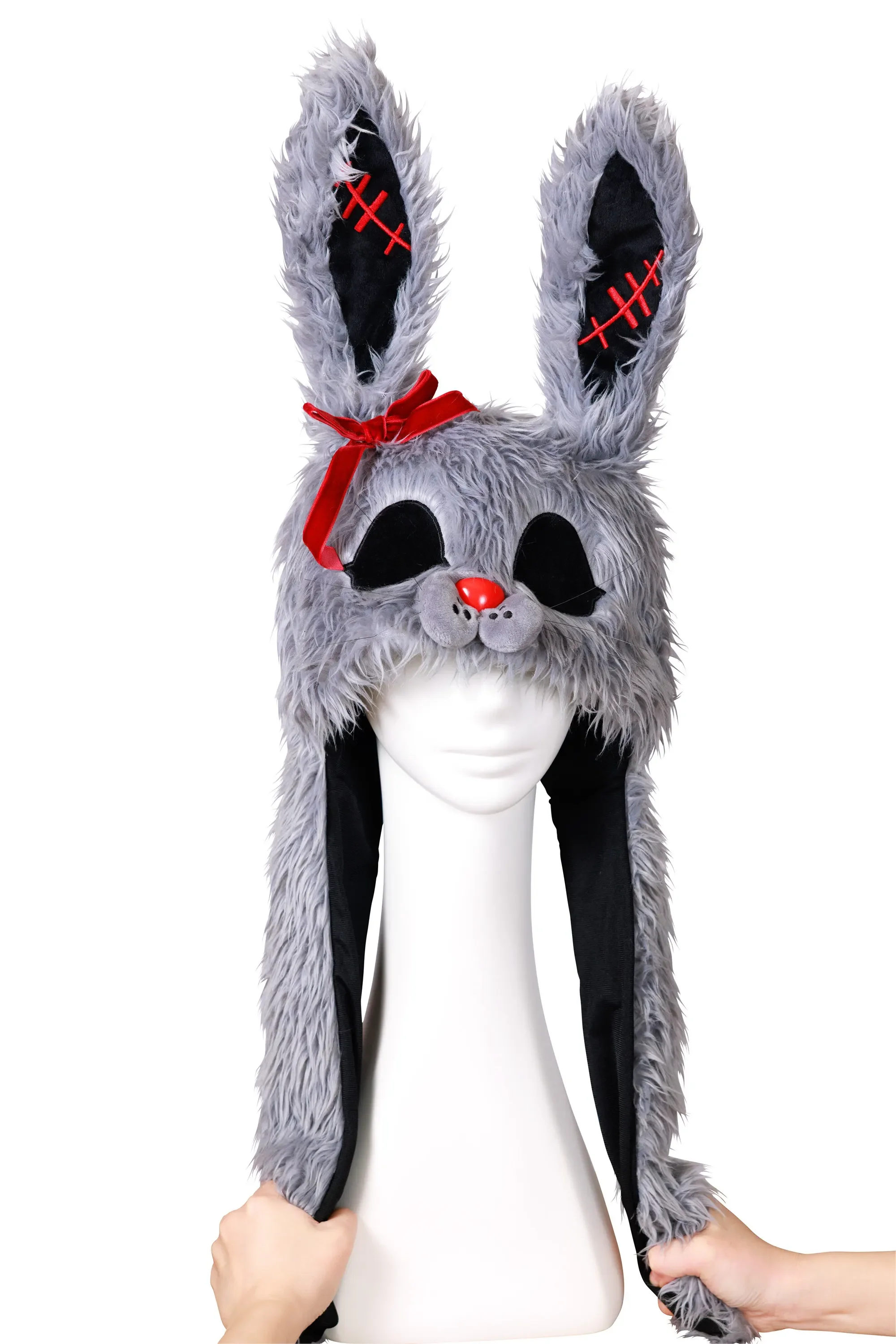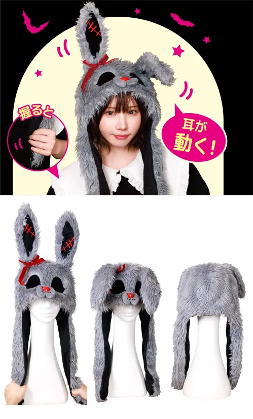 ホラー×かわいいを融合させた、「コワカワ」うさぎをモチーフにしたアニマル帽子です。毛足の長いグレーファーを使用し、ボリューム感のある豪華な仕上がりに。赤い鼻とリボン、つぎはぎ風の耳中刺繍がダークで印象的なアクセントを加えています。左右の耳はエアポンプ内蔵で、手元の部分を押すことで耳がぴょこぴょこと上下に動く仕様。ひげ付きでキャラクター性を演出しつつ、リアルさもプラスしています。ユニセックス着用でき、ハロウィン仮装やSNS映えもバッチリ。