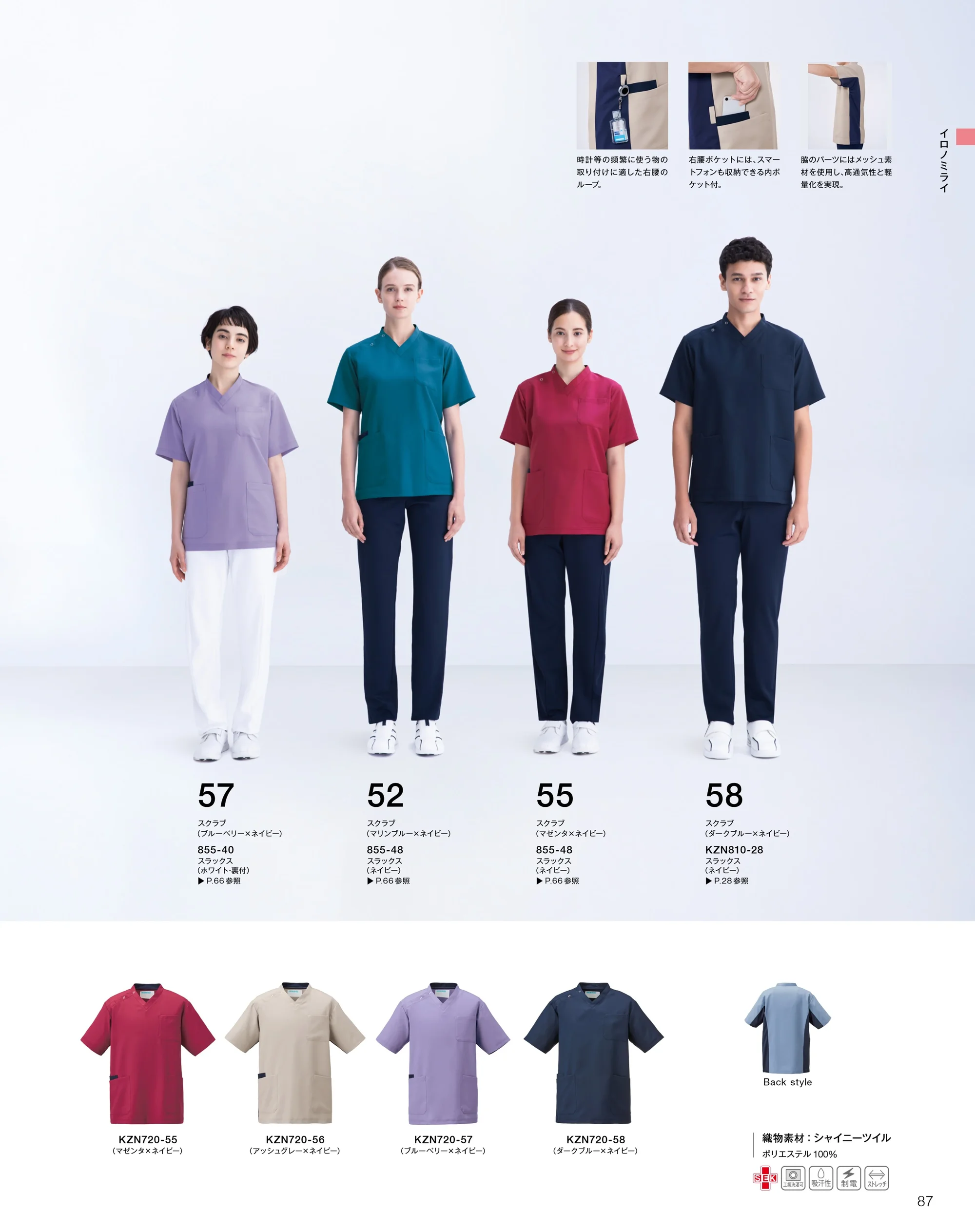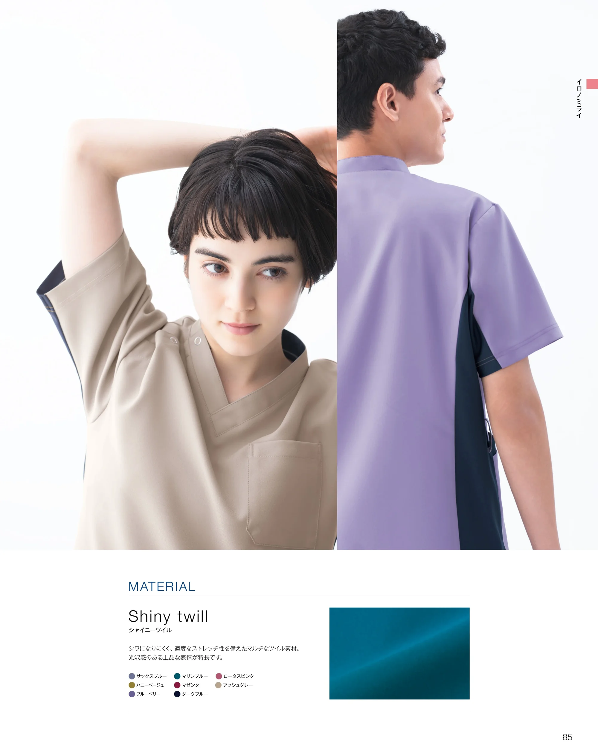 医療現場に寄り添う発想から生まれたイロノミライシリーズのスクラブ。上品な光沢感が特徴のシャイニーツイル素材を採用し、動きやすさと美しいシルエットを両立しました。適度なストレッチ性と軽やかな着心地で、長時間の業務でも快適さが続き、チーム全体を明るく洗練された印象へ導きます。