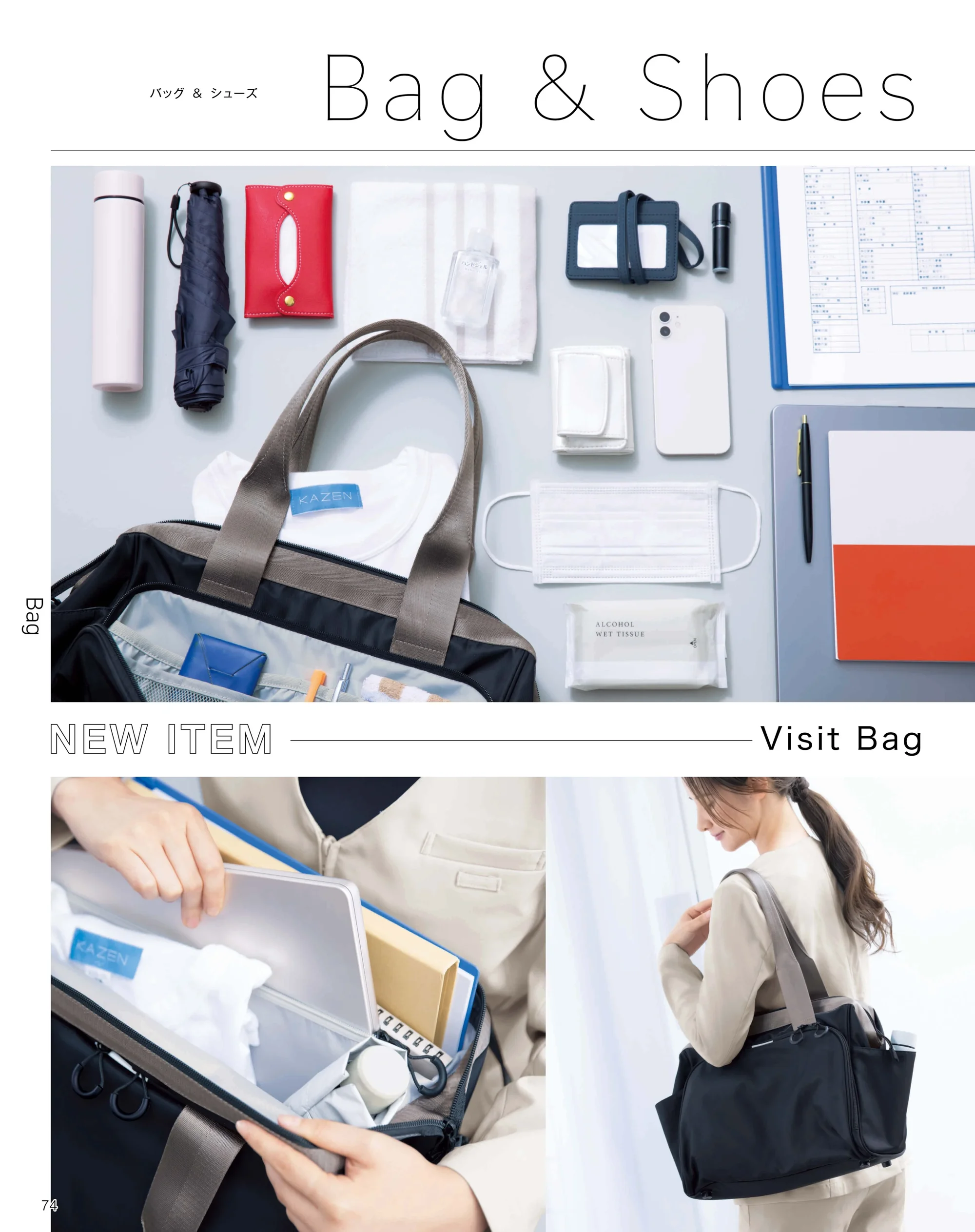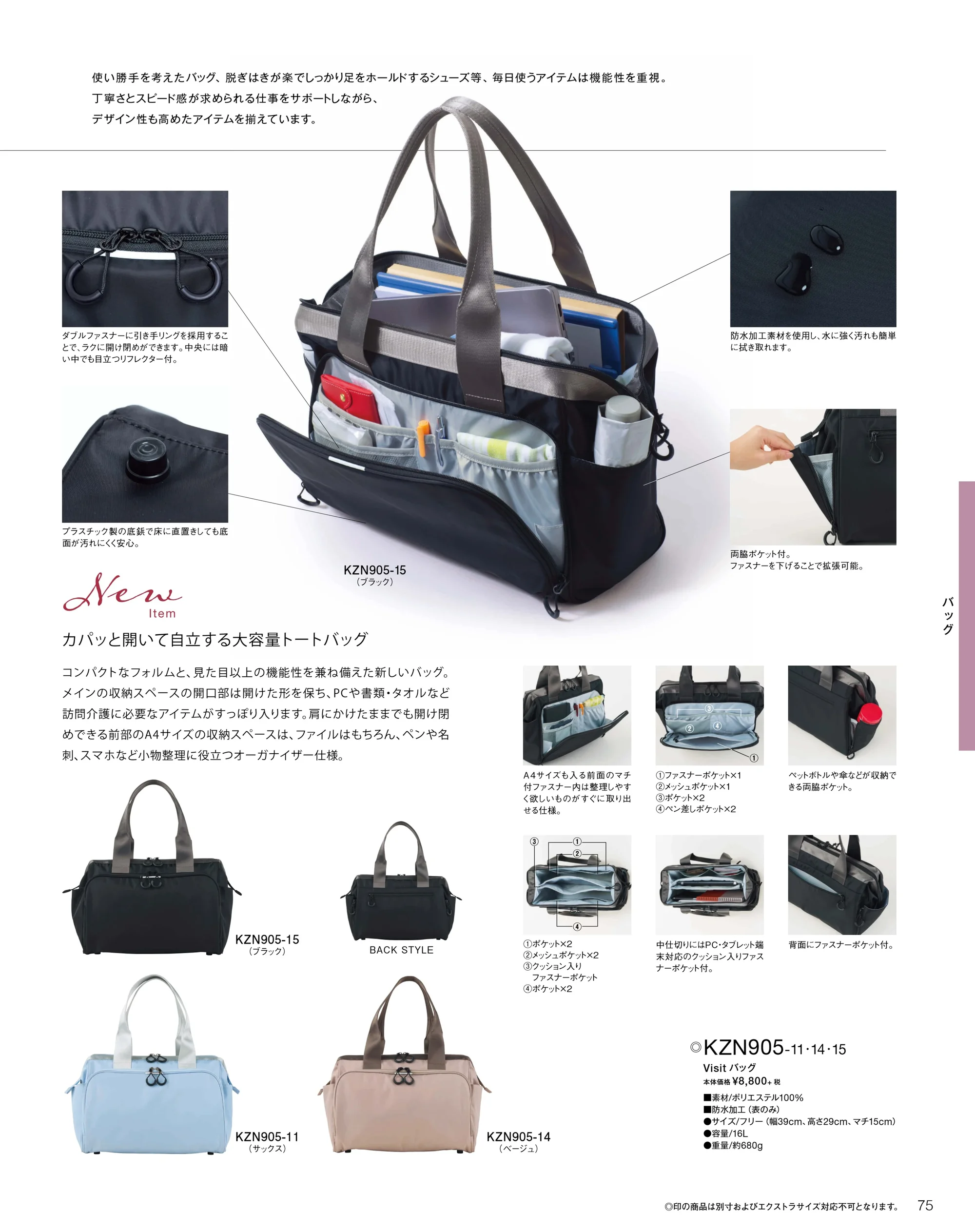 訪問業務や通勤時の使いやすさを追求したKAZENのVisitバッグです。カパッと大きく開いて自立する設計により、書類やタブレット、ケア用品などを一目で把握可能。防水加工素材を使用し、毎日の持ち運びや現場での使用でも安心感のある機能性と、すっきりとしたデザイン性を両立しています。