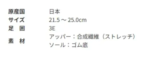 | 素材特長 | ・日本製 自社の国内工場(福岡県久留米市)でつくられた製品です。 ・軽量 特殊素材を靴底に配合し、製品の軽量化を図っています。 ・抗菌・防臭効果が期待できる加工を施しています。 |