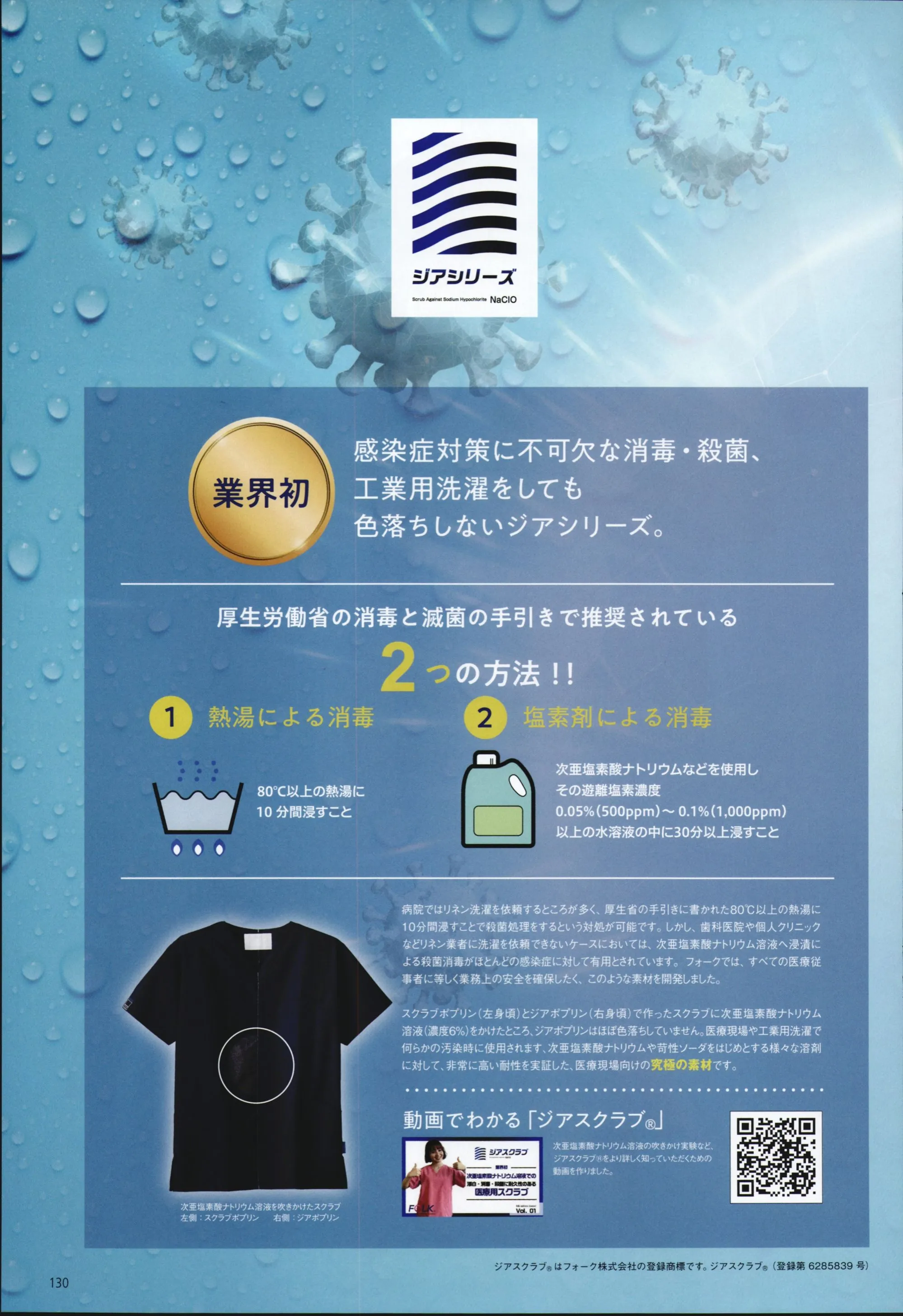 病院ではリネン洗濯を依頼するところが多く、厚生省の手引きに書かれた80℃以上の熱湯に10分間浸すことで殺菌処理をするという対処が可能です。しかし、歯科医院や個人クリニックなどリネン業者に洗濯を依頼できないケースにおいては、次亜塩素酸ナトリウム溶液へ浸漬による殺菌消毒がほとんどの感染症に対して有用とされています。フォークでは、すべての医療従事者に等しく業務上の安全を確保したく、このような素材を開発しました。