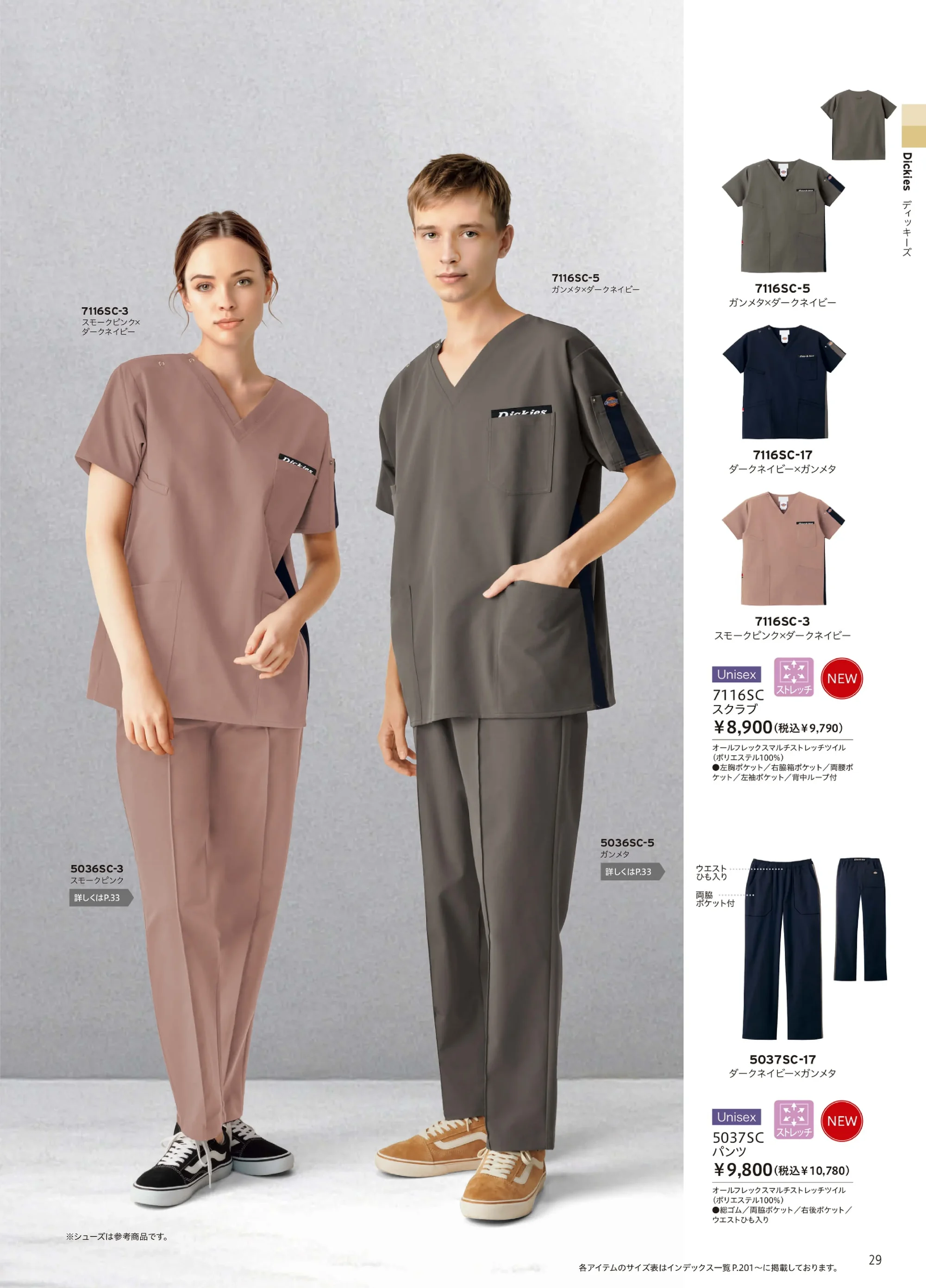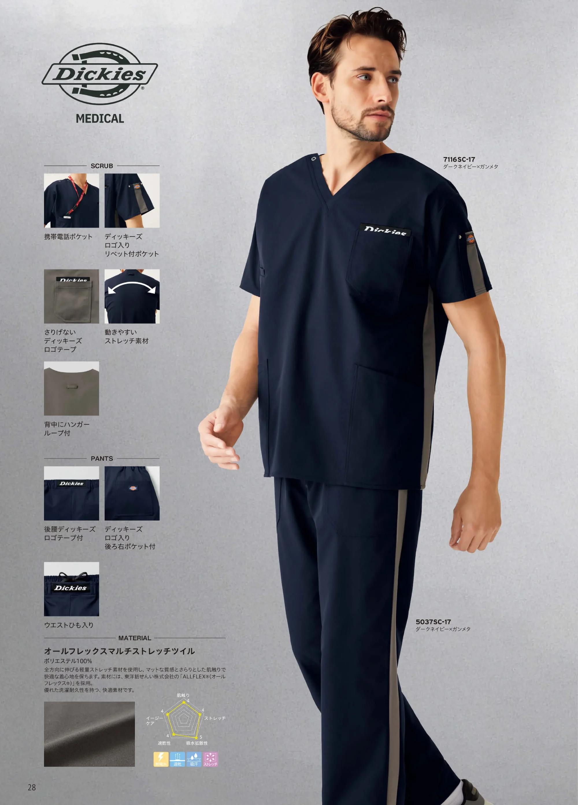 Dickies MEDICALの機能性とデザイン性を融合させたユニセックス対応スクラブです。オールフレックスマルチストレッチツイル素材を採用し、ポリエステル100%ながら高い伸縮性と軽快な着用感を実現。動きやすさを重視した設計で、忙しく動き回る医療・介護・検査現場でもストレスなく快適な業務をサポートします。