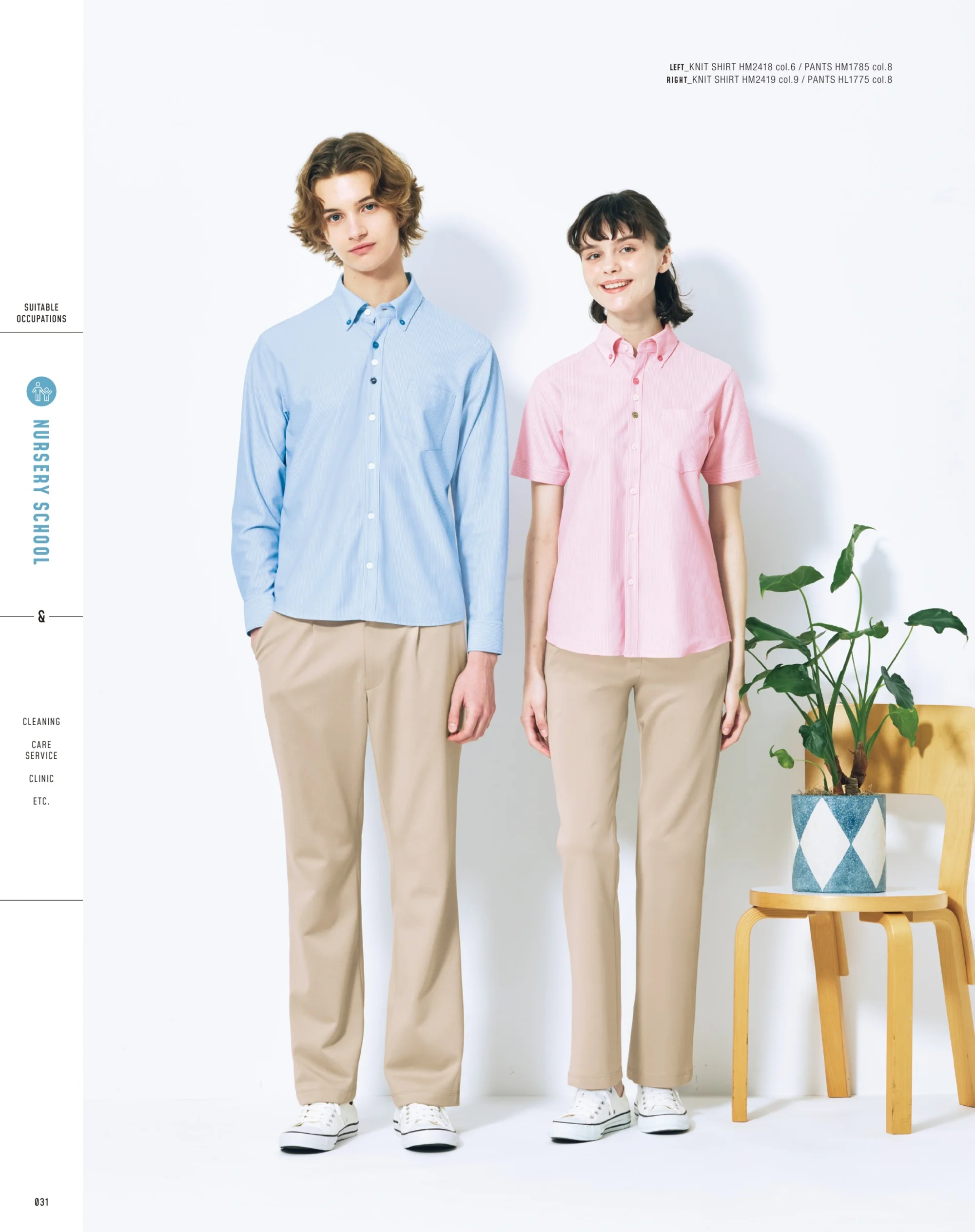きちんと見えて、ラクに動ける。やさしく美しい色合いが、素直で誠実な印象を与える人気のニットシャツ。独自の立体パターンシステムで、介助するときに感じる、肩まわり・腕・背中のきゅうくつ感を軽減。また、腕を上げても裾が一緒に上がってこないので、腰まわりのチラ見えも気になりません。胸もとのチラ見えを防ぐうれいし配慮。内掛けのボタンを採用しています。キレイでやさいい自然の色を採用。それぞれの生地色にあわせて選んだ3色のボタンが、おしゃれ感を演出します。たとえば、ピンク色はさくらをイメージし、ボタンにもさくらの花びらや幹の色を取り入れています。ボディラインを目立たせない、ほどよいハリ感のある生地を採用。下着が透けにくいから1枚でも安心して着られます。