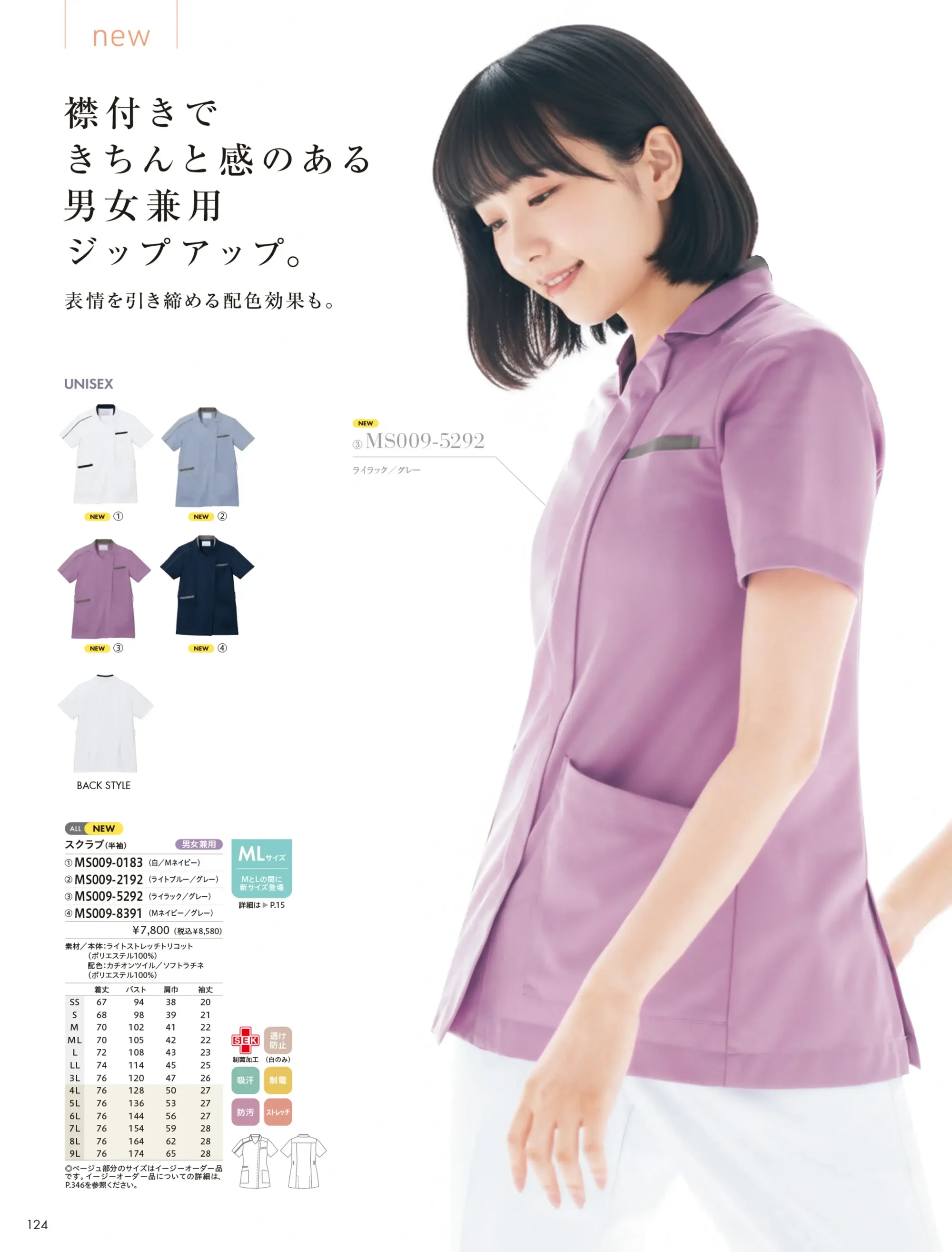 襟付きデザインできちんと感を演出する男女兼用ジップアップスクラブ。表情を引き締める配色効果がアクセントとなり、上品で清潔感のある印象に。