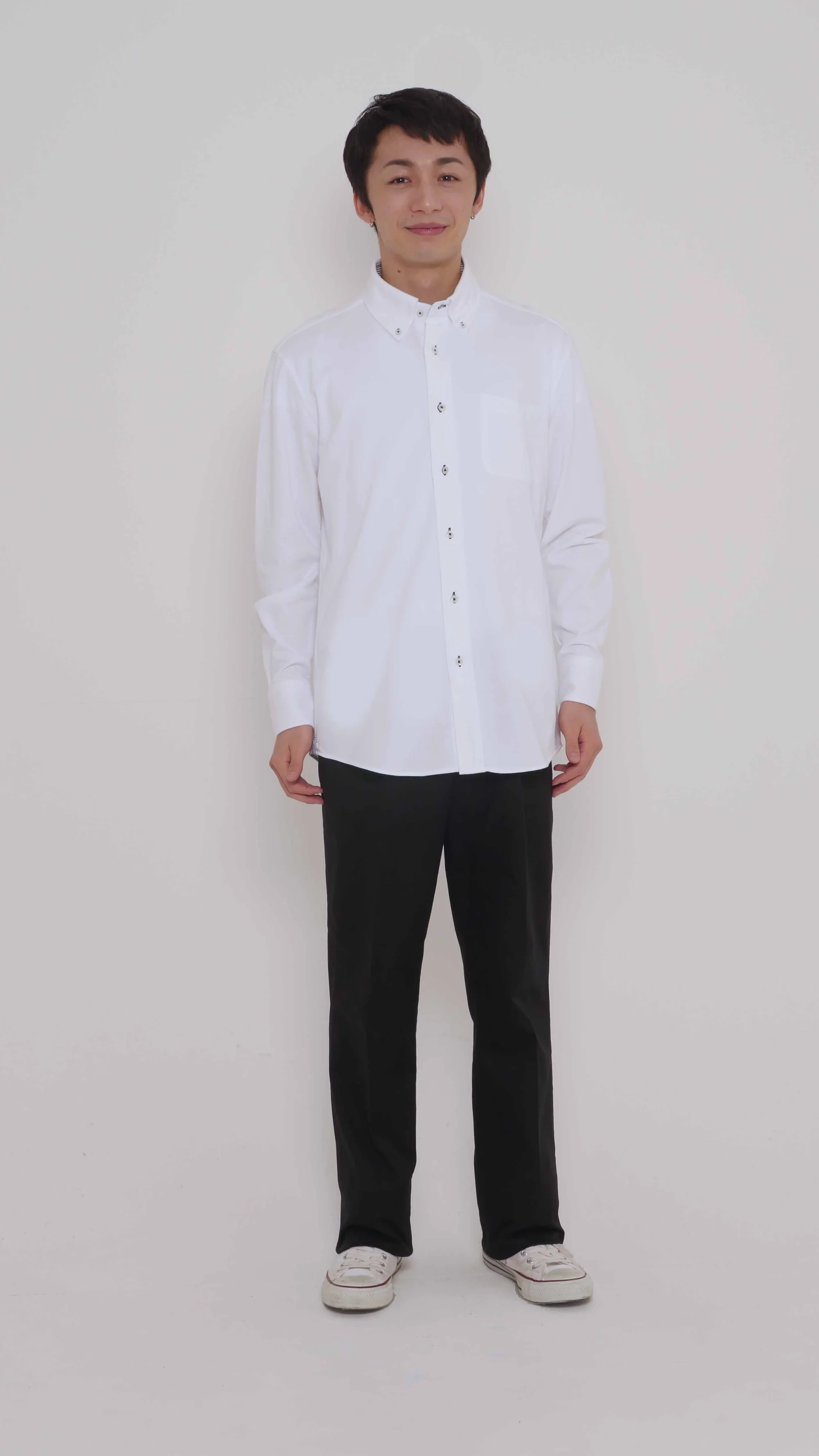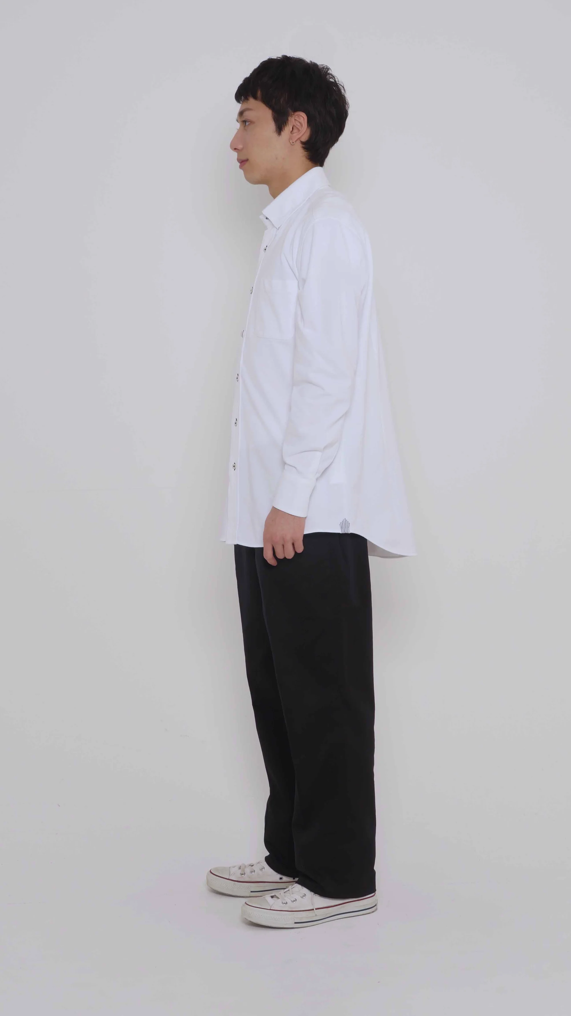 形状特長 | ボタンダウン、左胸アウトポケット、台衿内側ストライプ柄使用、両脇裾ガゼット仕様。 |