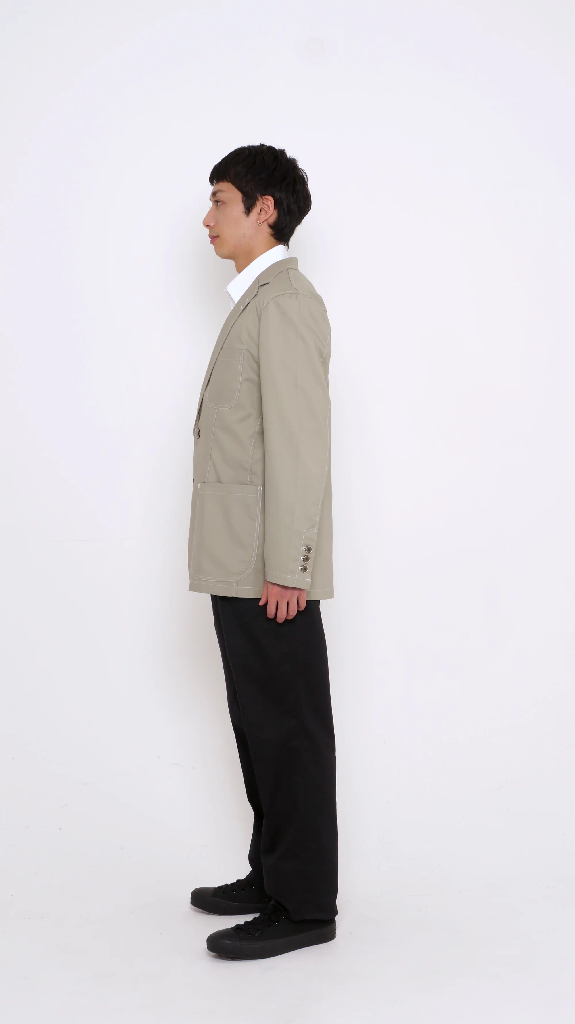 形状特長 | 左胸アウトポケット、袖口本開き見せ仕様、後ろセンターベンツ |