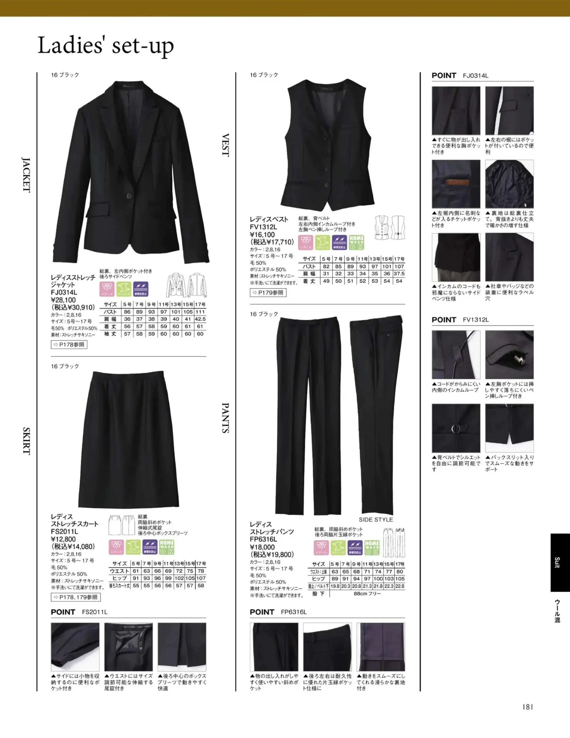 形状特長 | 総裏、両脇斜めポケット、後中心ボックスプリーツ、らくらくカン |