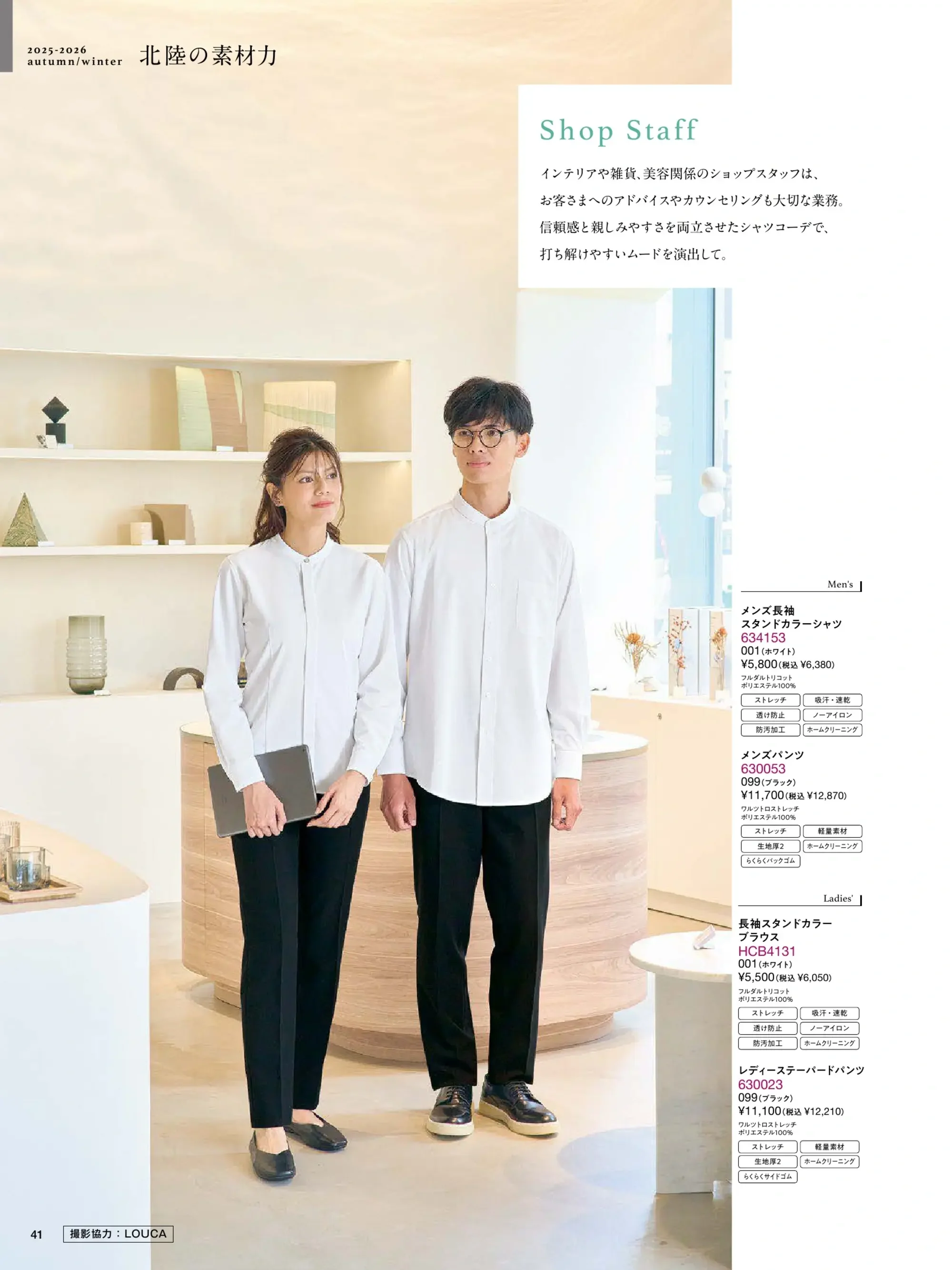 形状特長 | スタンドカラー・左胸ポケット部分に名札ループ付き・袖口カフス(糸付ボタン2個付) |