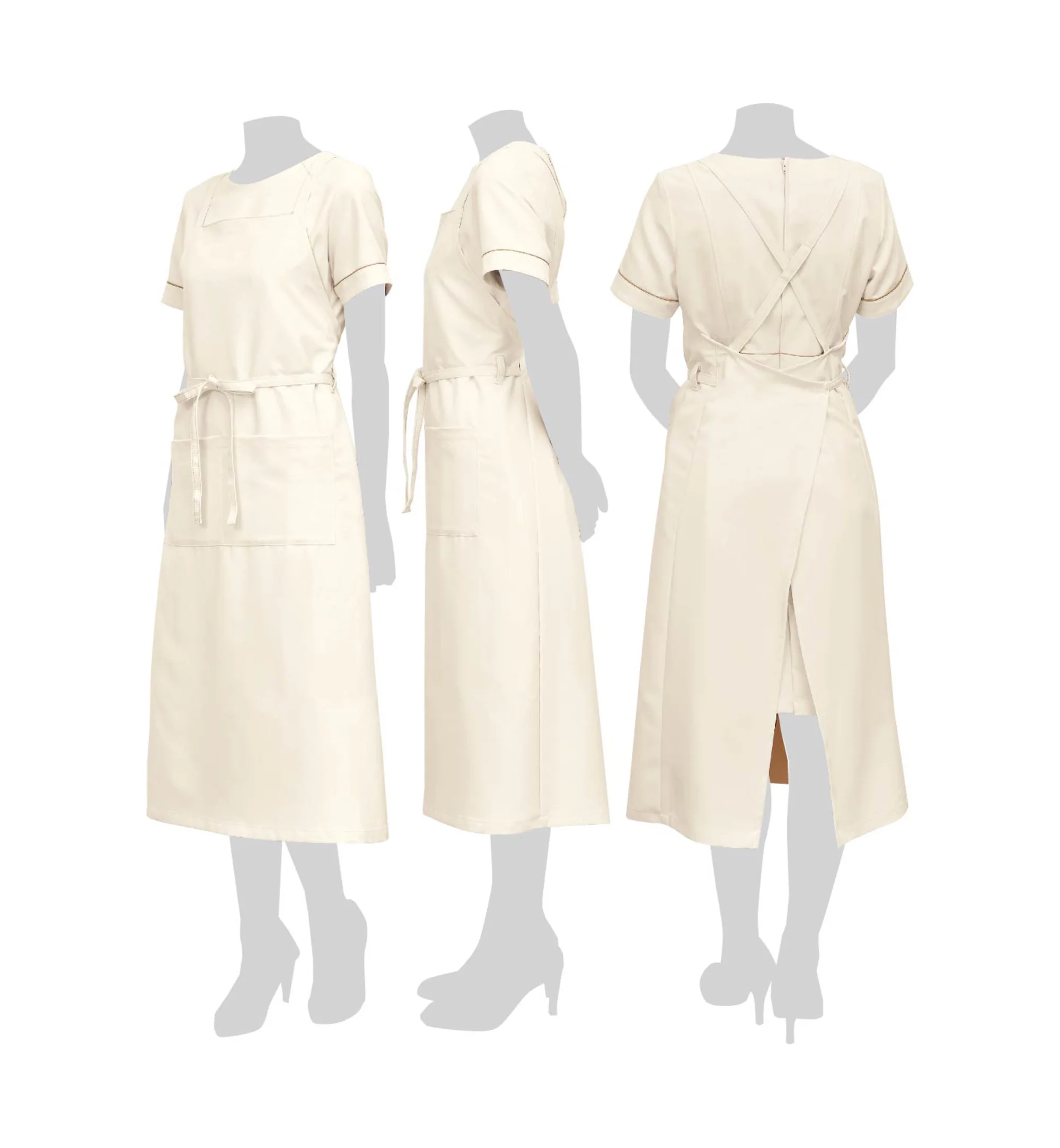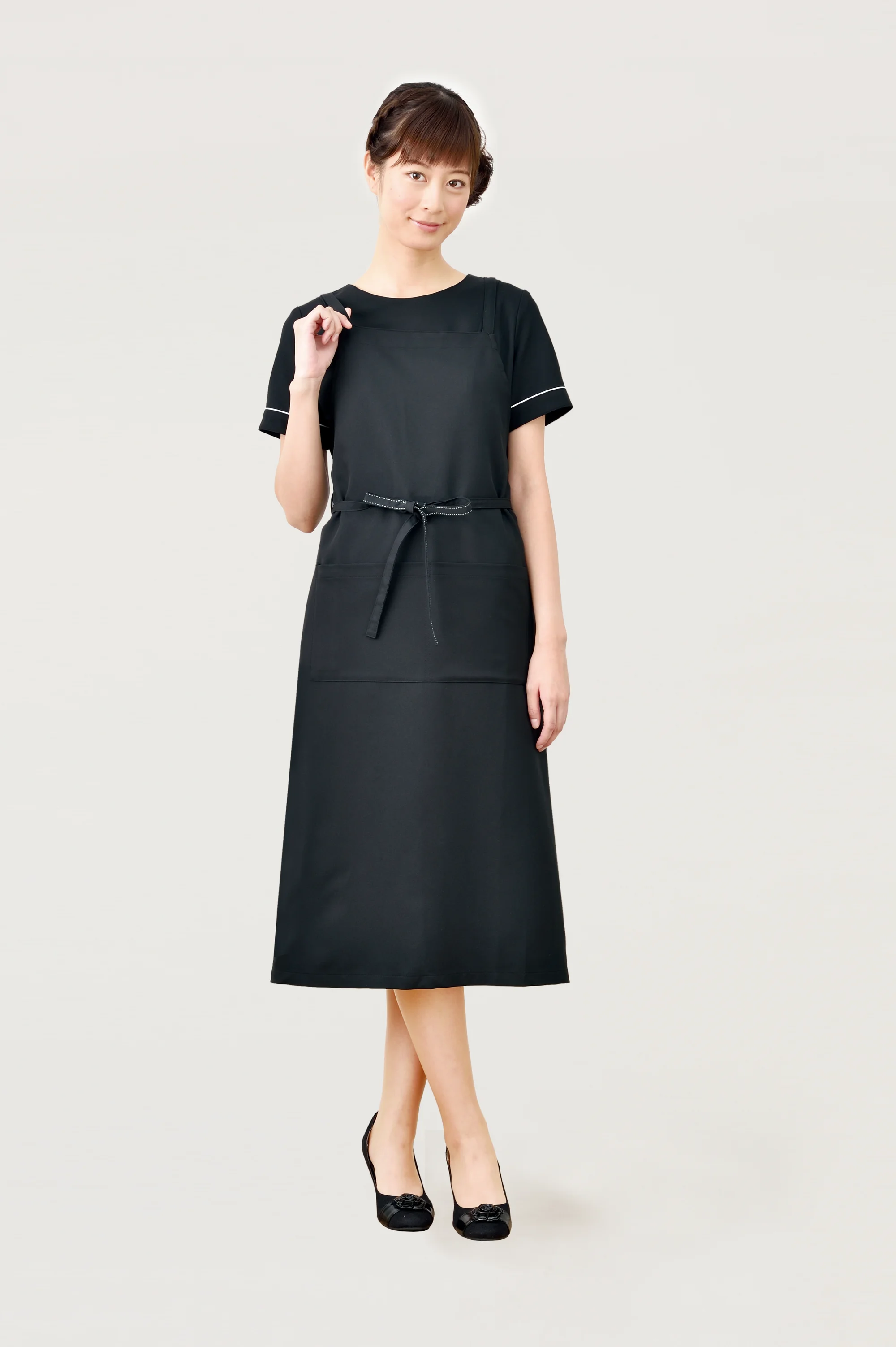 すっきりとしたシルエットの機能的エプロン。おしりをすっぽり包み込むデザインなので、バックスタイルを気にすることなく快適です。ウエストリボンの裏面にはお洒落なテープがついています。【なめらかストレッチ】