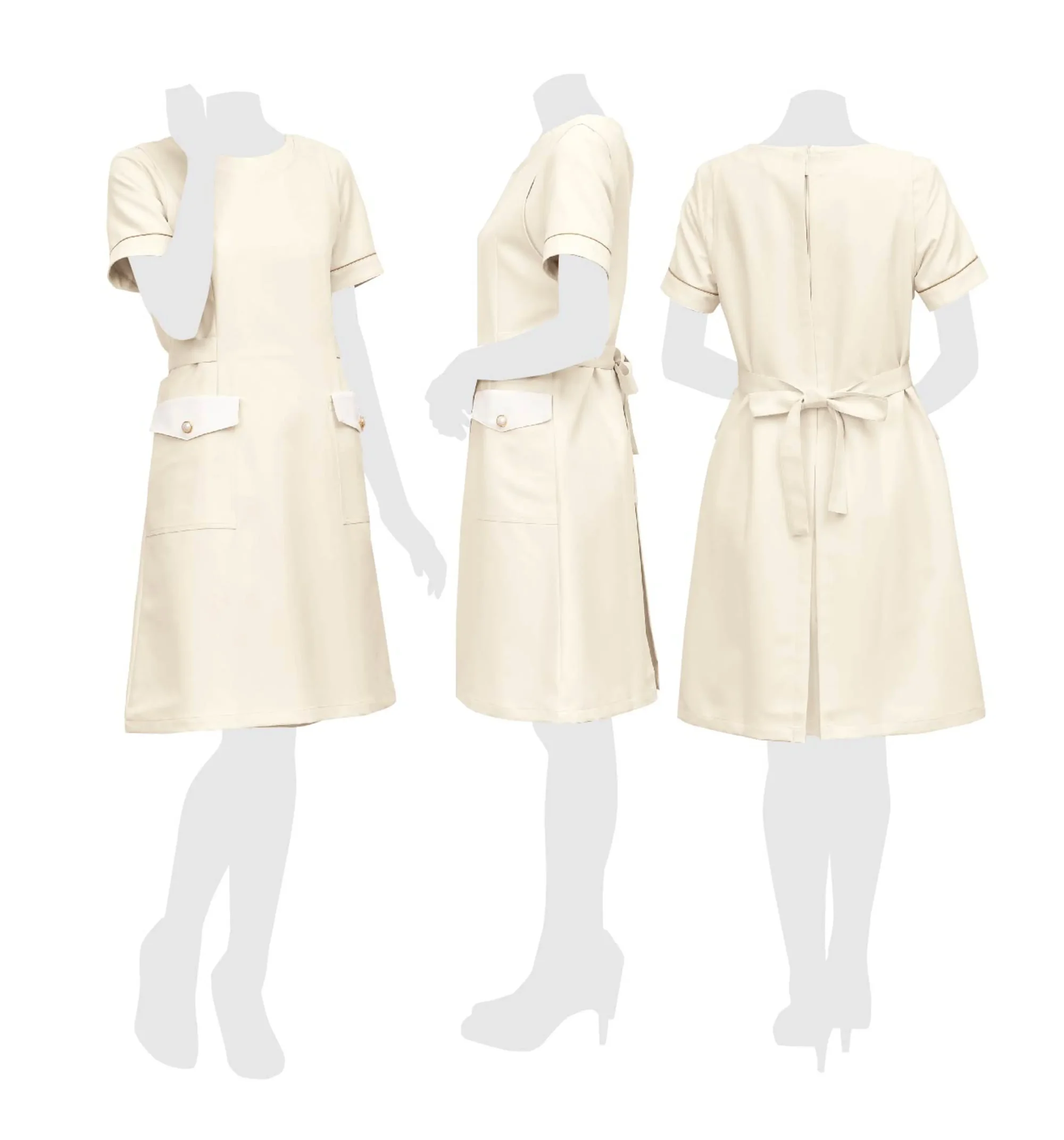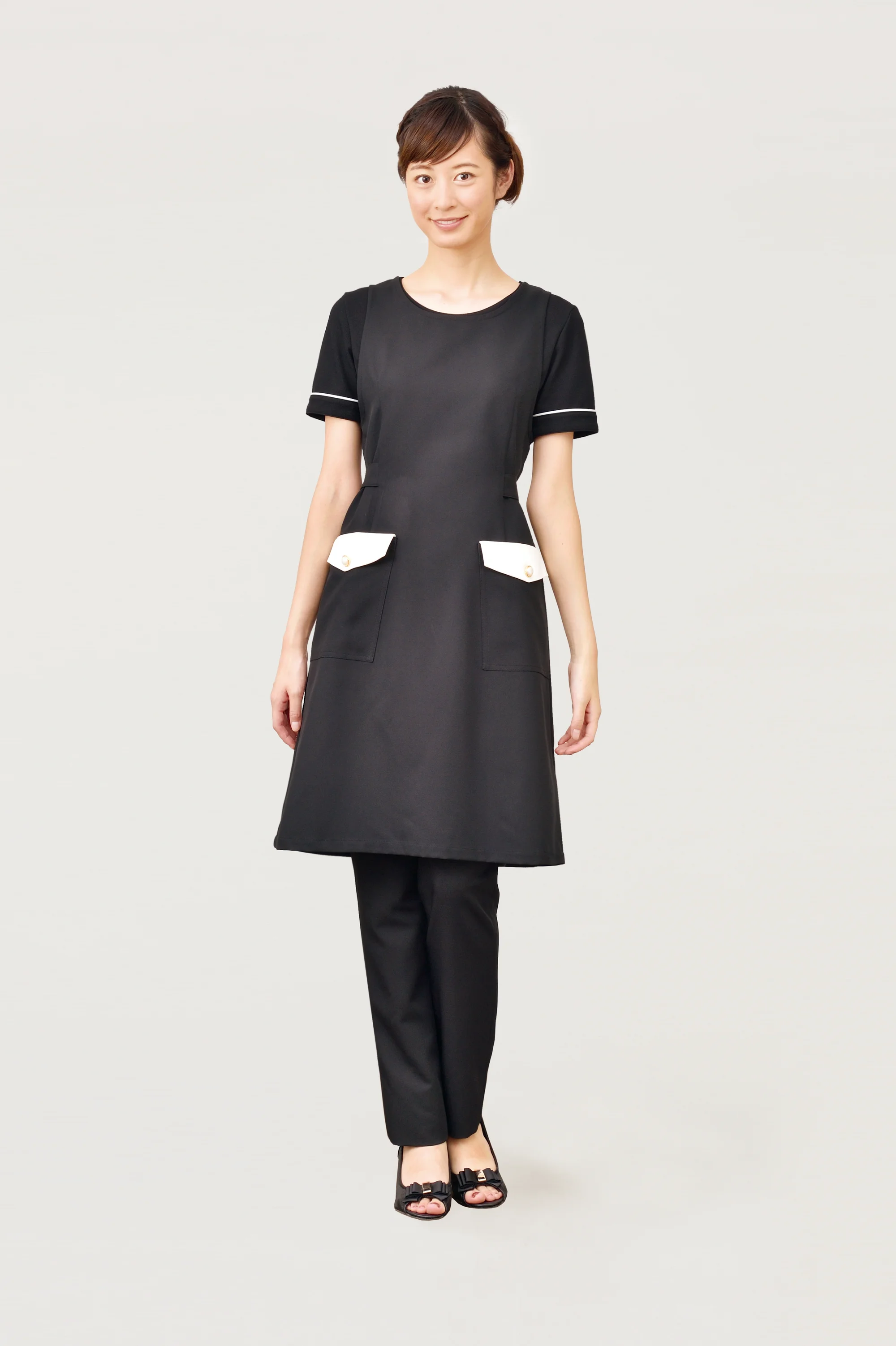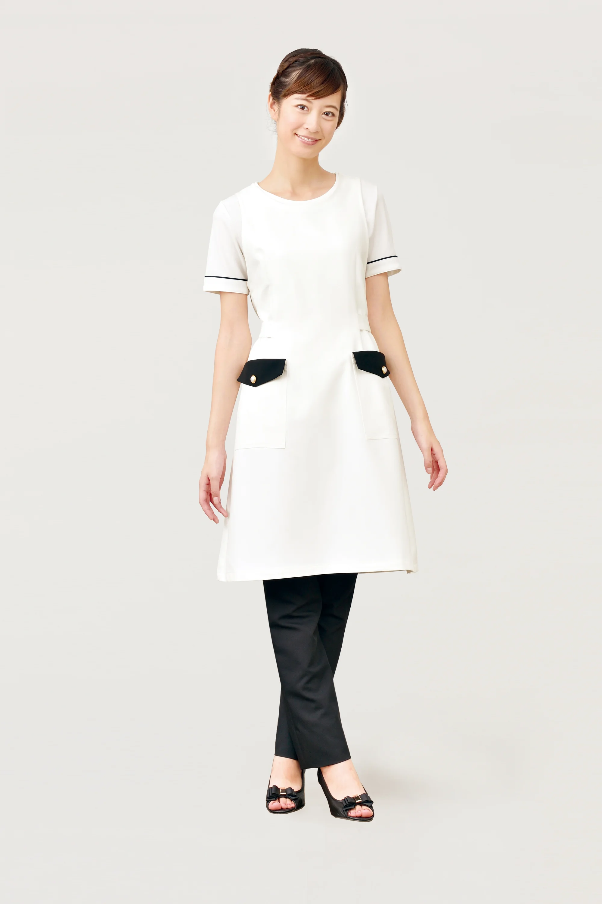 気品漂うエプロンスタイル。今までありそうでなかった上品でエレガントなエプロンスタイル。後ろまでつつみ込むデザインなので作業に適しています。素材には撥水、撥油、防汚加工が施されています。ネオクラシックのユニフォームはこだわりの高機能素材を使用しています。