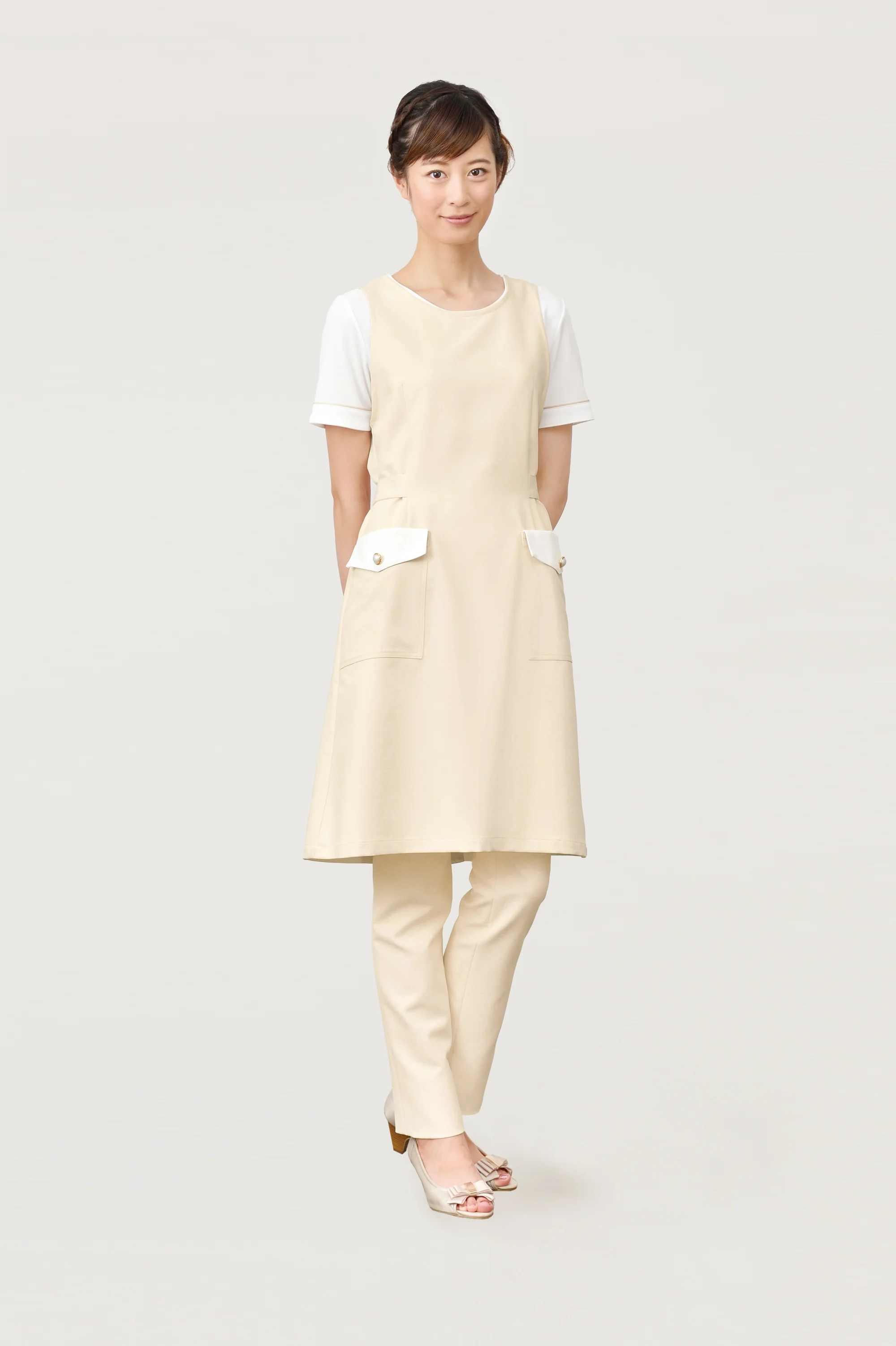 | 形状特長 | 両脇ポケット付。 ボタンをずらしてとめることでサイズの調節が出来ます。 |