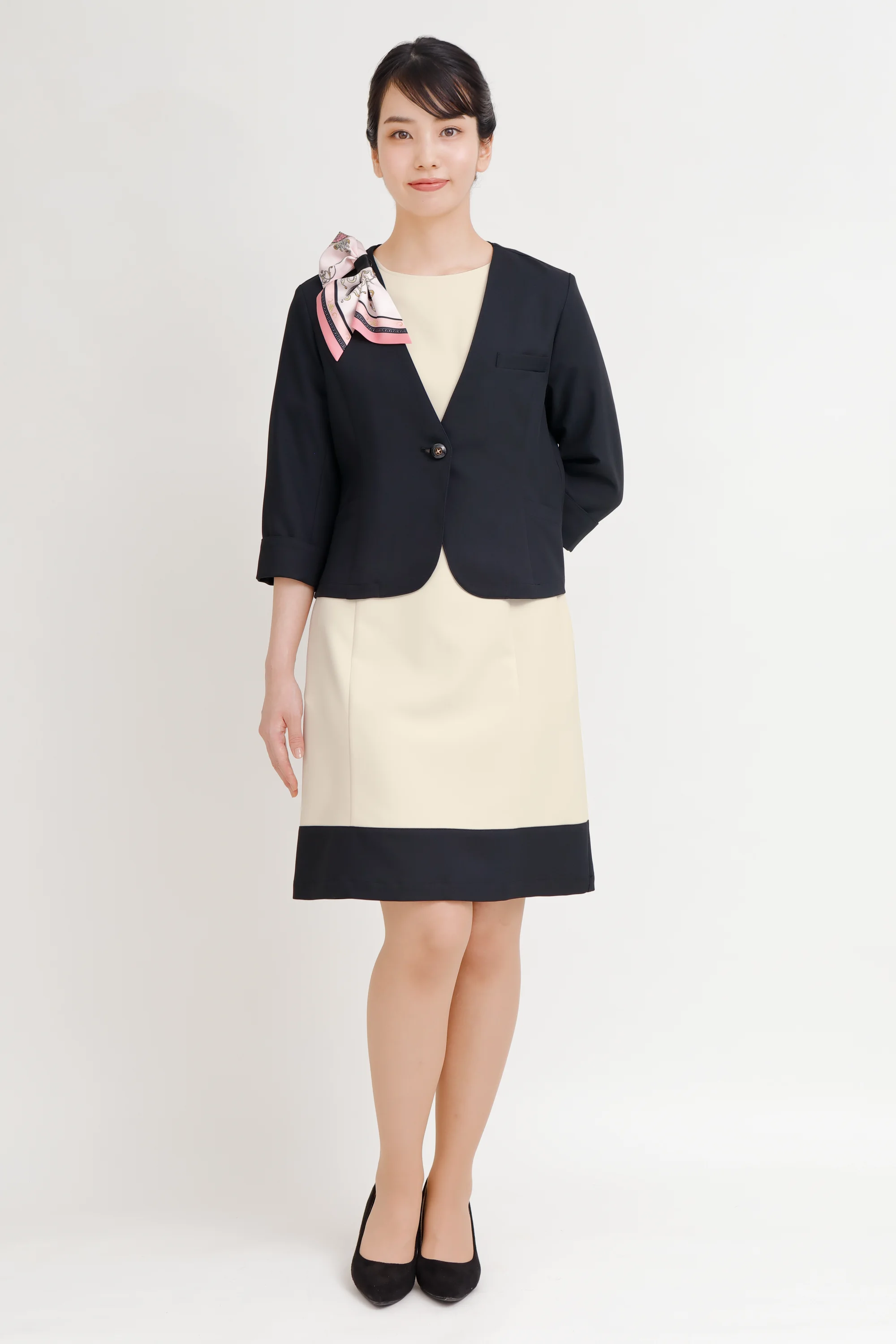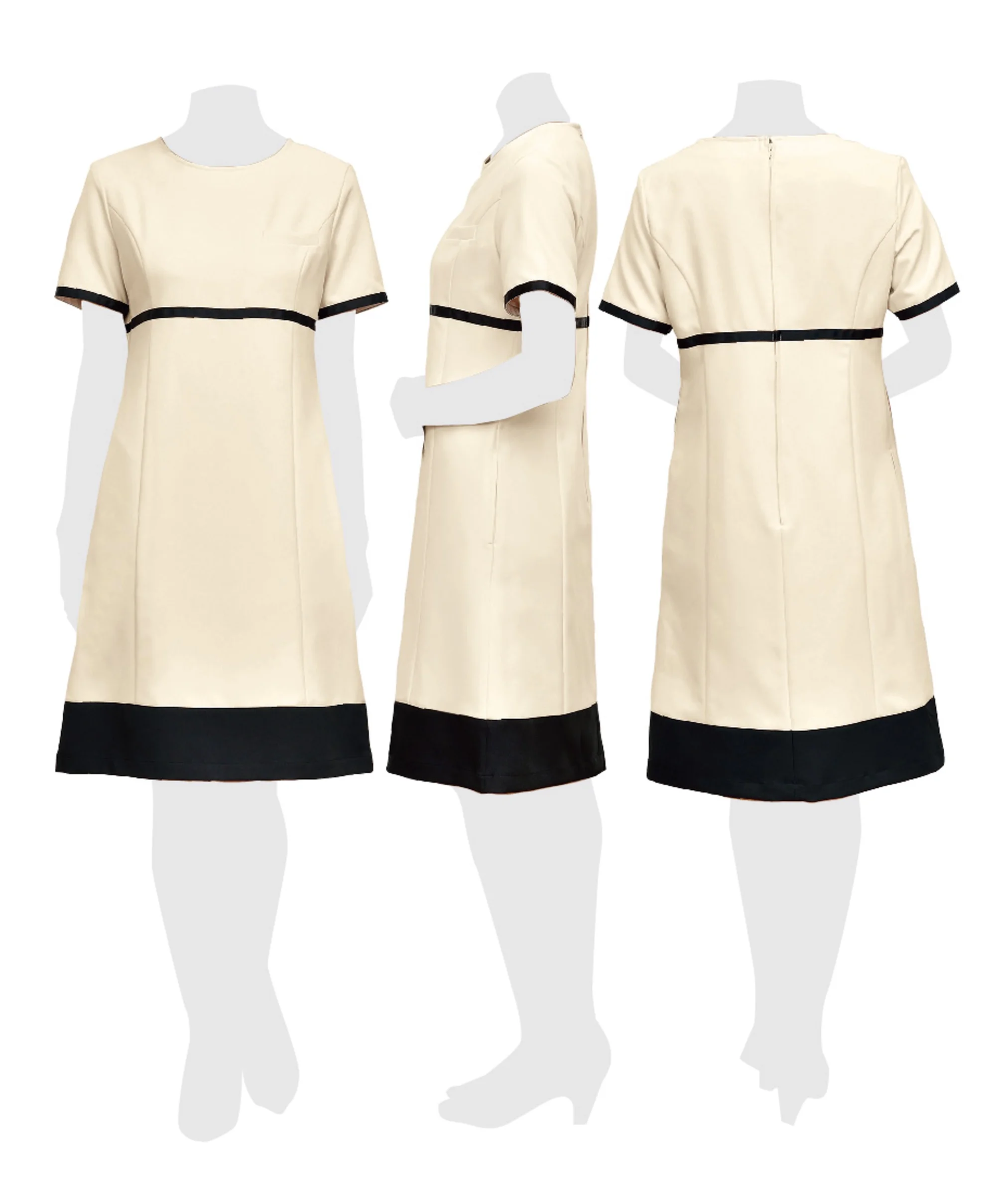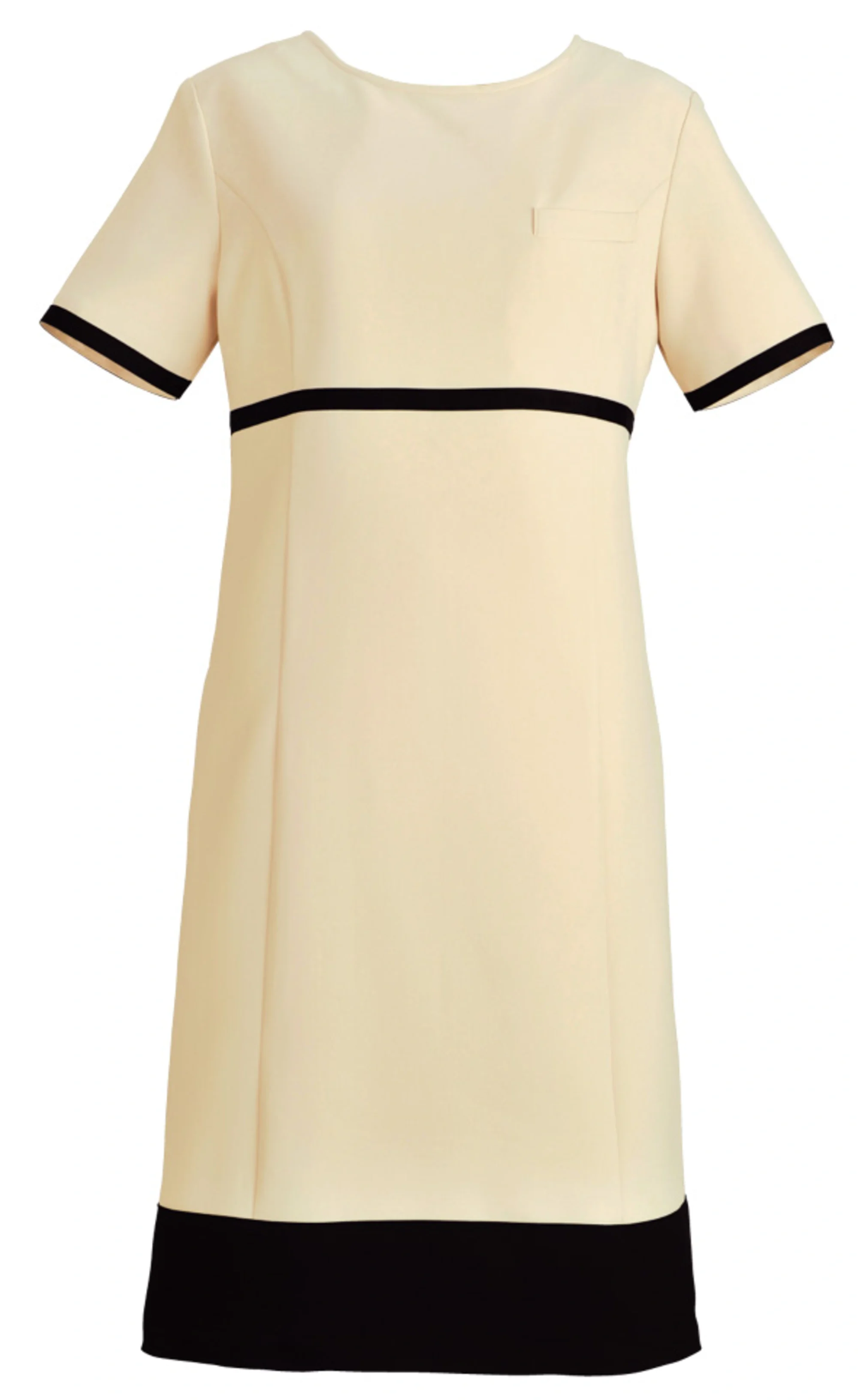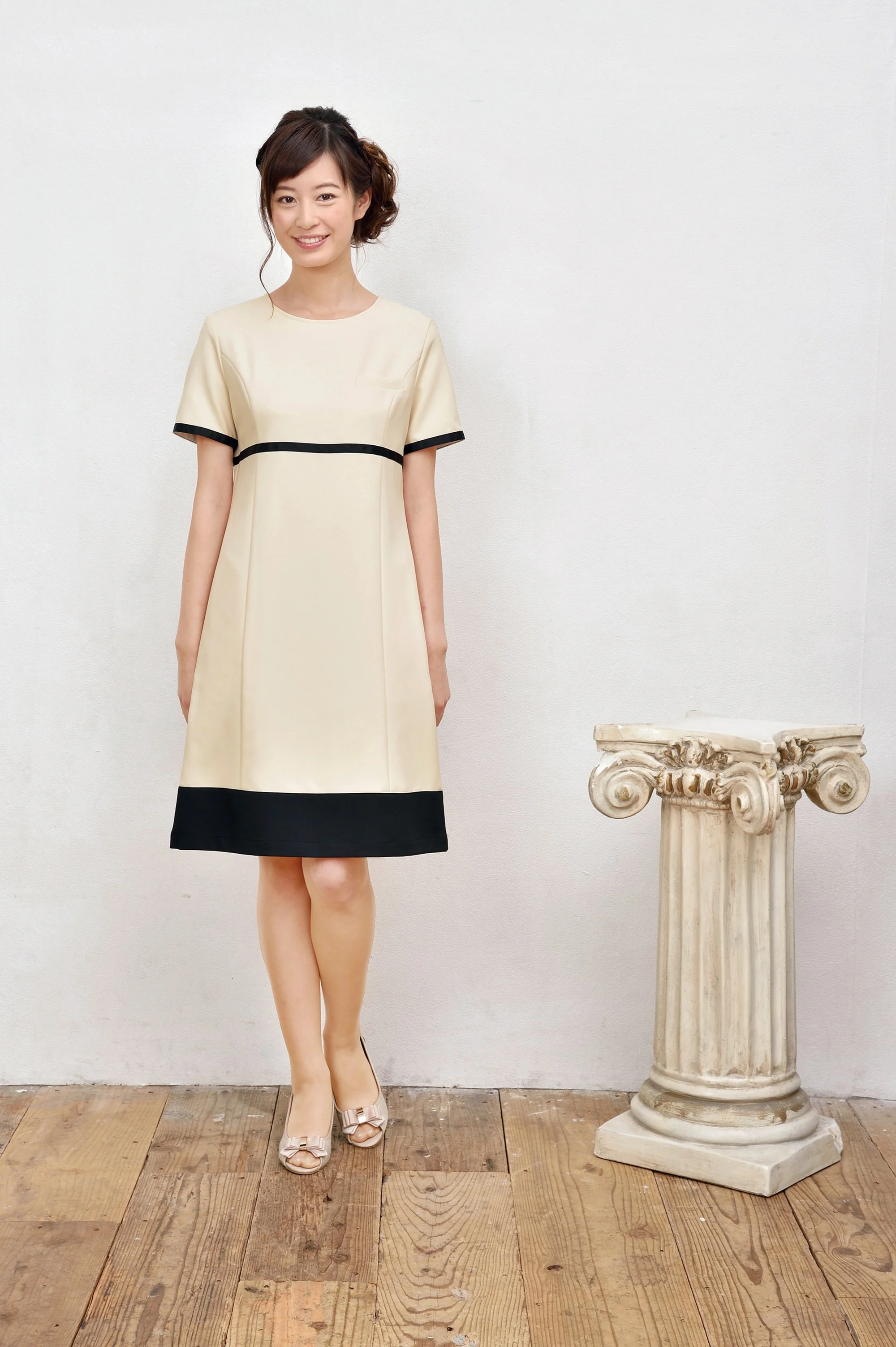 絶妙なバランスの美シルエットワンピース。袖口、ウエスト、裾にブラックを配した絶妙なバランスのフェミニンワンピース。高めのウエストラインによりスタイル美人を実現します。ネオクラシックのユニフォームはこだわりの高機能素材を使用しています。