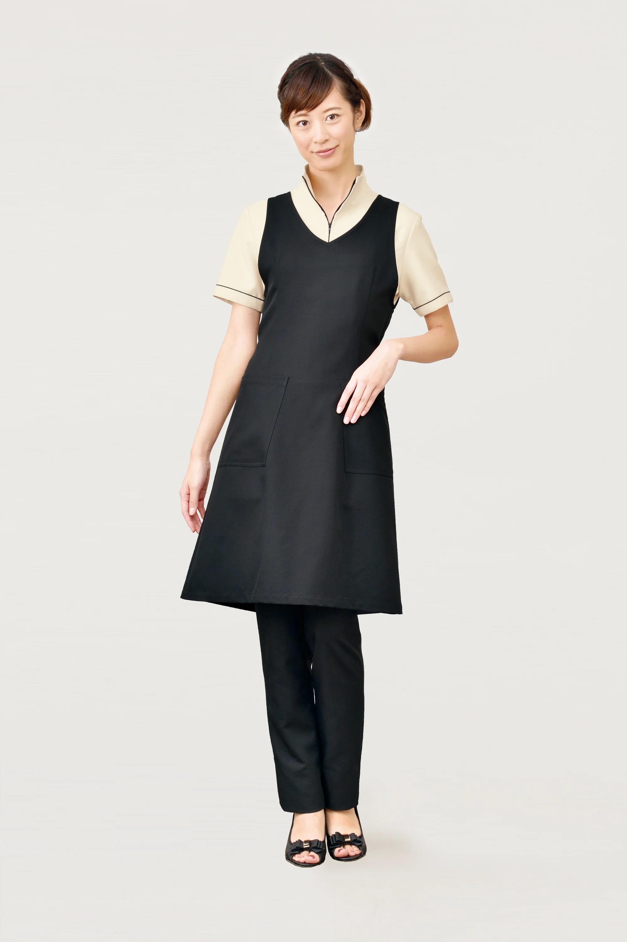 | 形状特長 | 左胸・両脇ポケット、前ファスナー開き、後ろ裾ベンツ、胸ポケット内側共布ループ付き、背中心ボックスプリーツ |