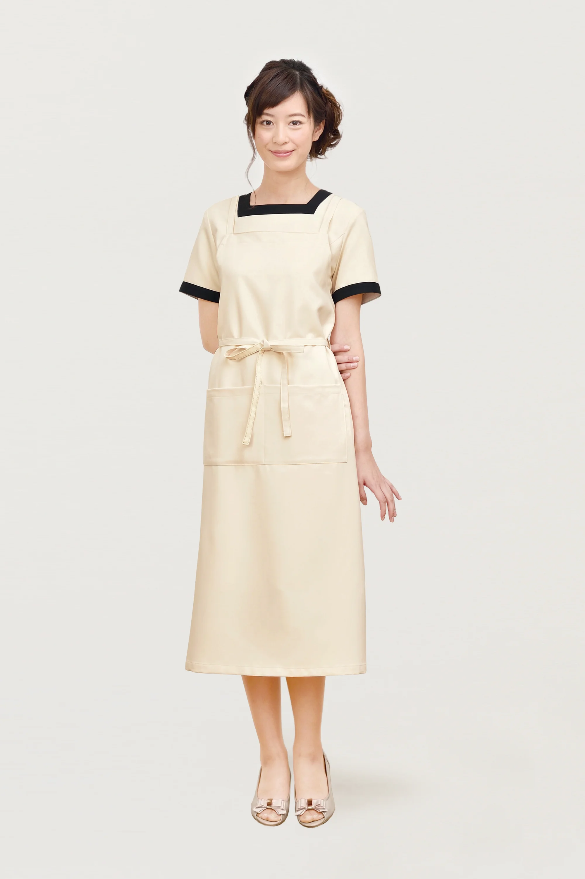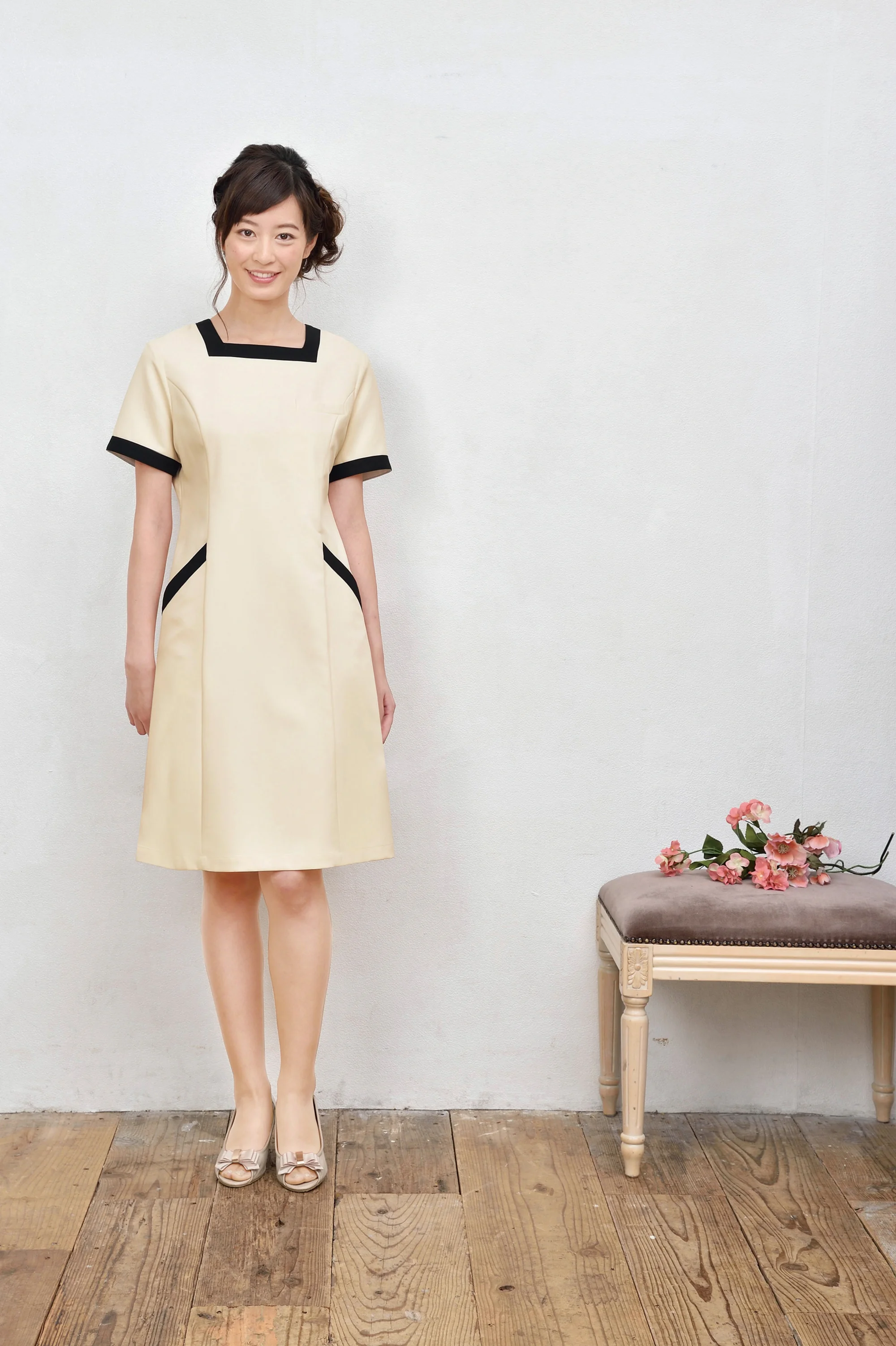 デコルテもスタイルも美しく。衿元のスクエアカットが女性のデコルテを美しく演出する美人ワンピース。ブラックの配色できりっと引き締め効果のあるデザインです。華やかさが香るエレガントな一着です。ネオクラシックのユニフォームはこだわりの高機能素材を使用しています。