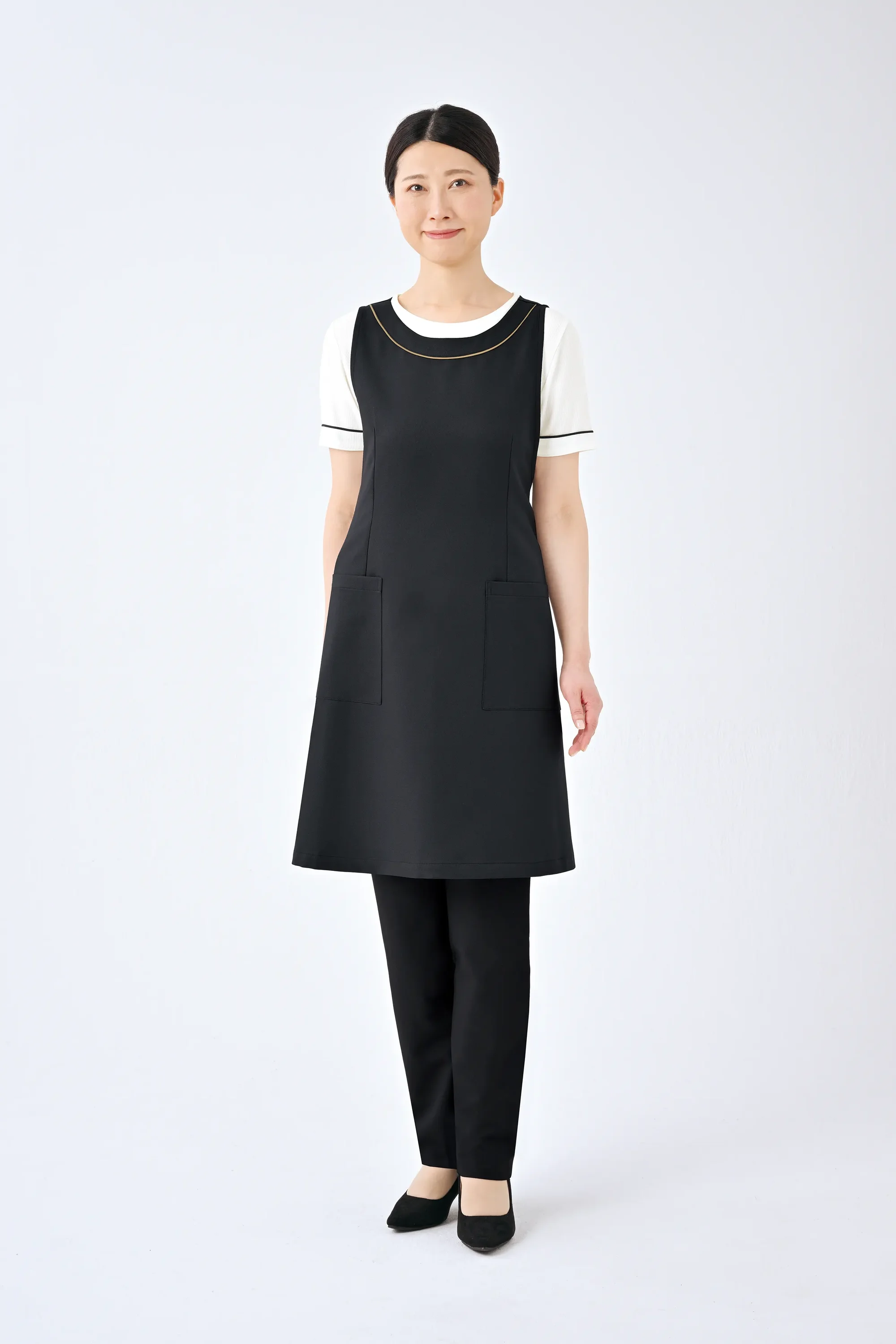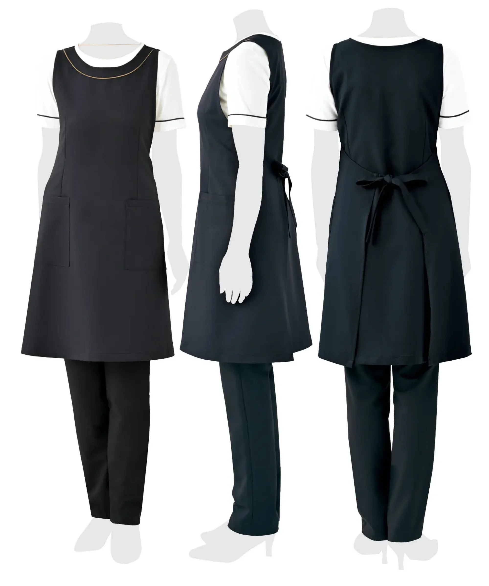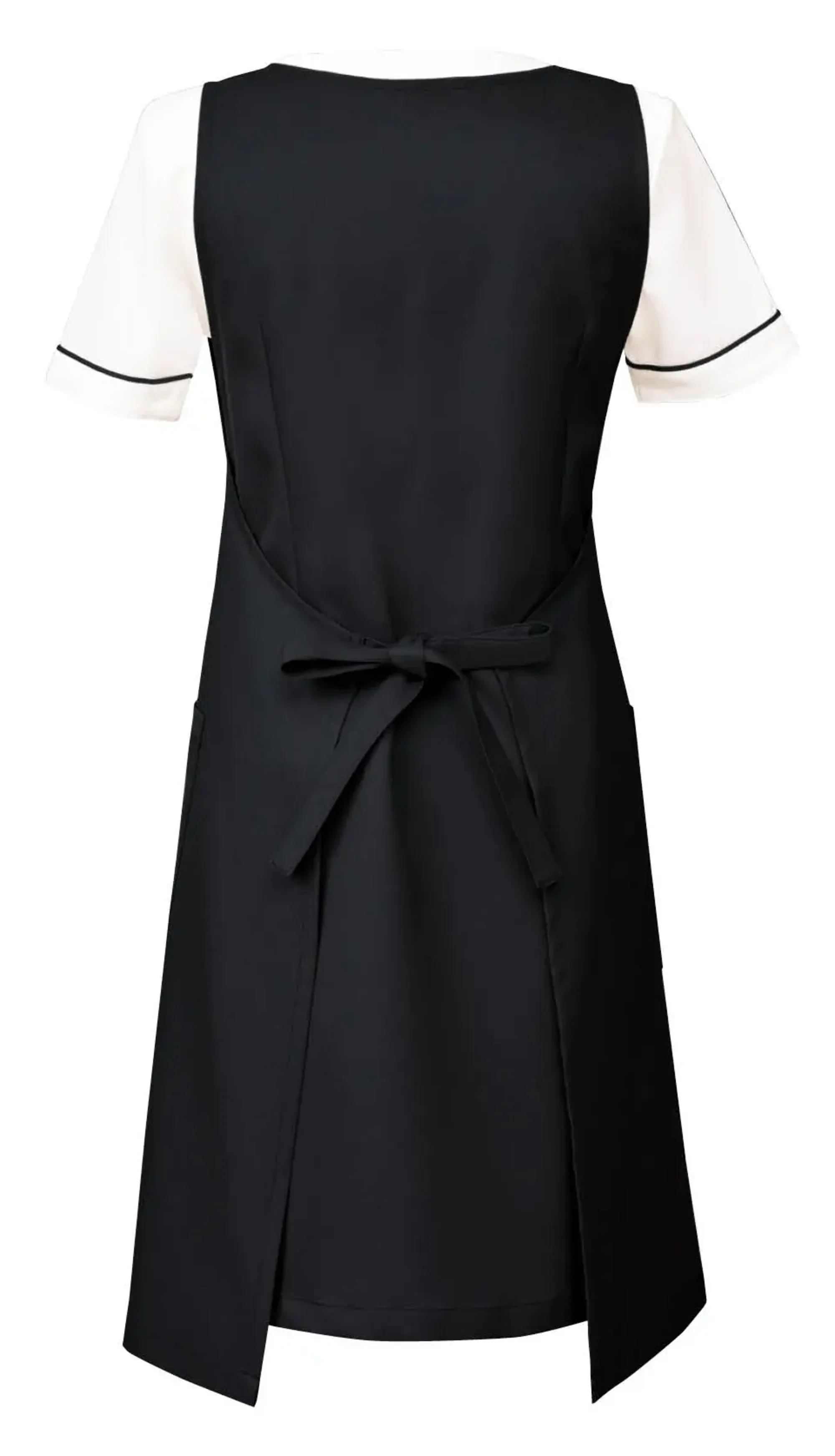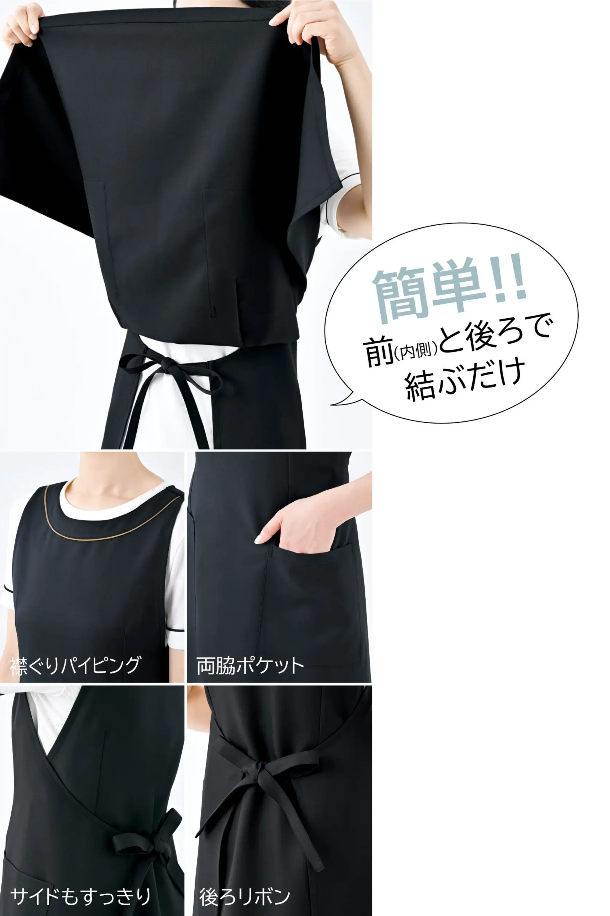 落ち着いた印象と動きやすさを両立したエプロンドレスです。チュニック感覚で着用できるデザインにより、接客業やサービス業のユニフォームとして幅広く対応。すっぽりかぶって前後で結ぶだけで、おしりが隠れるエプロンドレスが簡単に完成。襟ぐりにパイピングをあしらっているので、おしゃれ感もあり働く現場にぴったりです。しわになりにくいのでアイロンなしでもOKです。