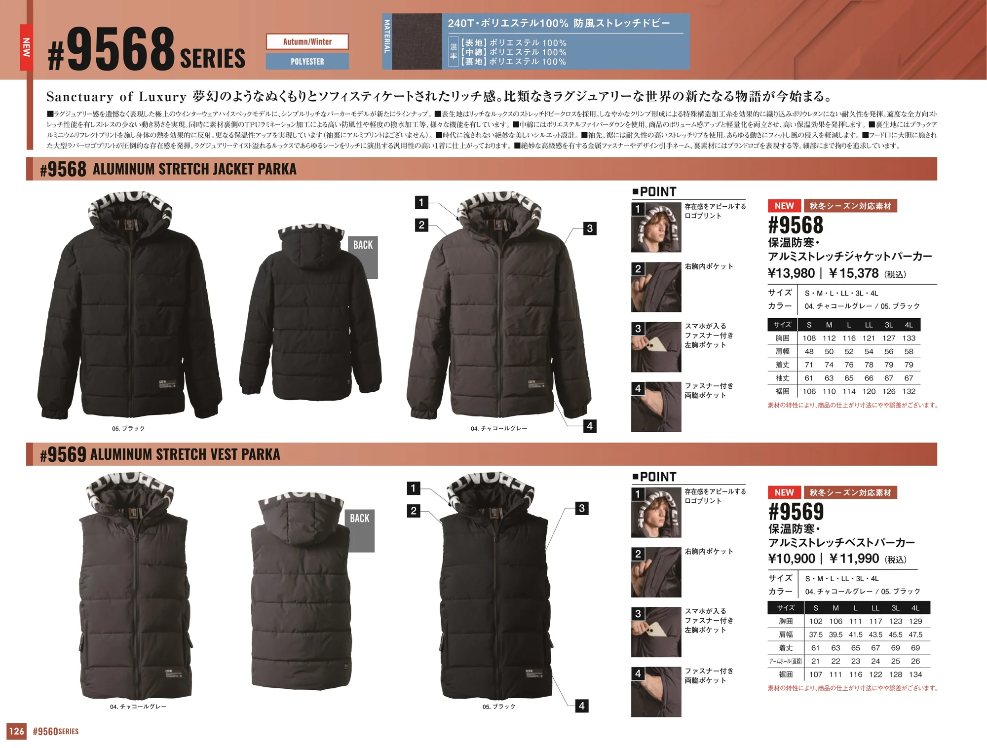 素材特長 | 表地:ストレッチドビークロス(特殊構造加工糸使用、全方向ストレッチ) 裏面:TPUラミネーション加工(防風性+軽撥水性) 中綿:ポリエステルファイバーダウン(軽量+高保温性) 裏地:ブラックアルミニウムリフレクトプリント(体温反射・保温性向上)※袖裏は非対応 |