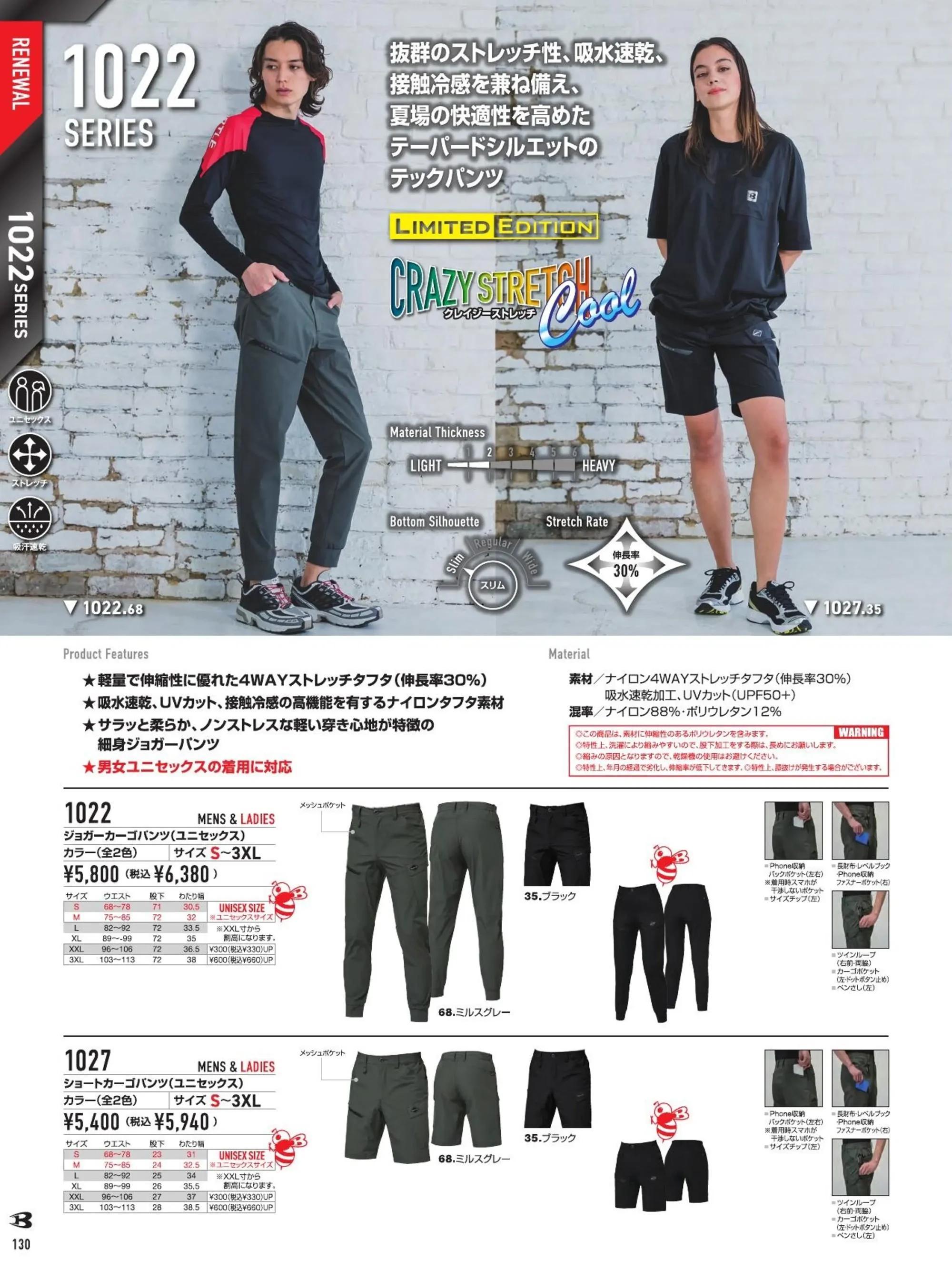 【リミテッドモデル(数量限定生産品)】高いストレッチ性と吸水速乾性を兼ね備えたCRAZY STRETCH Coolシリーズのショートカーゴパンツです。4WAYストレッチタフタ素材を採用し、伸長率30%の優れた伸縮性を実現。接触冷感とUVカット機能により、夏場の作業やアウトドアシーンでも涼しく快適な穿き心地を提供します。軽快な丈感とすっきりしたシルエットで、動きやすさと実用性を両立した一本です。