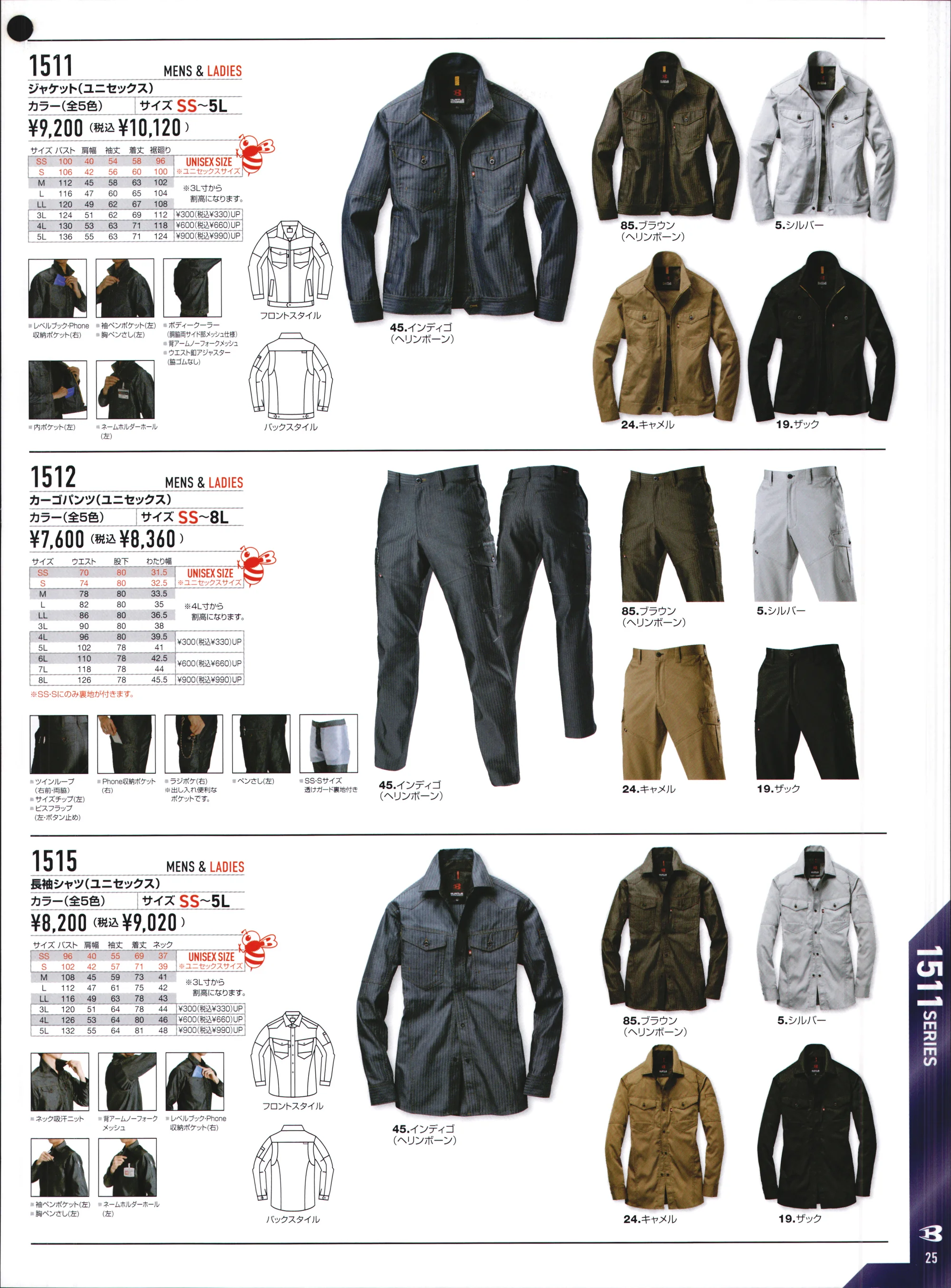 | 形状特長 | 野帳ダブル収納ポケット(右・深さ20cm)・携帯電話収納ループ(右胸)・背アームノーフォークメッシュ・左胸ペンさし・左袖ペンポケット・ネームホルダーホール(左)・内ポケット(左)・胴脇両サイド部メッシュ仕様・ウエスト釦アジャスター(脇ゴムなし) |