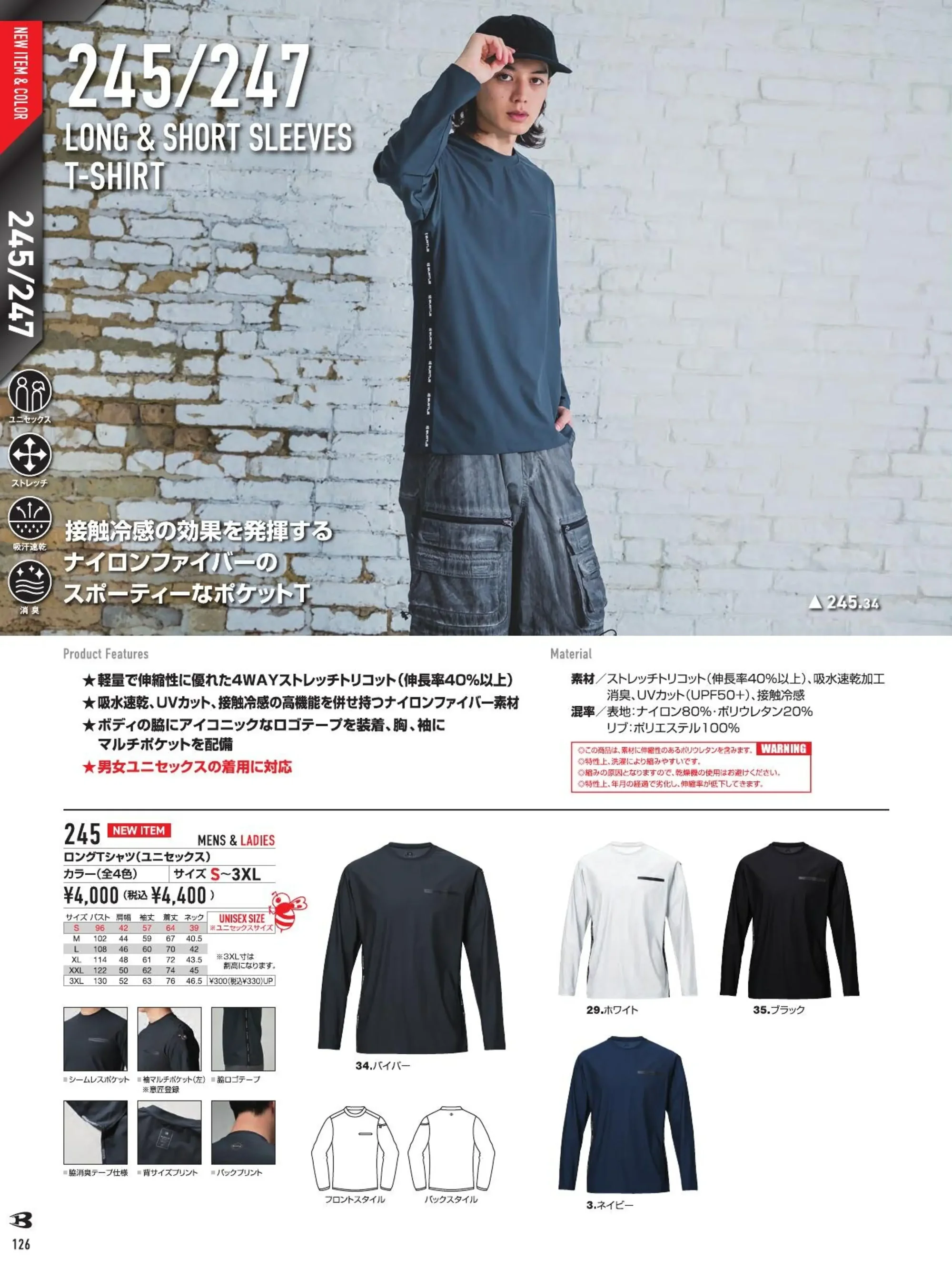 | 素材特長 | 4WAYストレッチ(伸長率40%以上) 吸水速乾 消臭 UVカットUPF50+ 接触冷感 |