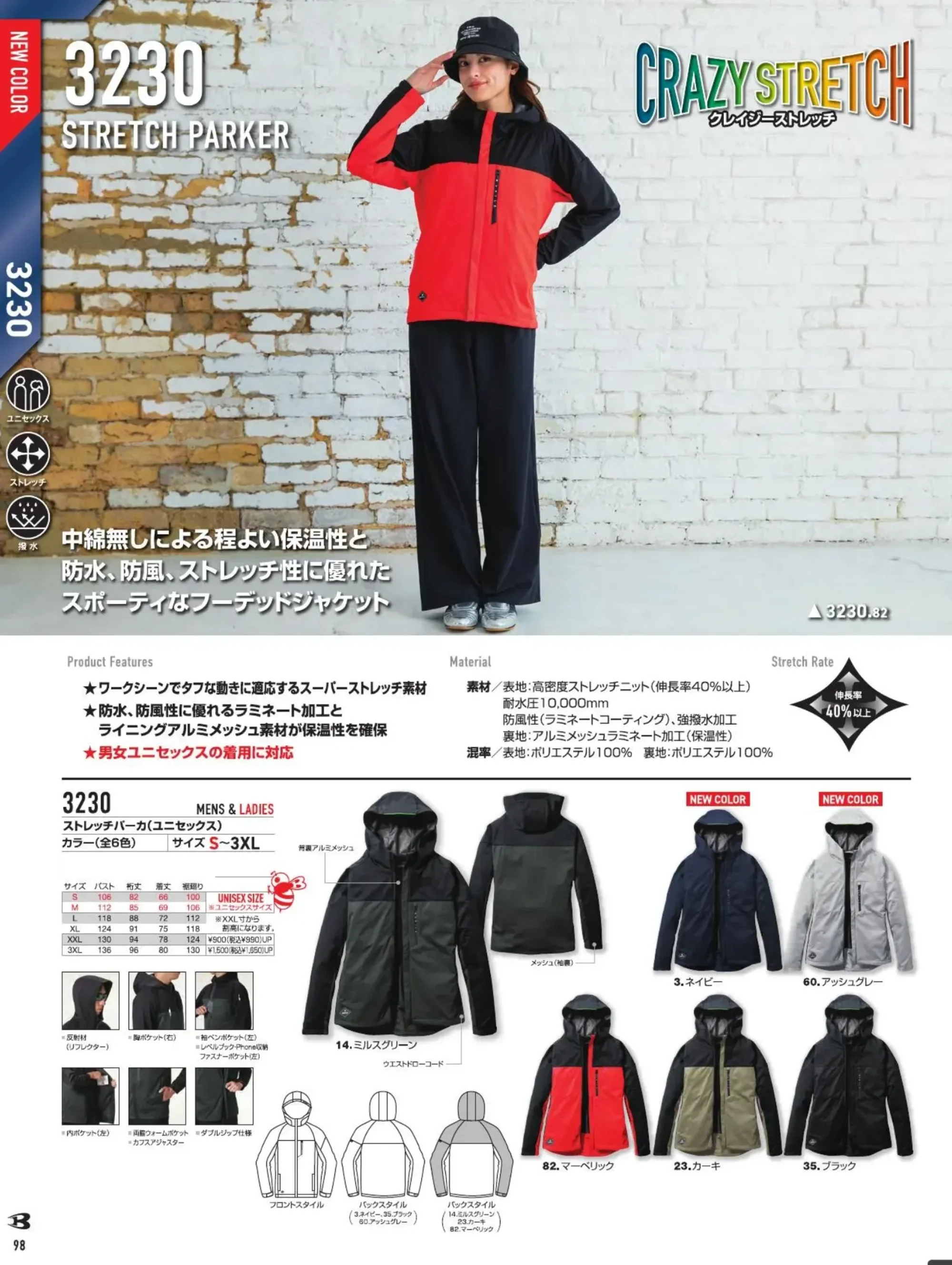 使用素材 | 表地/マイクロソフトシェル 強撥水加工 防風ラミネート加工 耐水圧10,000mm 裏地/ホットメッシュ(保温性) 表地/ポリエステル100% 裏地/ポリエステル100% |