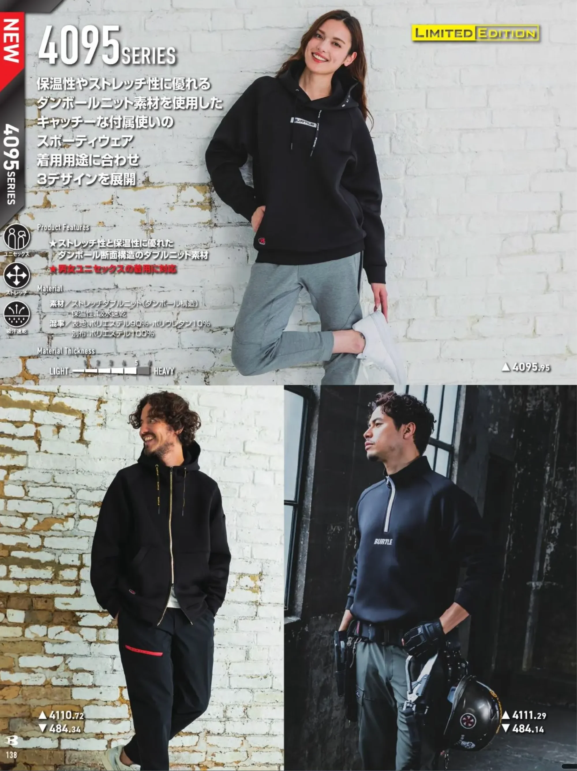 保温性とストレッチ性に優れたダンボールニット素材を使用したスポーティなフード付きパーカーです。4095シリーズは着用シーンに合わせた3デザインを展開し、キャッチーな配色とスポーティなデザインで普段使いから軽作業まで幅広く活躍します。男女兼用のユニセックスサイズで、M~XXLまで豊富なサイズ展開を実現しました。