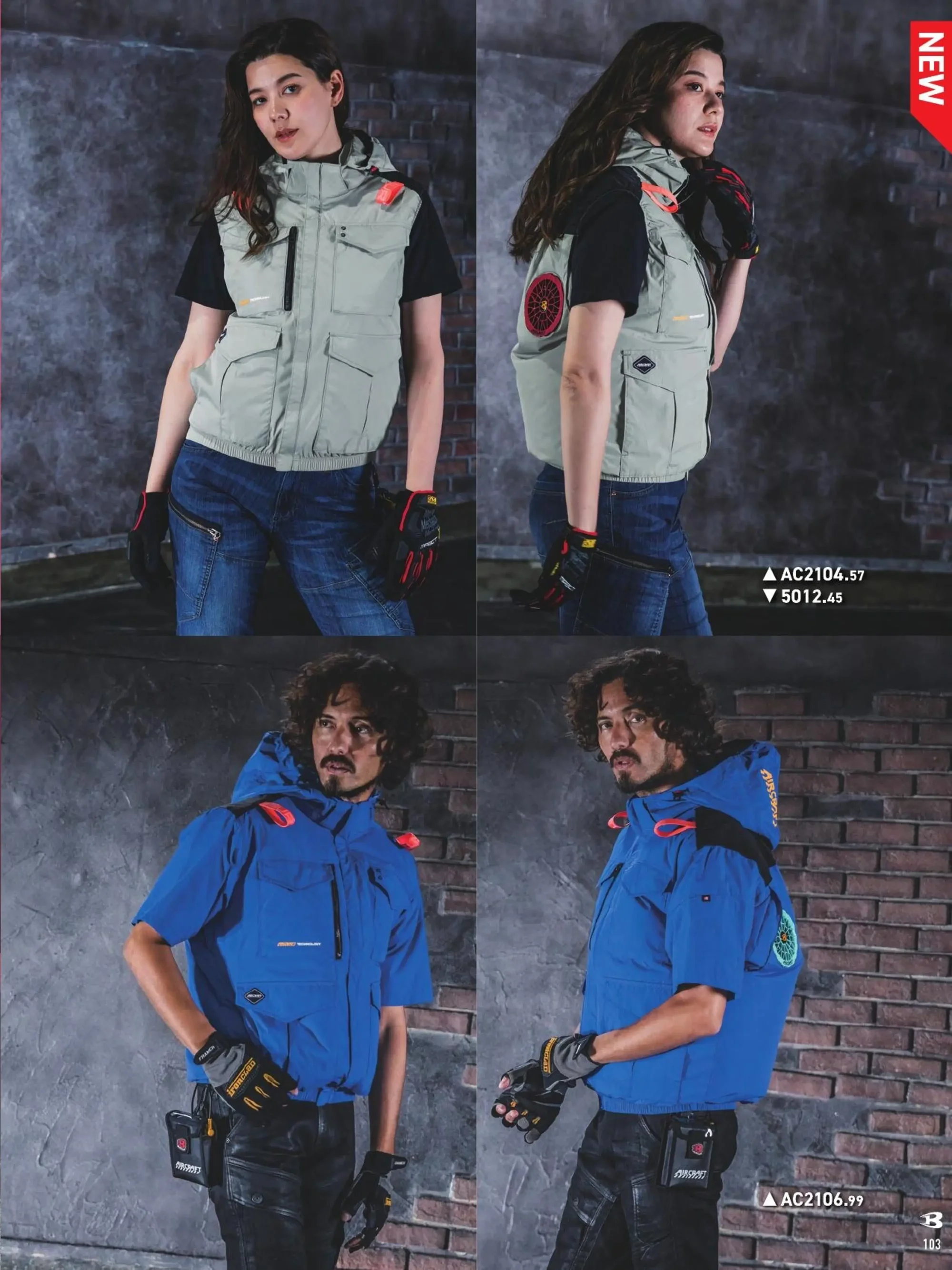 | 形状特長 | ハイバックファン取付設計 ヘルメット対応着脱式フード(前後スピンドル付き・ボタン止め着脱仕様) フックハンガー ランヤードホール 保冷剤収納通気エアダクトポケット ペンポケット(胸) バッテリー収納ポケット コードホール 両脇ポケット |