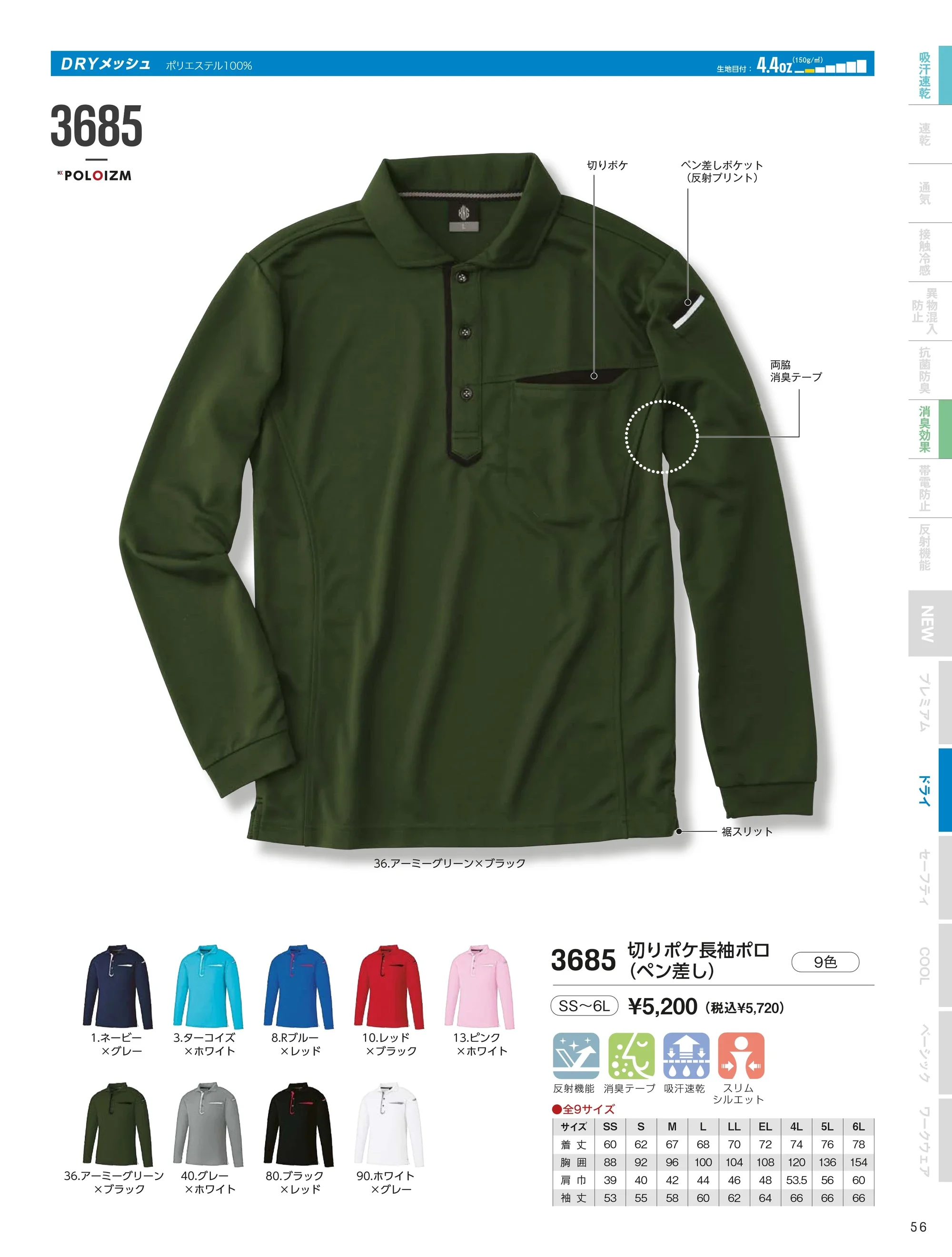 | 形状特長 | ビビッドカラーのアクセント、脇消臭テープ、ペン差しポケット付き(反射プリント)、切りポケット付き、スリット ※SS・Sサイズはレディースシルエットです。 ※M~ELサイズはスリムシルエットです。 |