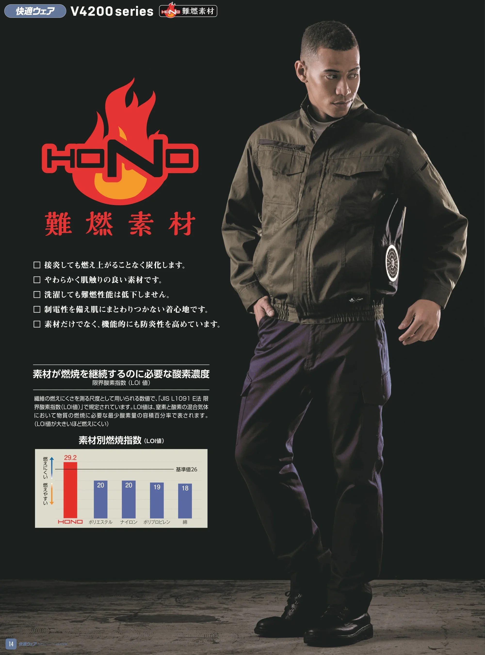 難燃素材を採用したサイドファン仕様の長袖ブルゾン。燃え広がりにくい特性と高い耐熱性により火気を扱う現場でも安心して着用可能。綿100%のやさしい肌触りと優れた制電性により快適性と安全性を両立し過酷な作業環境をサポートします。