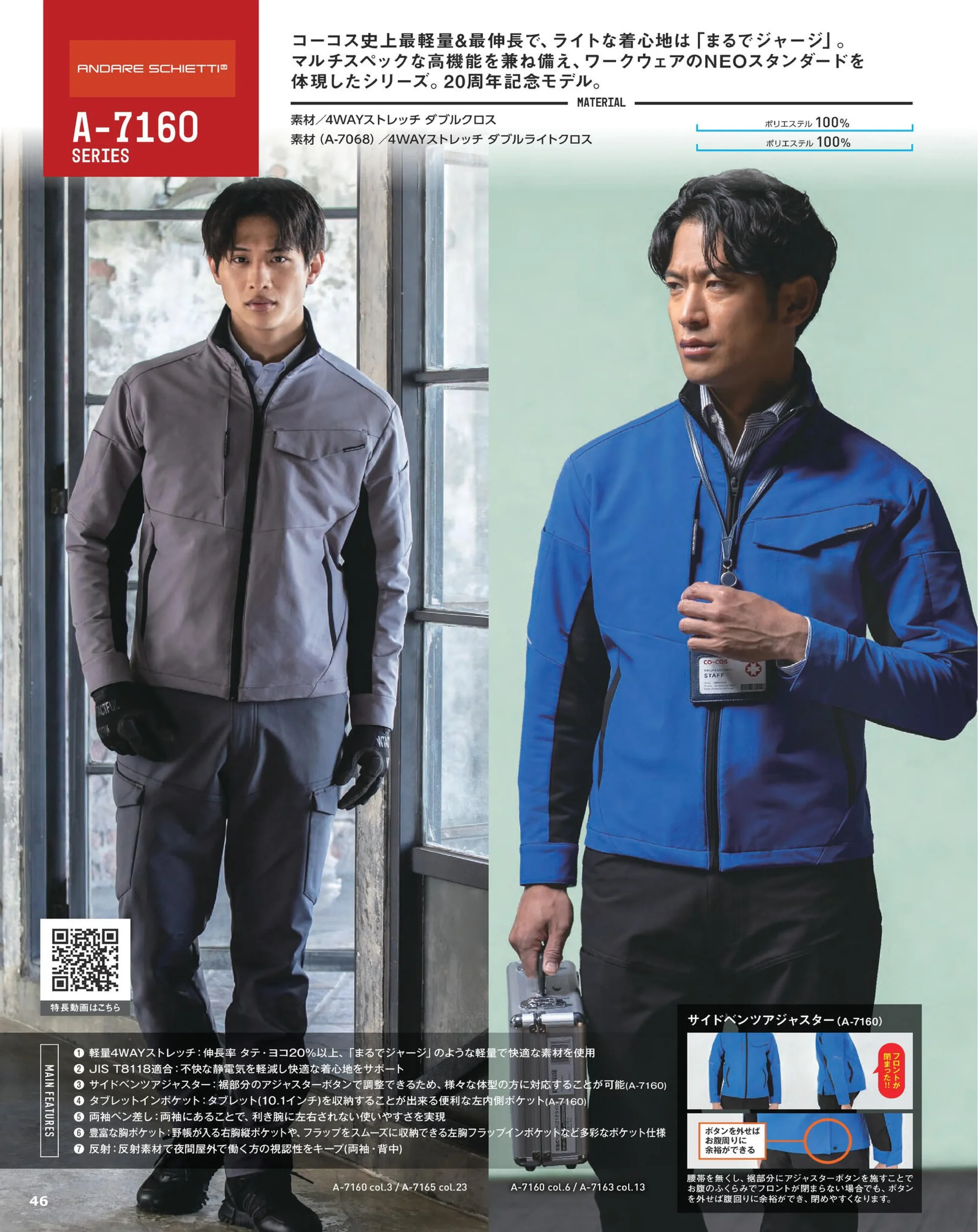 コーコス史上最軽量&最伸長で、ライトな着心地は「まるでジャージ」。マルチスペックな高機能を兼ね備え、ワークウェアのNEOスタンダードを体現したシリーズ。