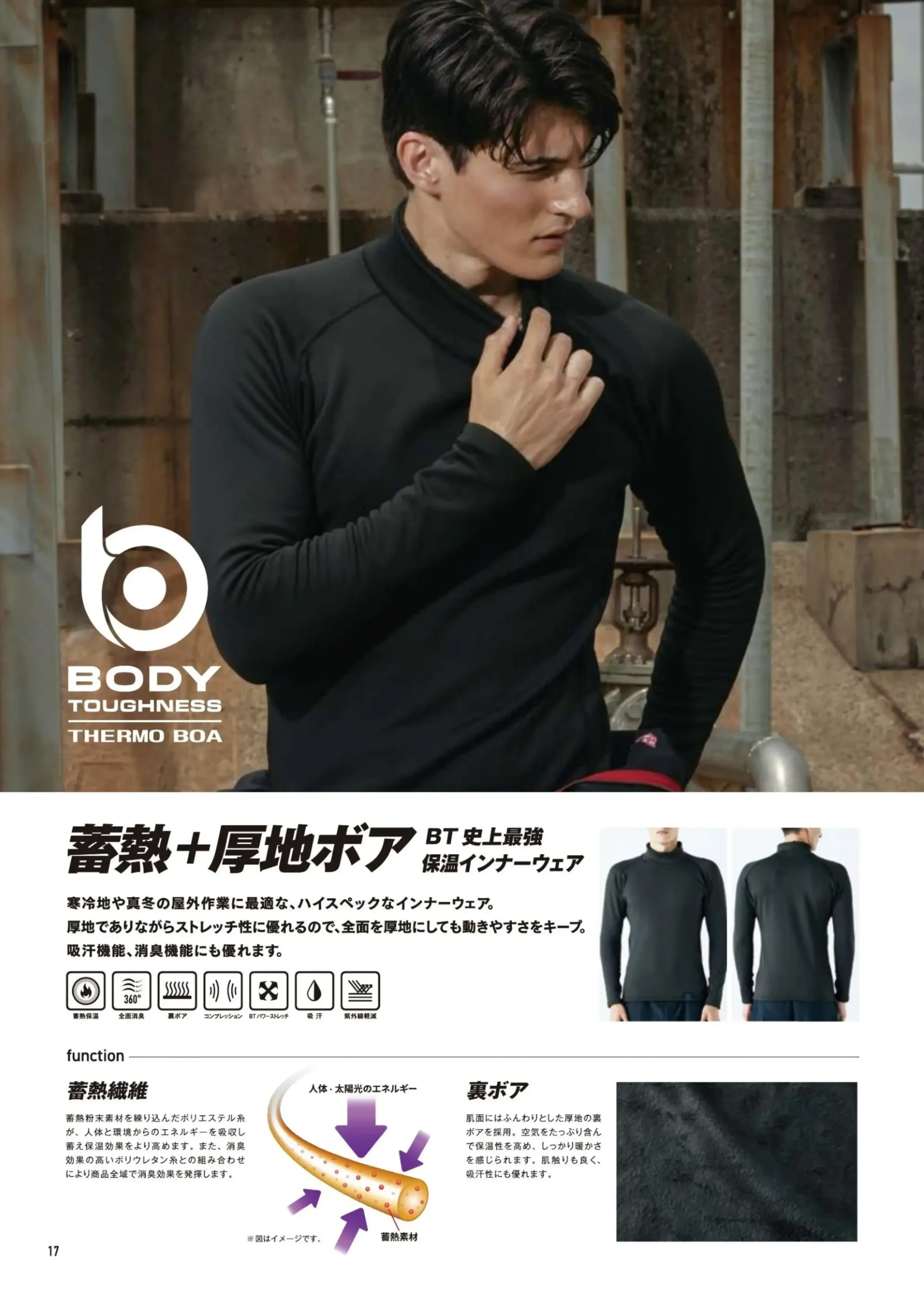おたふく手袋 BODY TOUGHNESS(ボディタフネス)が誇る、BT史上最強の蓄熱×厚地ボア構造を搭載した真冬用インナータイツ。肌面にふんわりとした裏ボア起毛を採用し、優れた保温力と柔らかな肌ざわりを実現。さらに蓄熱繊維が人体や太陽光のエネルギーを熱に変換し、長時間の屋外作業でもぬくもりをキープします。厚地ながらストレッチ性が高く、動きやすさにも優れたハイスペックモデルです。
