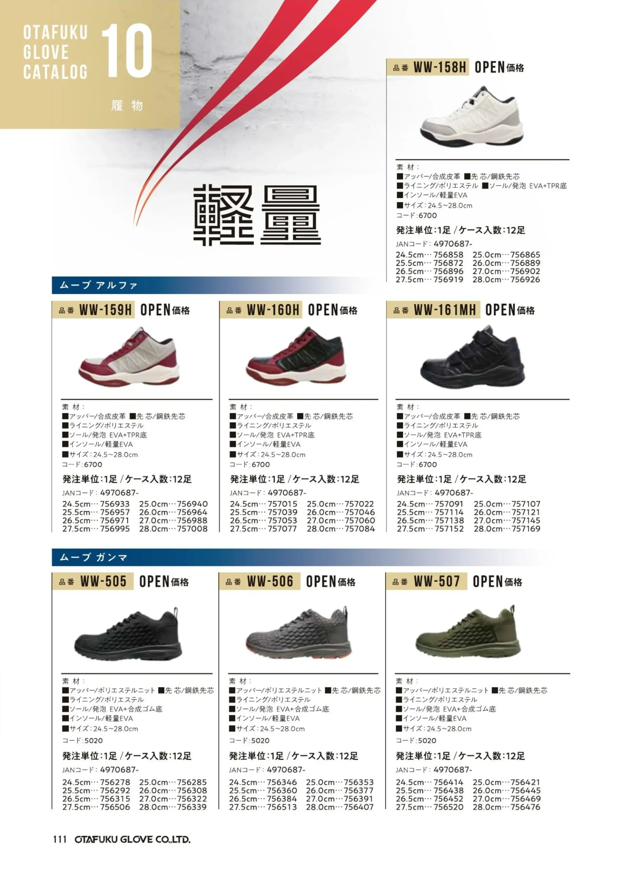 軽量で柔軟性に優れた設計のムーブ ガンマ WW-505。快適な履き心地と高い安全性を両立し、長時間の作業でも疲れにくい構造です。アッパーには通気性のあるポリエステルニットを使用し、発泡EVA+合成ゴム底のソールが優れたクッション性とグリップ力を発揮。鋼鉄先芯を搭載し、足先の安全を確保しながらも軽快な動きをサポートします。