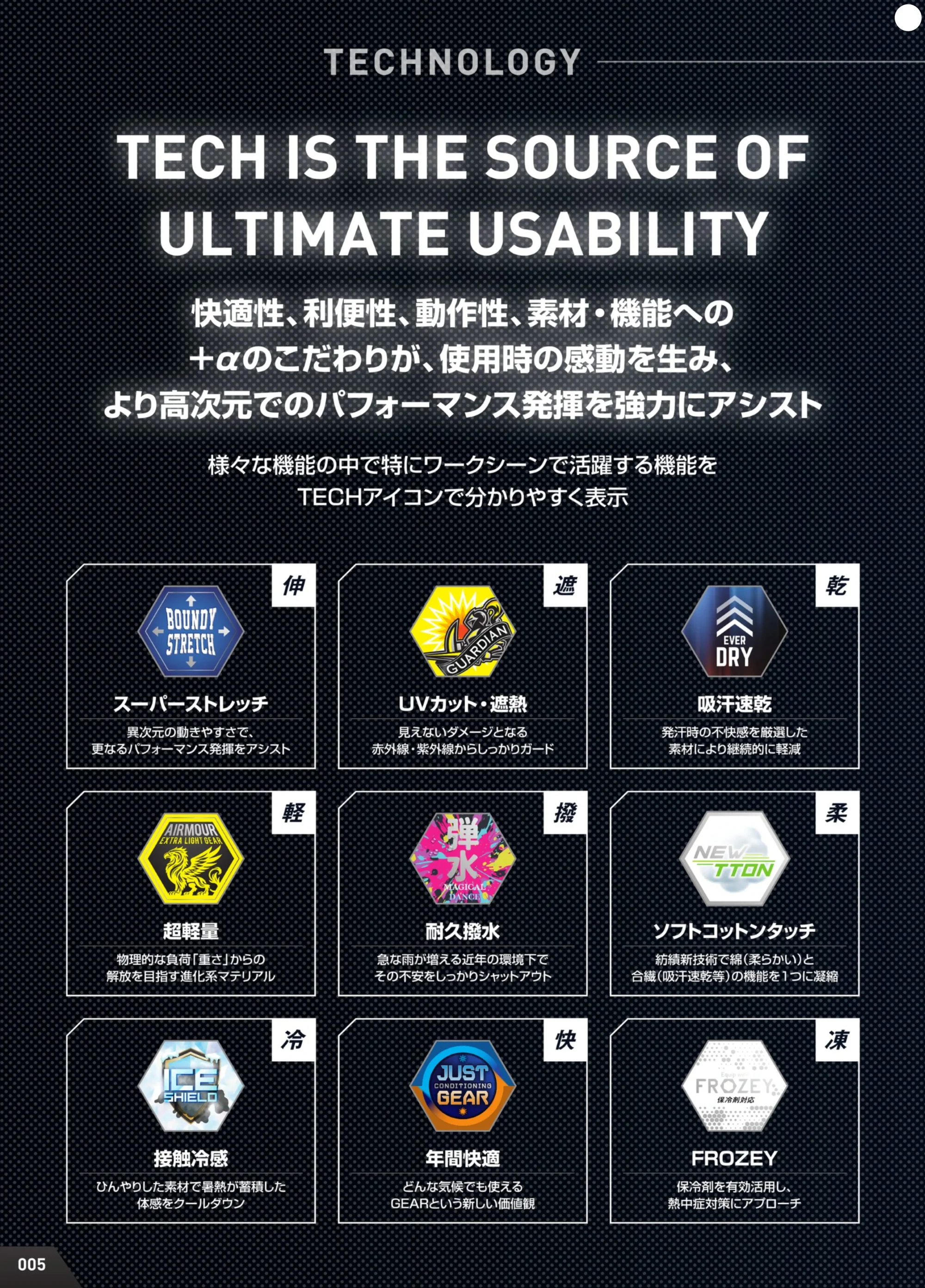 | 素材特長 | 軽量 遮熱(S35) UVカット(UPF50+) 風抜け防止加工 吸汗速乾 |