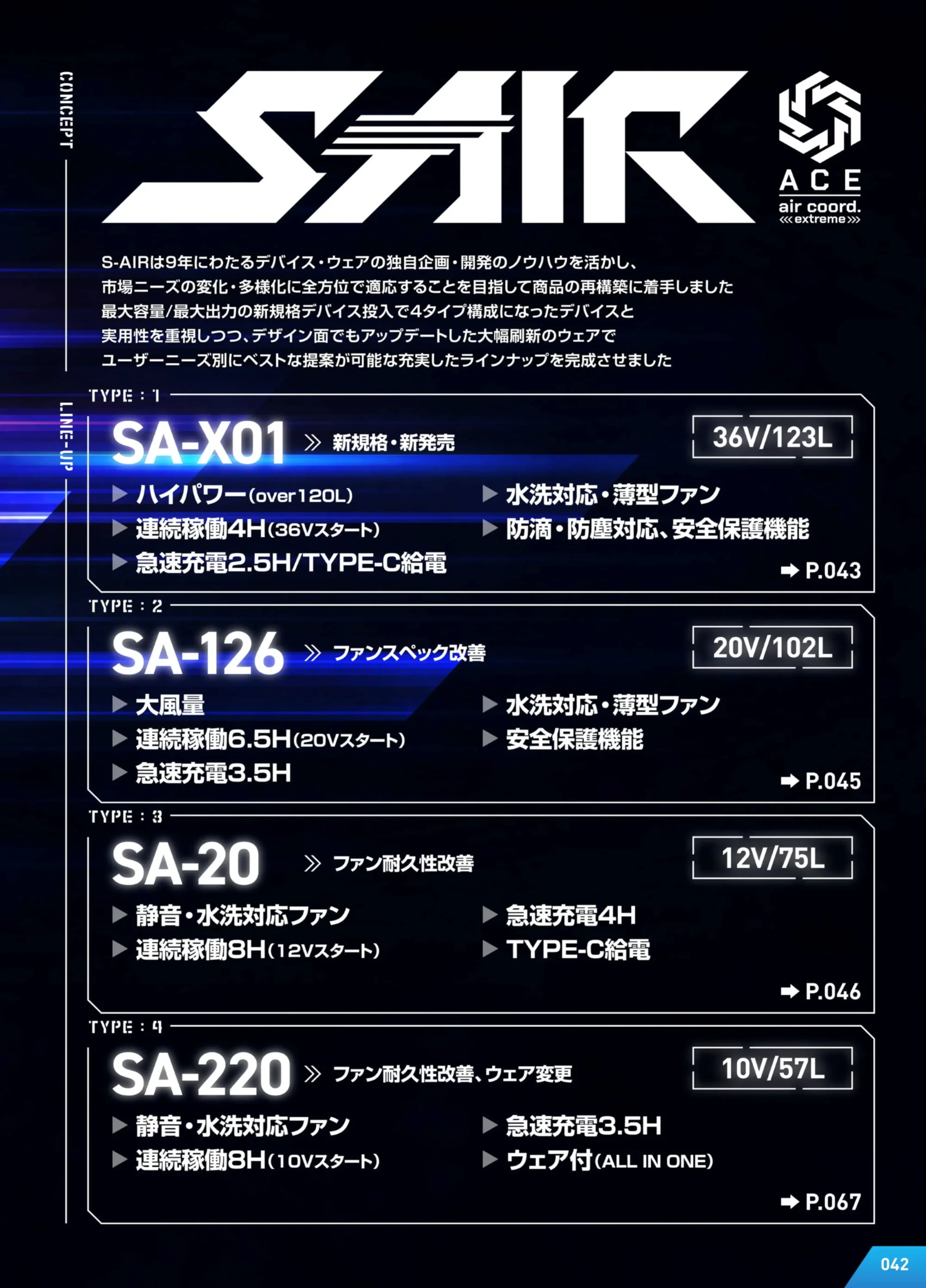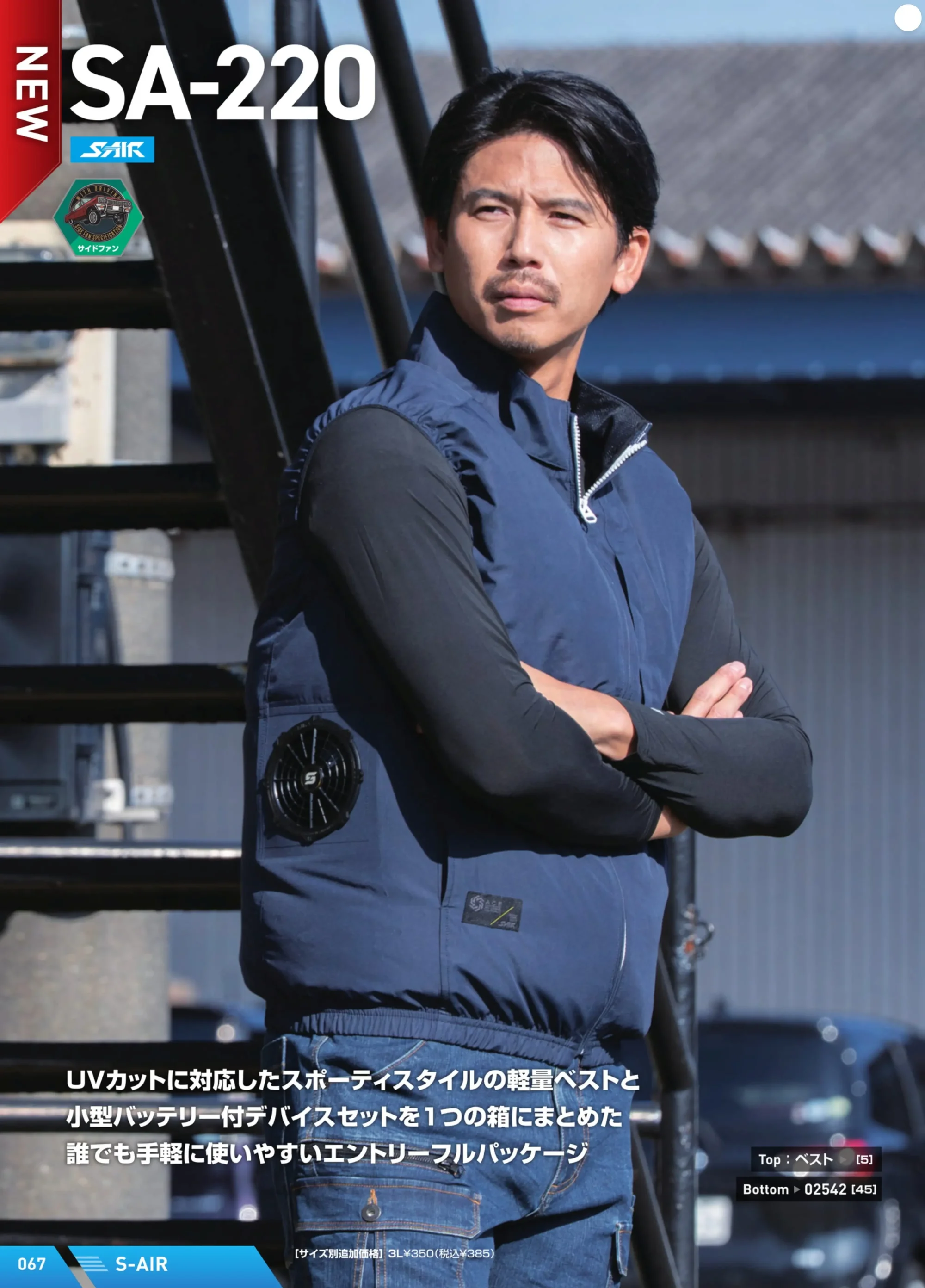 UVカット対応の軽量ベストと小型バッテリー付きファンデバイスを1箱にまとめたS-AIR CASUALのエントリーパッケージ。ポリエステル100%素材にUPF50+と遮熱S35機能を備え、首元全体から風を抜くワイドネック設計で快適な着用感を実現。初めての空調ウェア導入にも最適なセットモデルです。