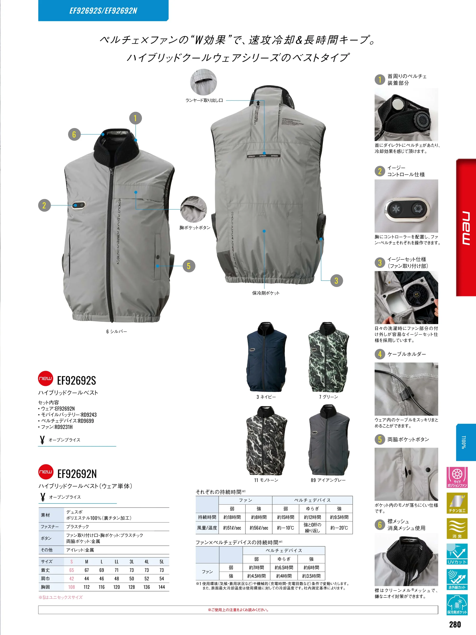サイドファン・胸部分コントローラー仕様・ケーブルホルダー・両脇ポケットボタン・左胸ポケット・保冷剤ポケット |