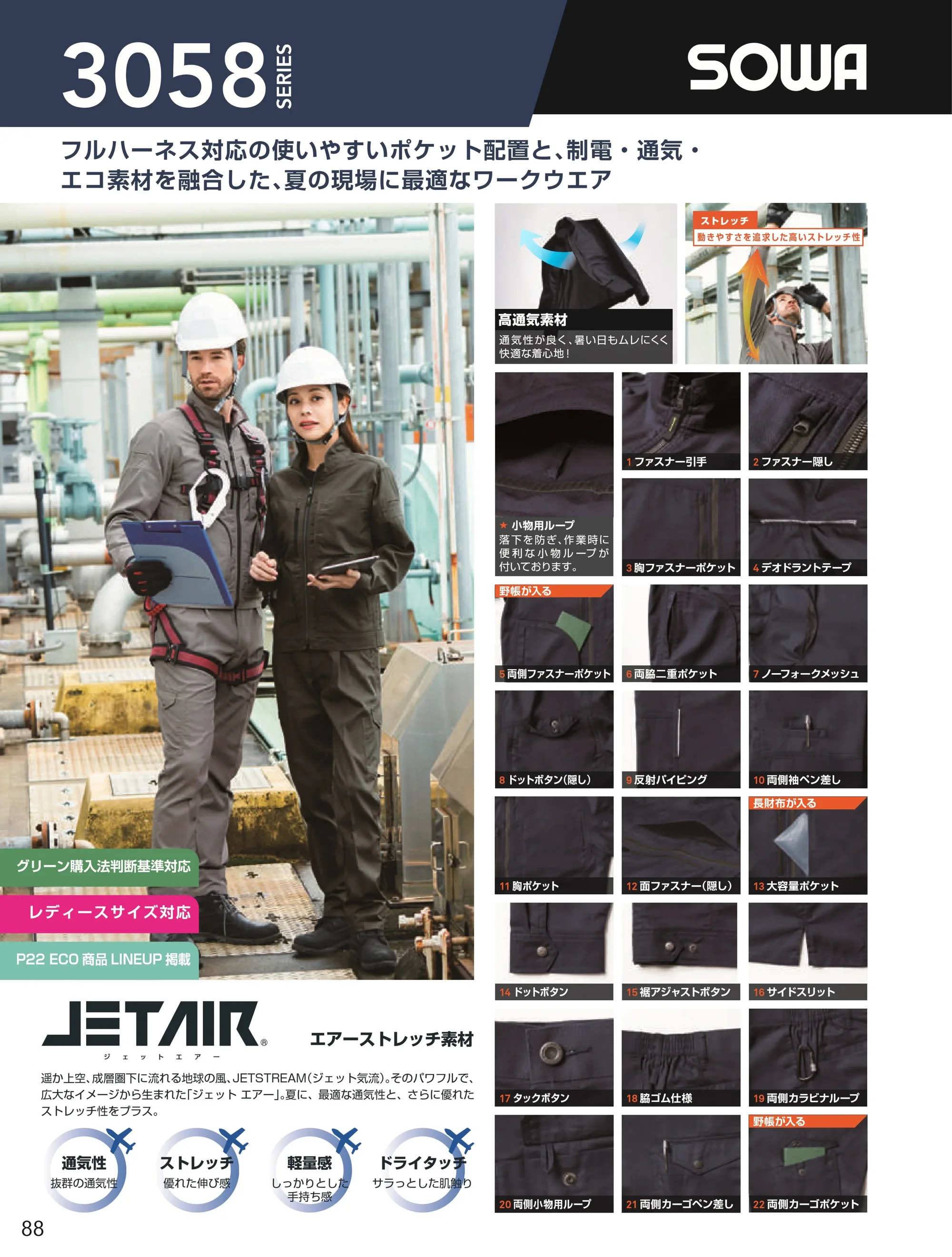フルハーネス対応の使いやすいポケット配置と優れた通気性を備えたSOWA 3058シリーズの長袖シャツ。JET AIRエアーストレッチ素材を採用し、高い通気性と軽量性に加え優れたストレッチ性を実現。制電機能や消臭機能も備え、夏の作業現場でも快適に着用できる高機能ワークシャツです。