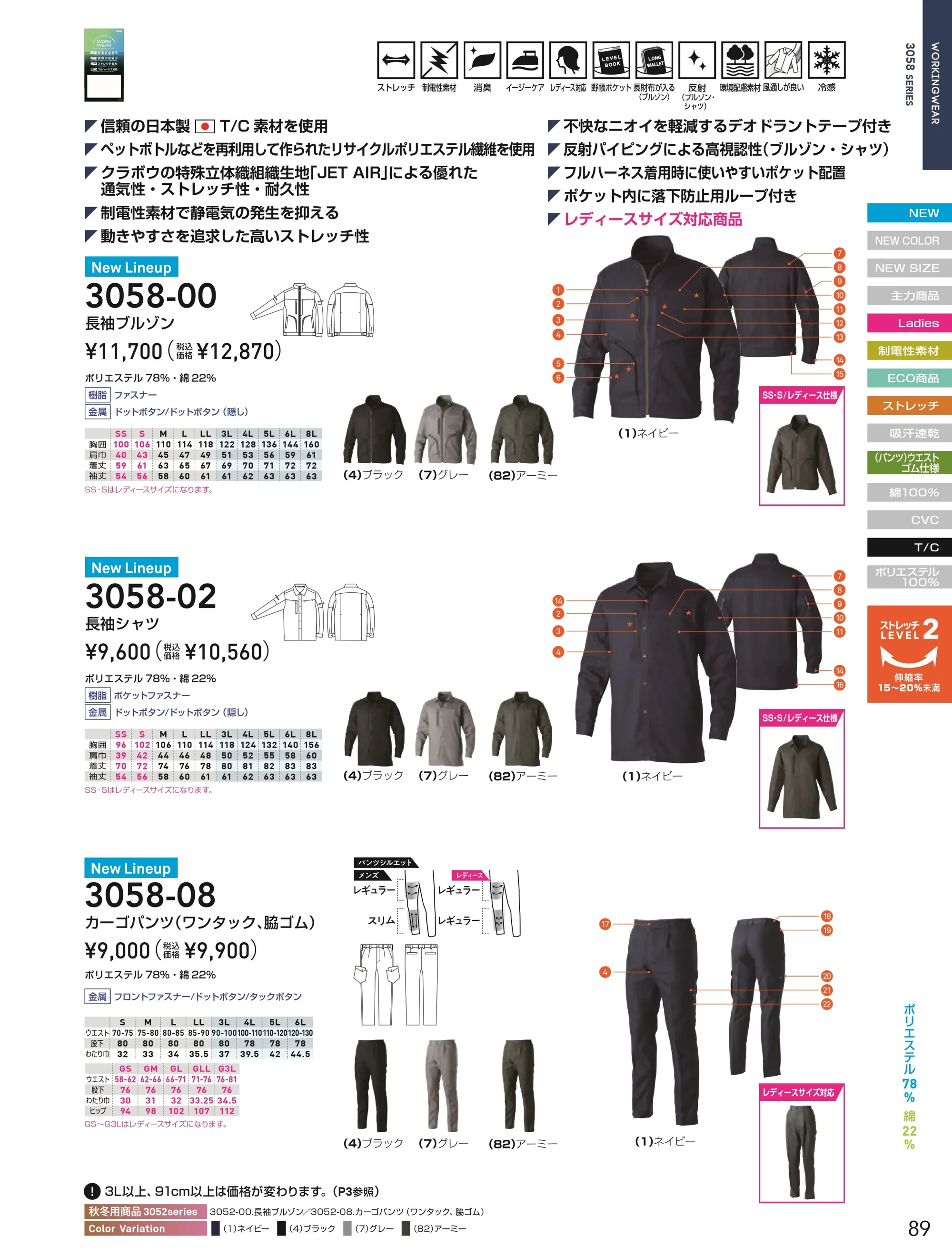 | 素材特長 | ストレッチ|通気性|冷感|ドライタッチ|軽量|耐久性|制電|消臭|イージーケア|日本製T/C素材|環境配慮素材 |