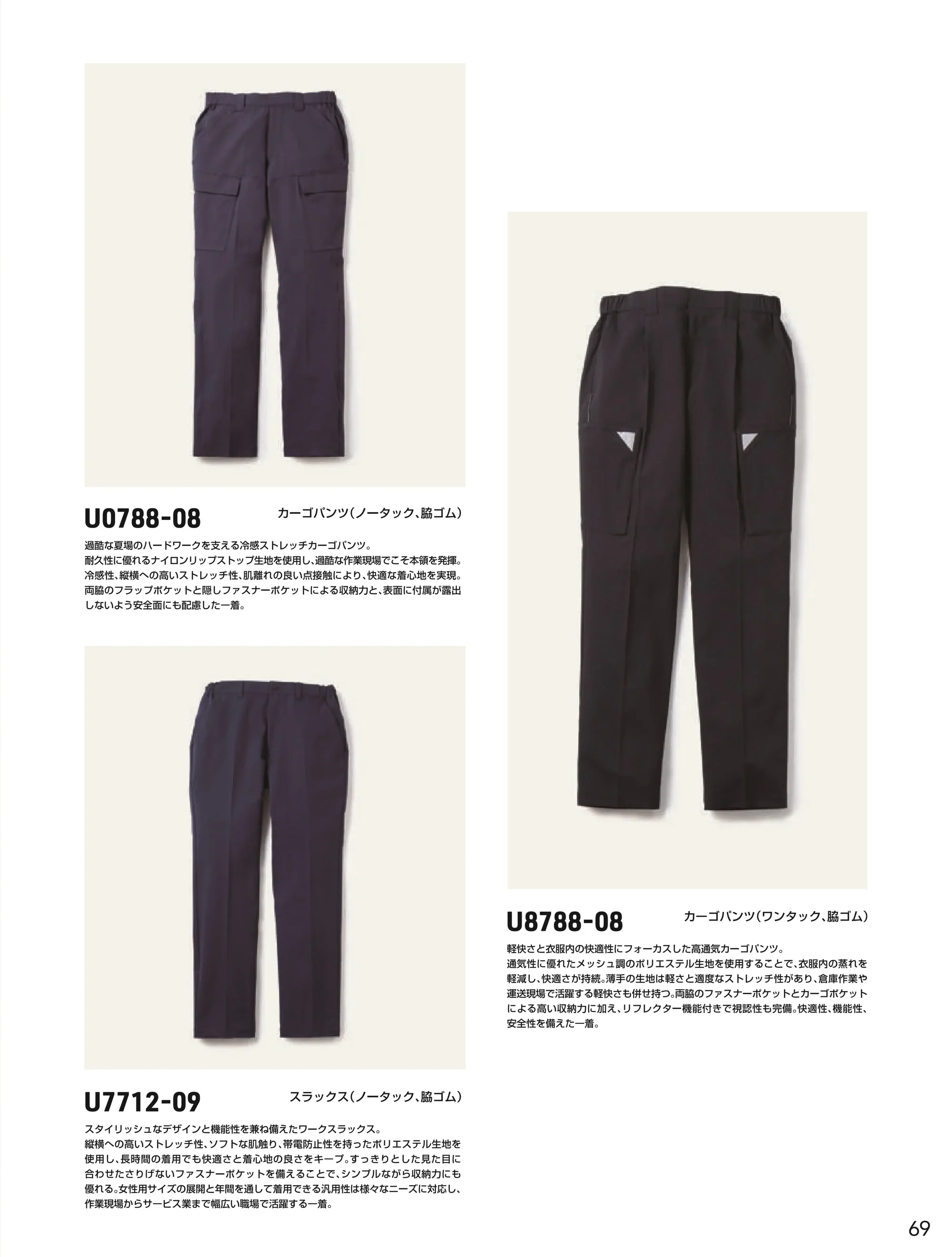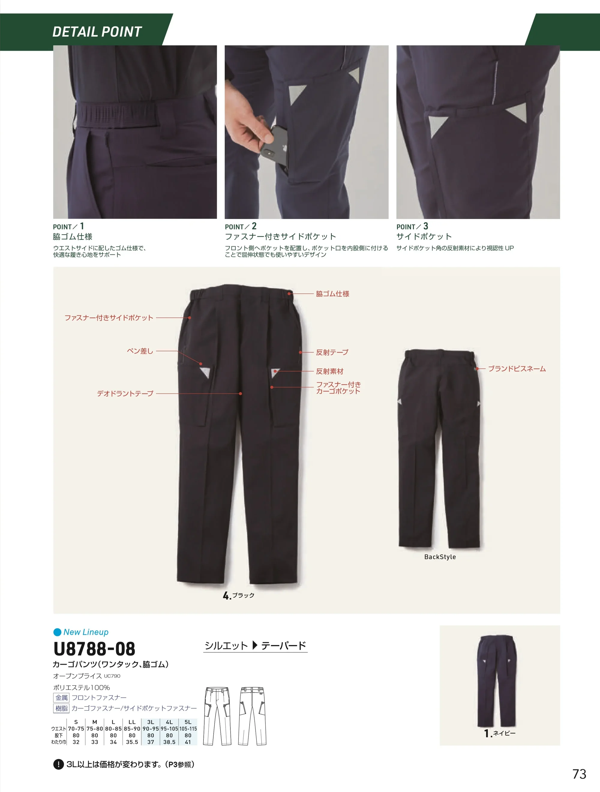 | 形状特長 | テーパードシルエット|ワンタック|脇ゴム仕様|ファスナー付きサイドポケット|ファスナー付きカーゴポケット|右脚部分ペン差し|反射素材|股部分デオドラントテープ|ブランドピスネーム |
