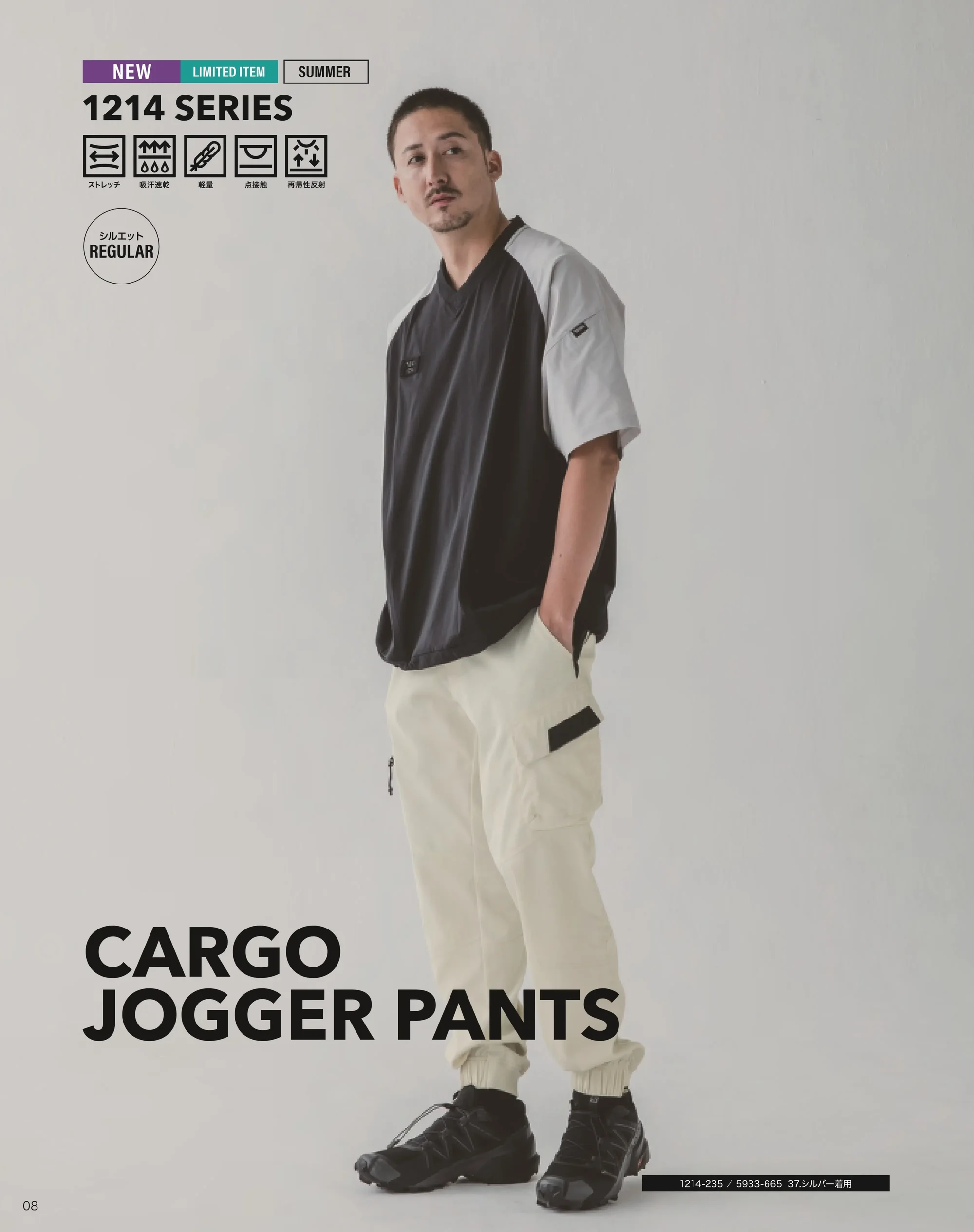 | 形状特長 | ジョガーパンツ 再帰性反射プリントピスネーム カーゴポケット 両脇ゴムシャーリング 裾ジョガー仕様 レギュラーシルエット |
