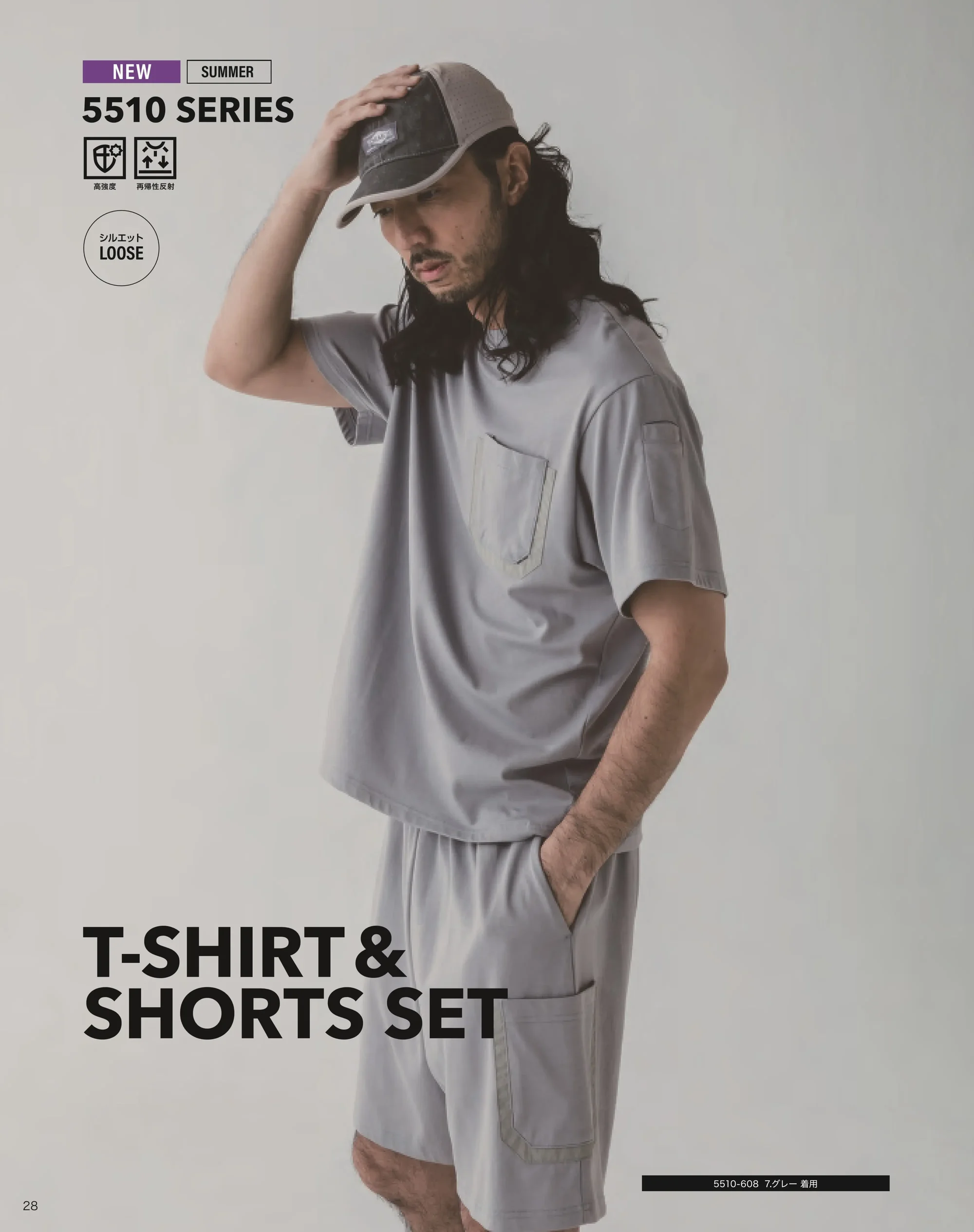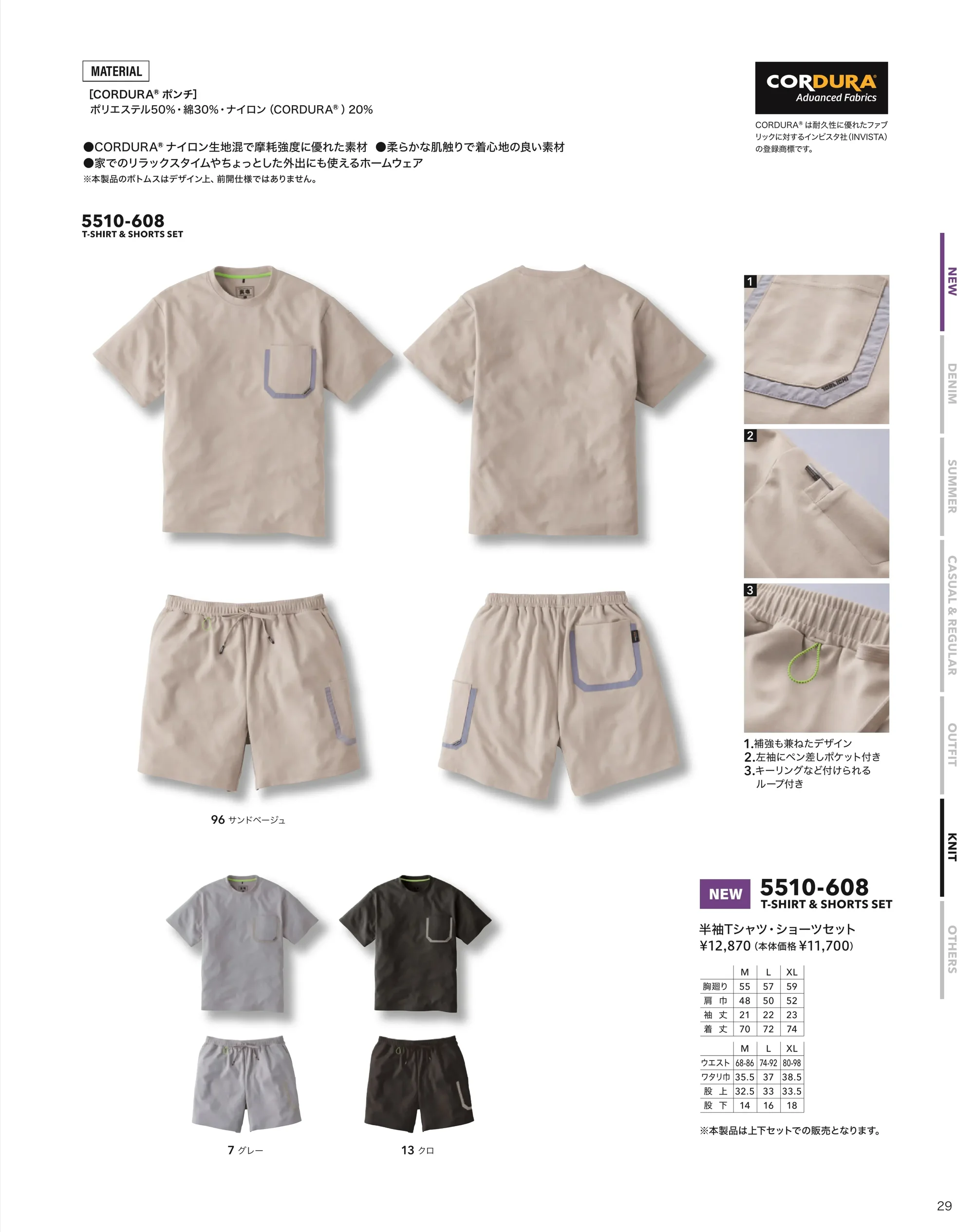 5510 SERIESの5510-608は、CORDURA®ナイロン生地混を使用した半袖Tシャツ・ショーツの上下セット。ポリエステル50%・綿30%・ナイロン20%配合で摩耗強度と柔らかな着心地を両立。ルームウェアからちょっとした外出まで活躍します。