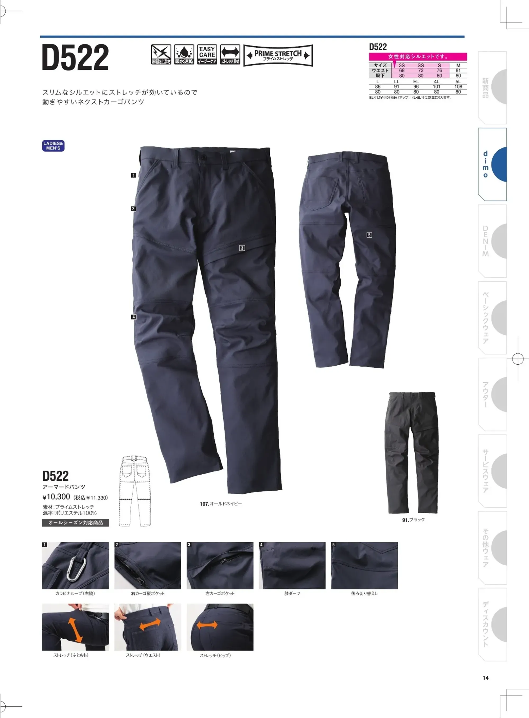 | 形状特長 | カラビナループ(右脇)、右カーゴ縦ポケット、左カーゴポケット、膝ダーツ、後ろ切替し |